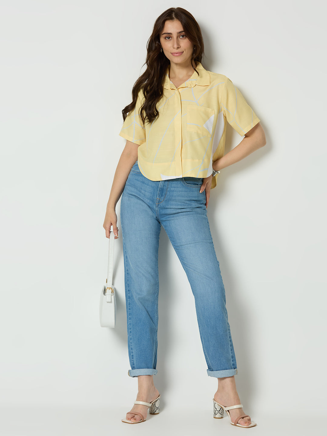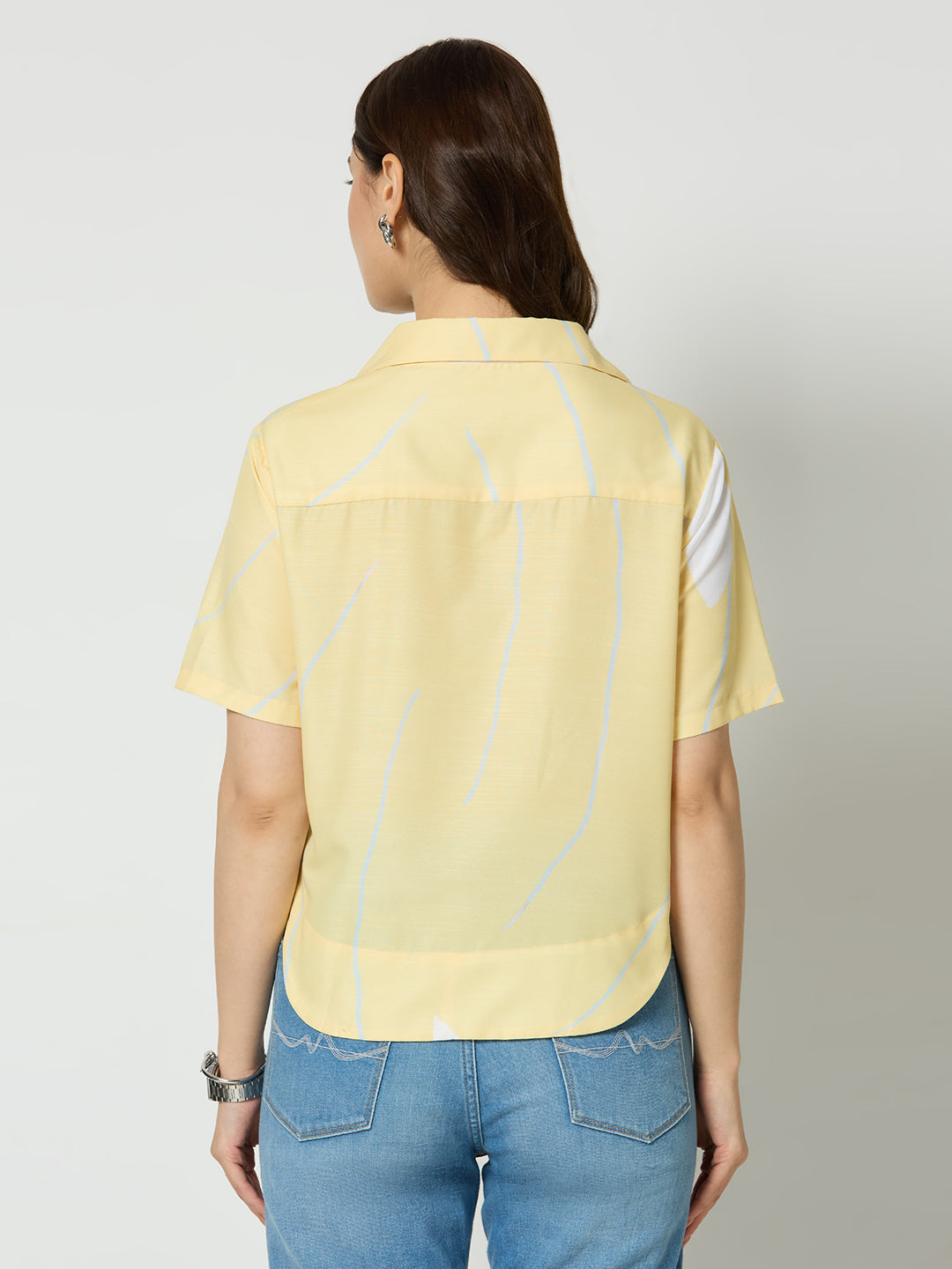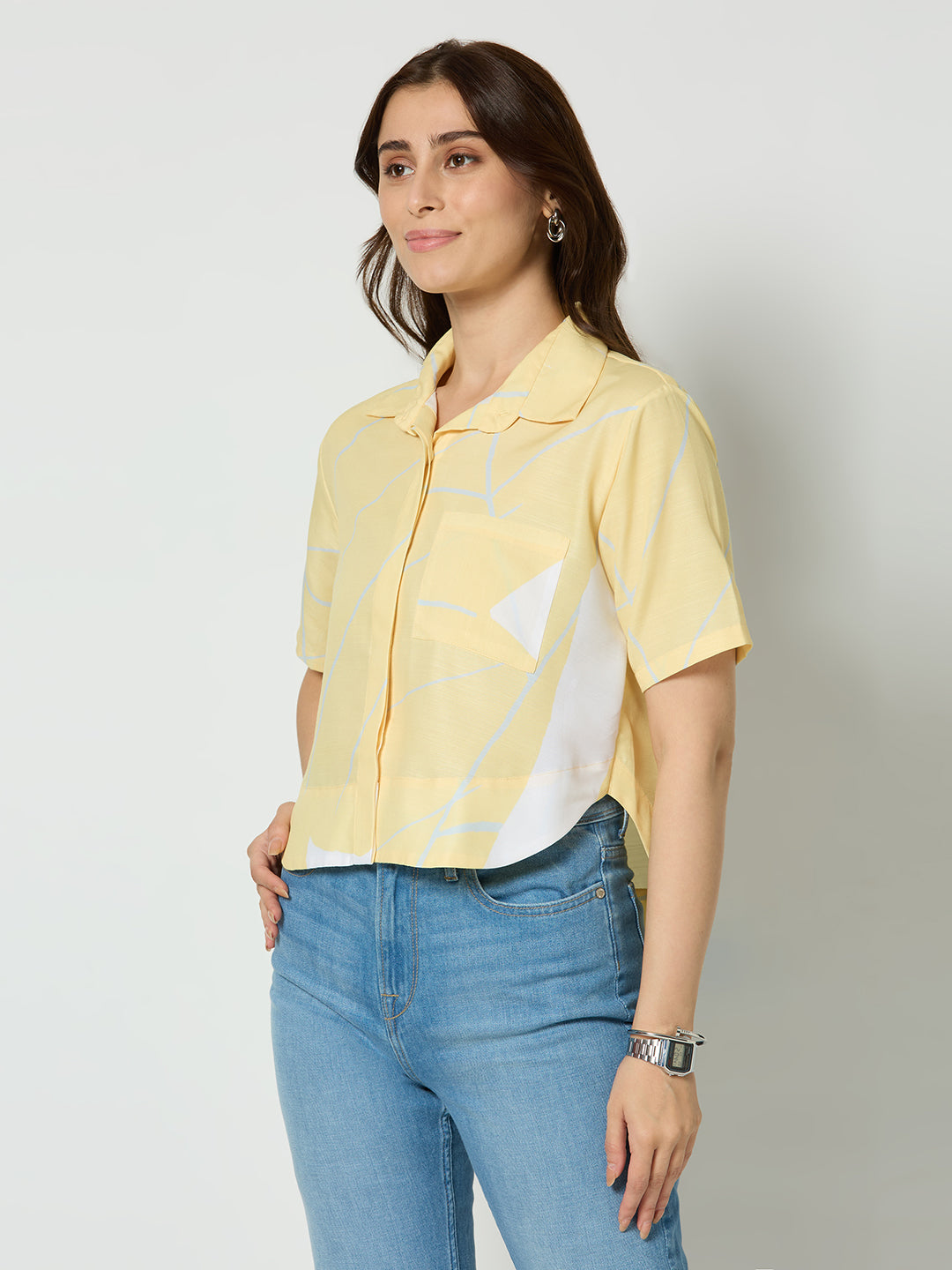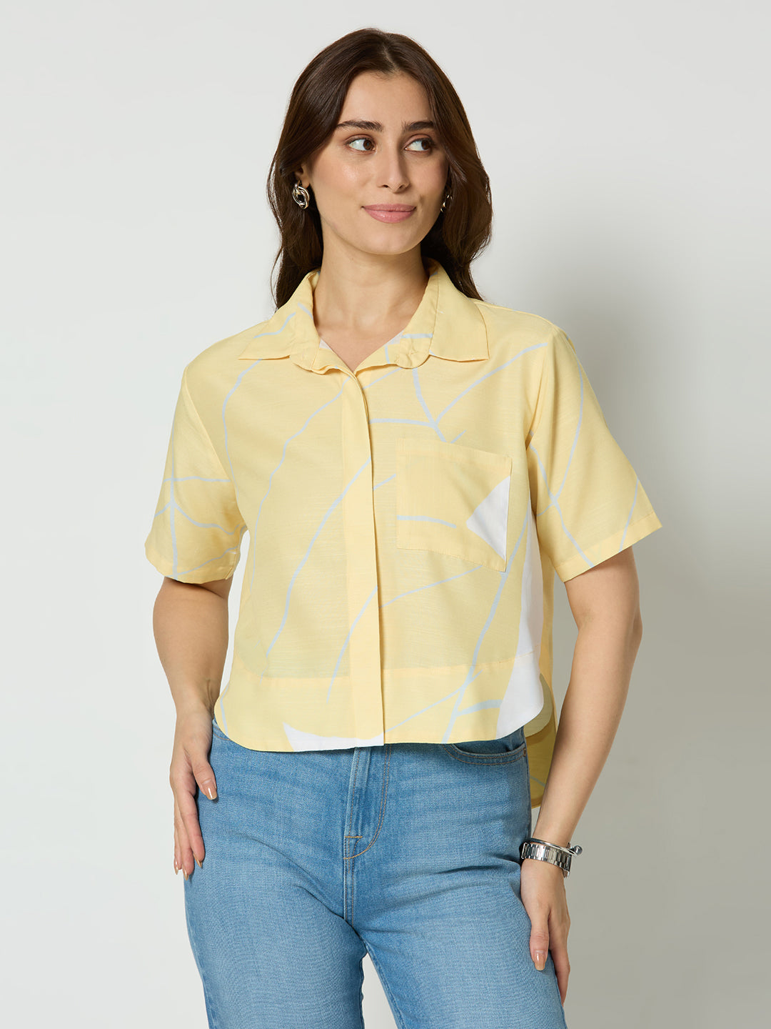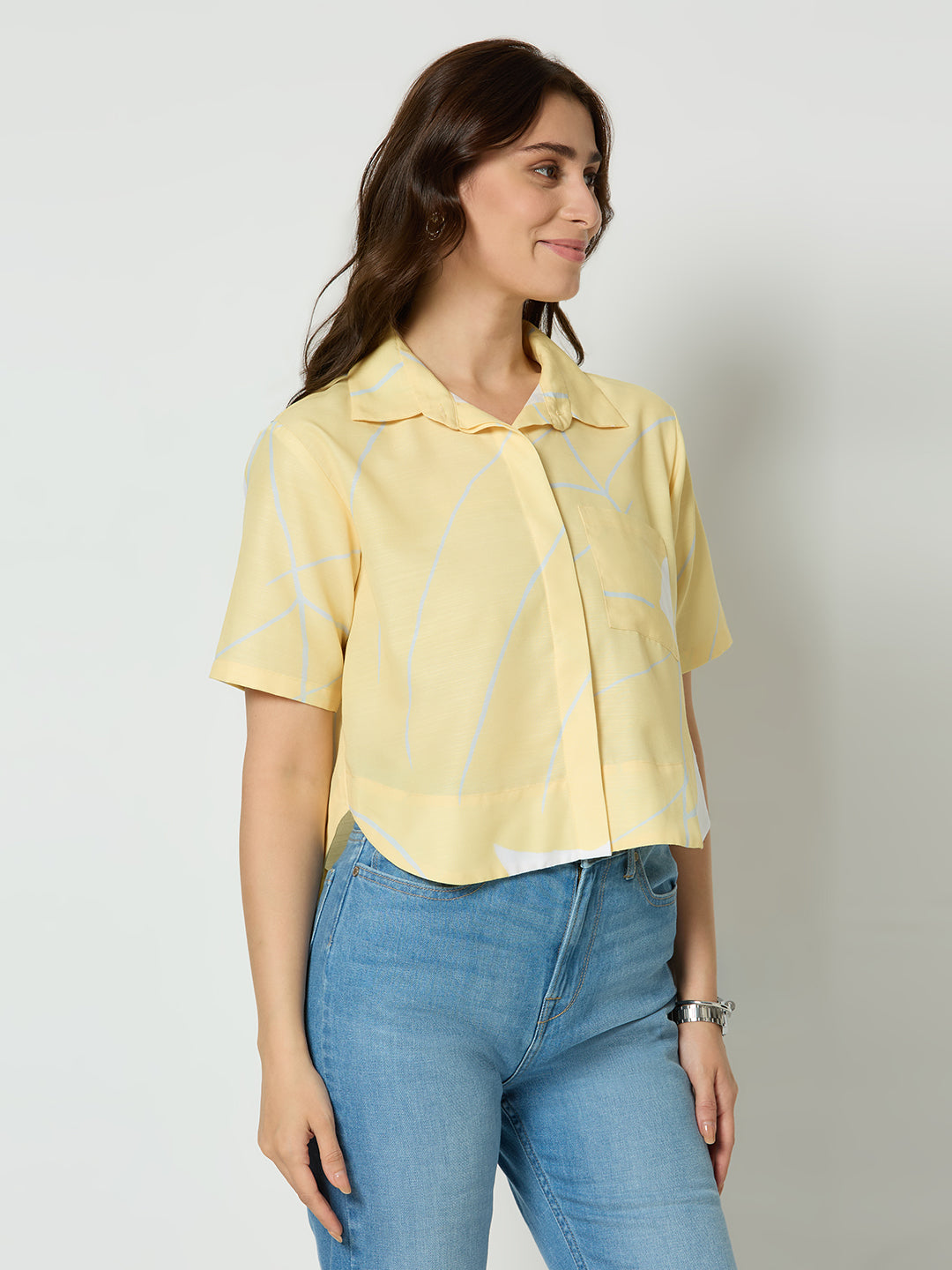YELLOW ABSTRACT PRINTED BUTTON DOWN CROPED SHIRT