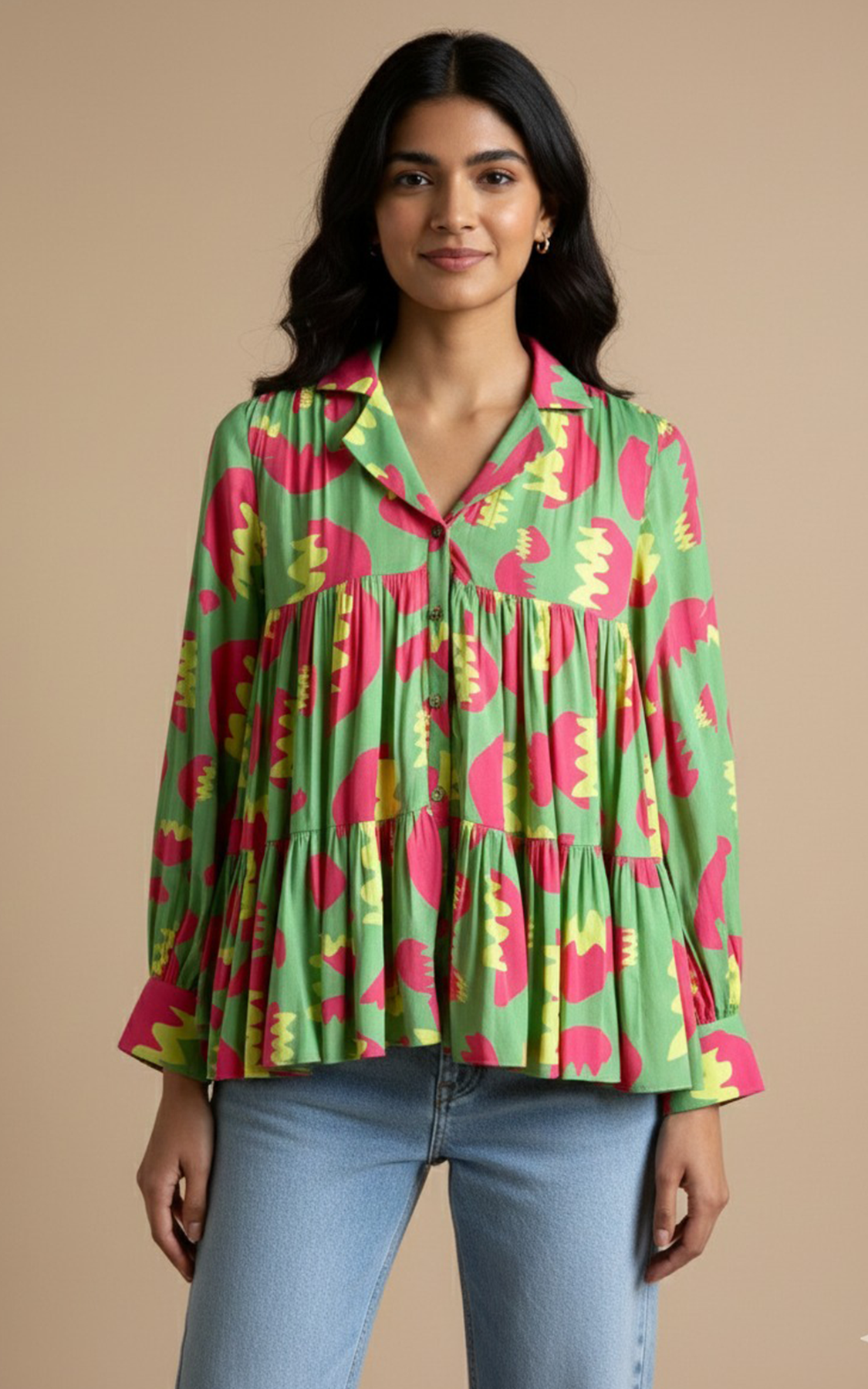 Multicolor abstract printed full sleeves shirt with tiered panels & a collared neckline.