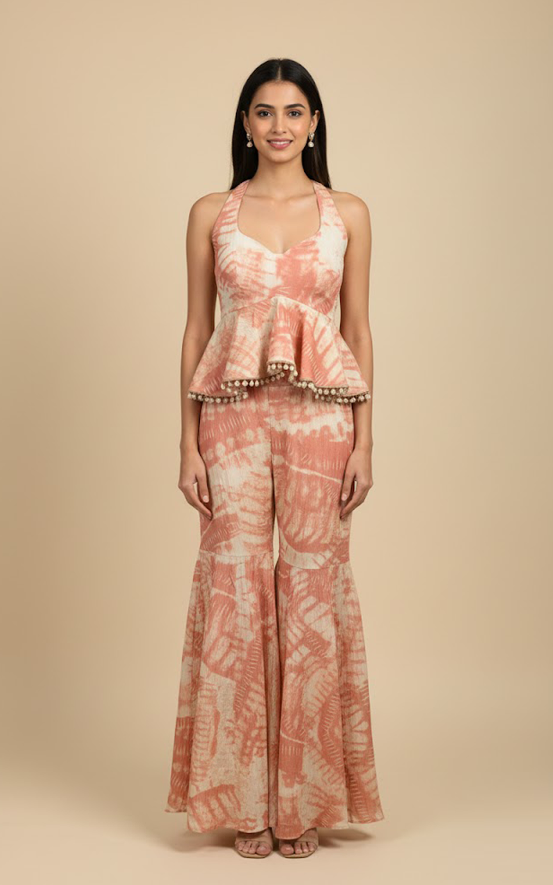 The mauve printed peplum top and pants set is a captivating combination of elegance and comfort. The top features a deep neckline and a fit and flare halter silhouette. Shell detailing is added on the hemline. The look is paired with mauve printed sharara pants.