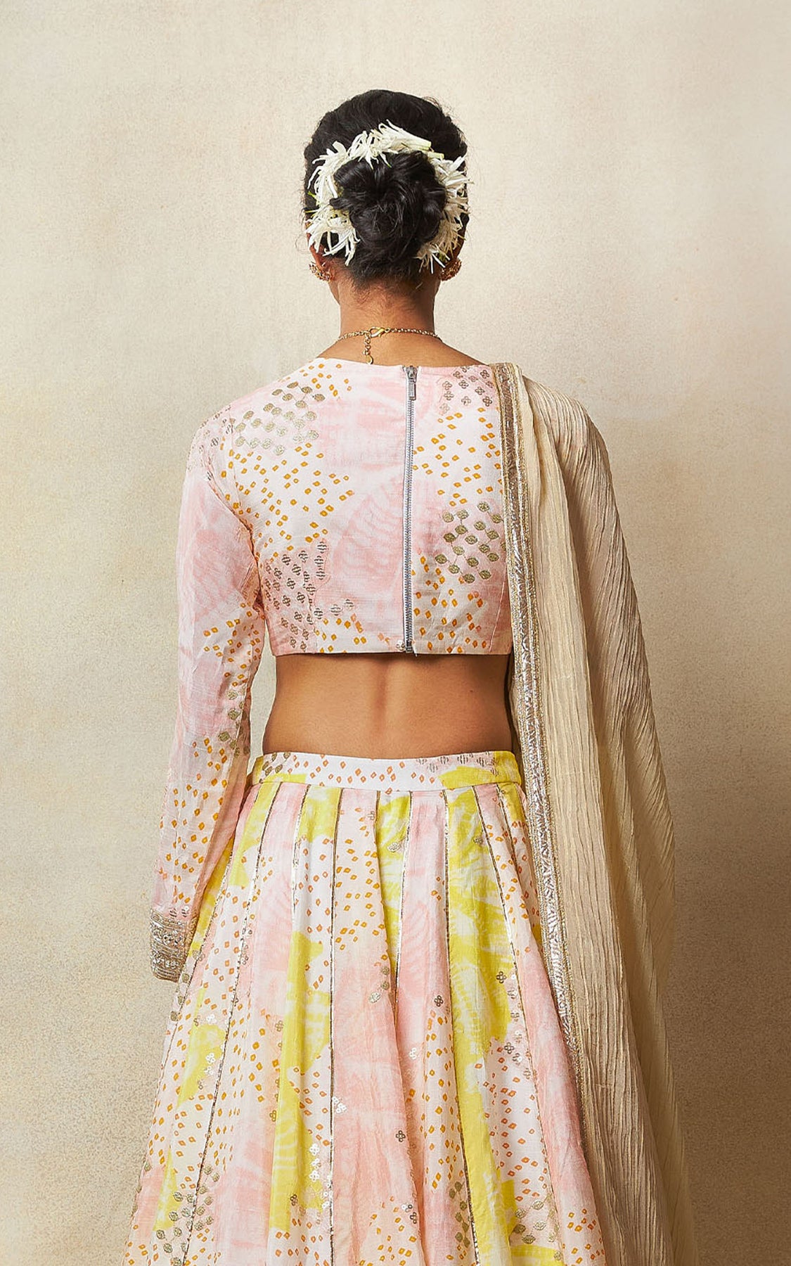 A full sleeve embroidered and printed bustier, with zari and mirror border detailing at the sleeve.