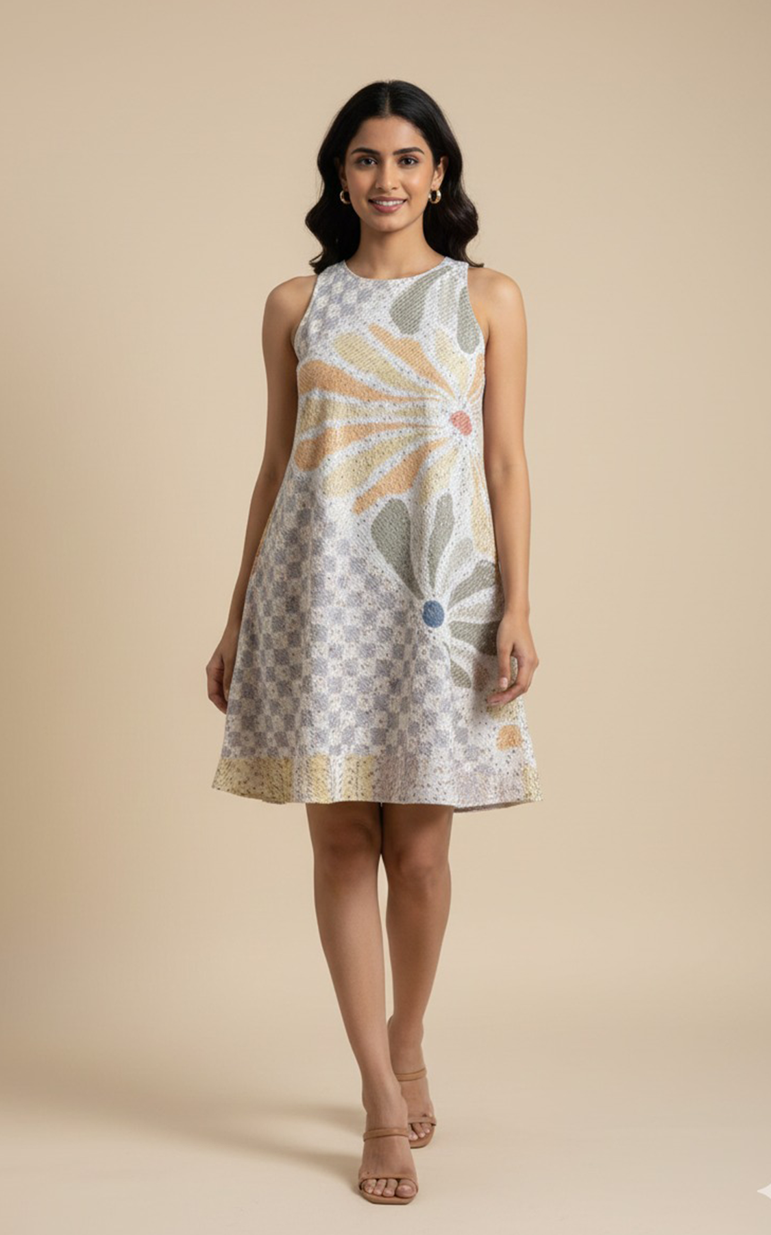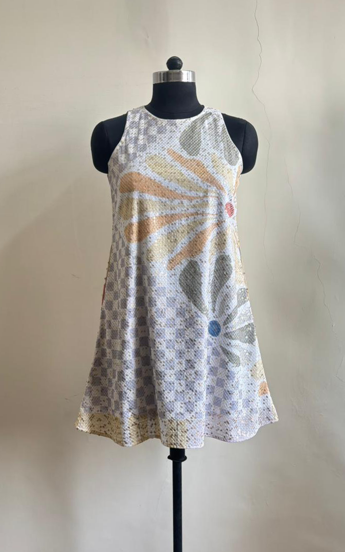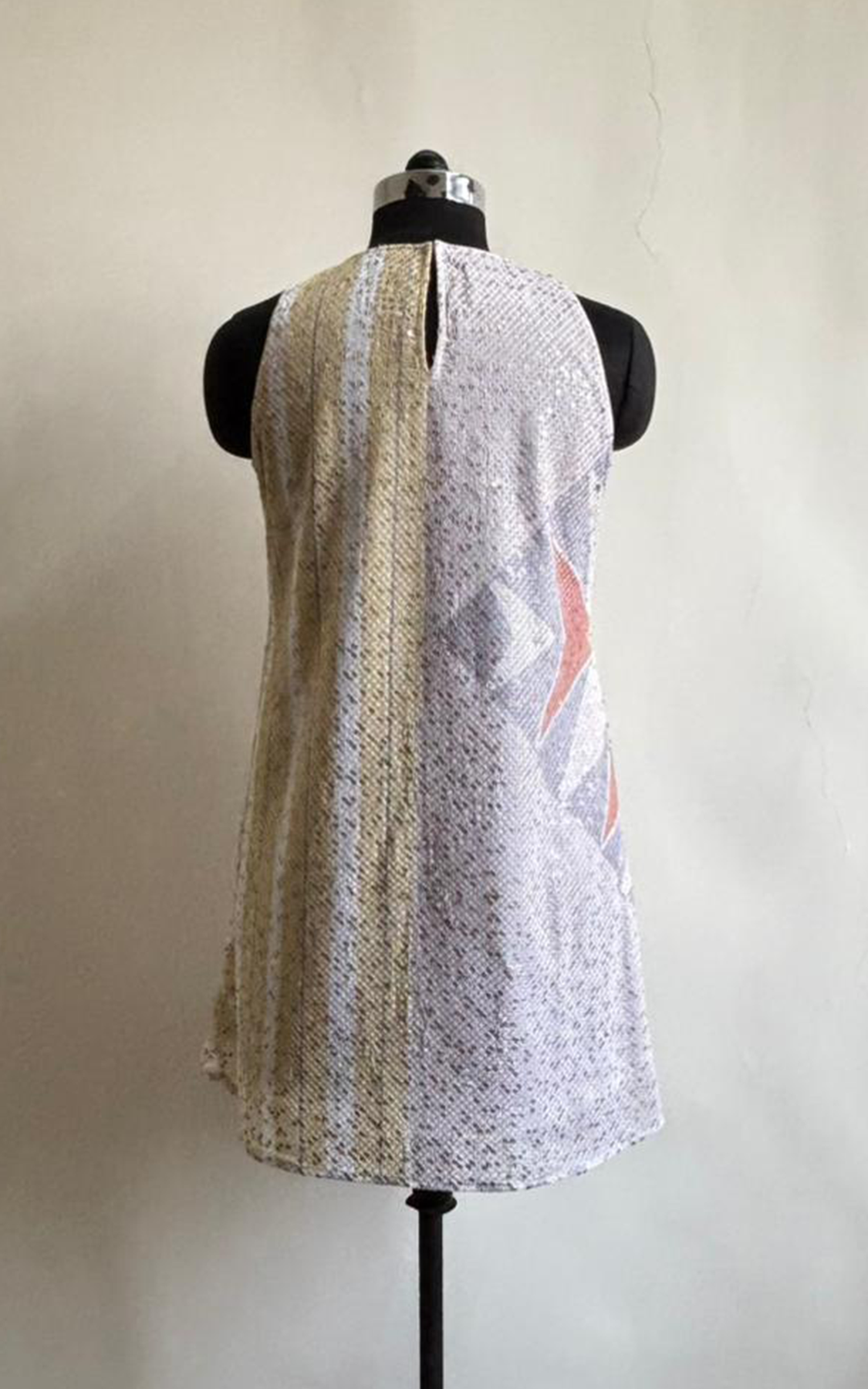 Sleeveless sequined printed short dress with pockets on both side. The dress has a keyhole at the back.