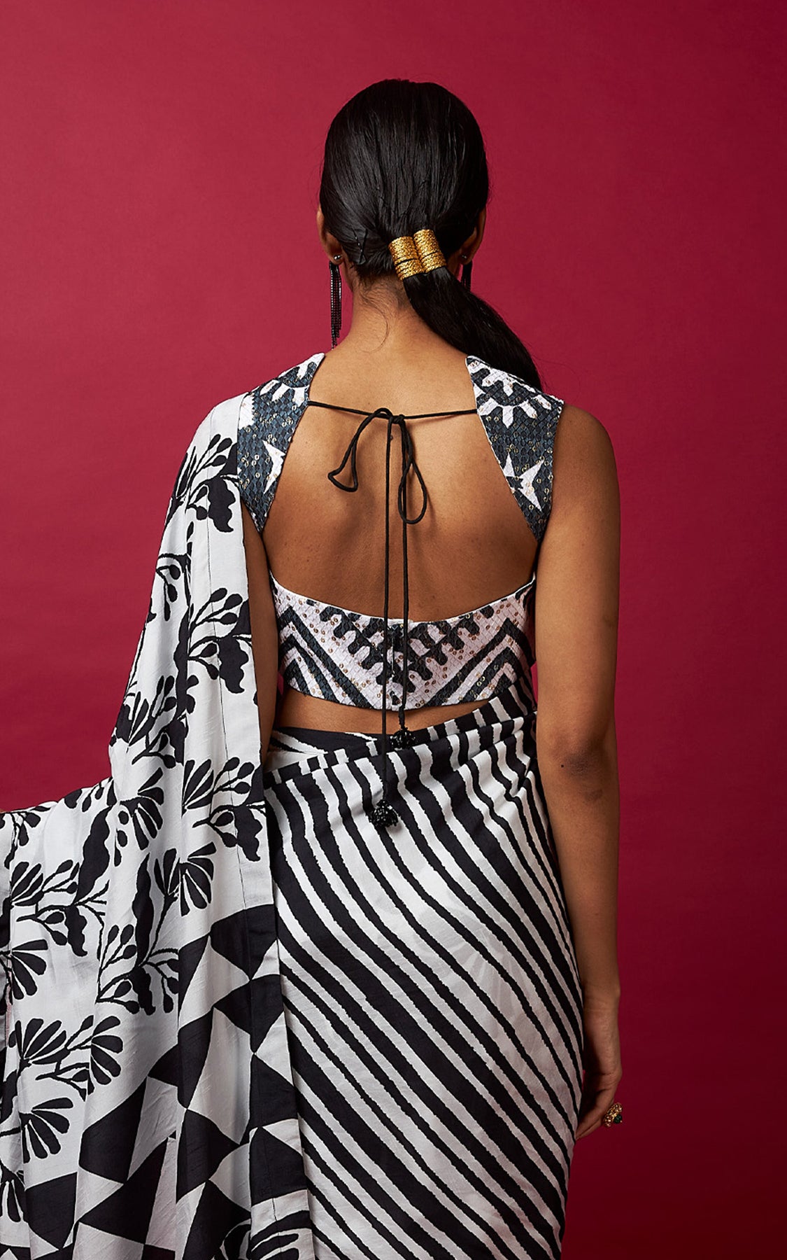 Black and white abstract printed sequin blouse with a multicolor sequinned printed centre yoke and a tie - up detail in the back.