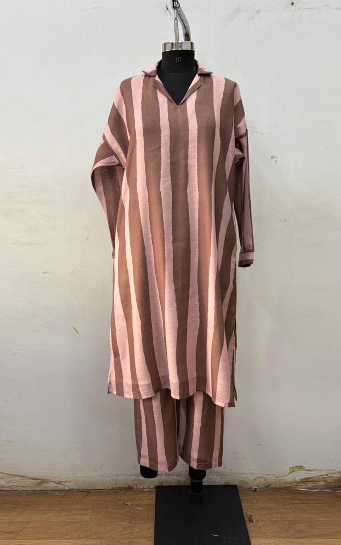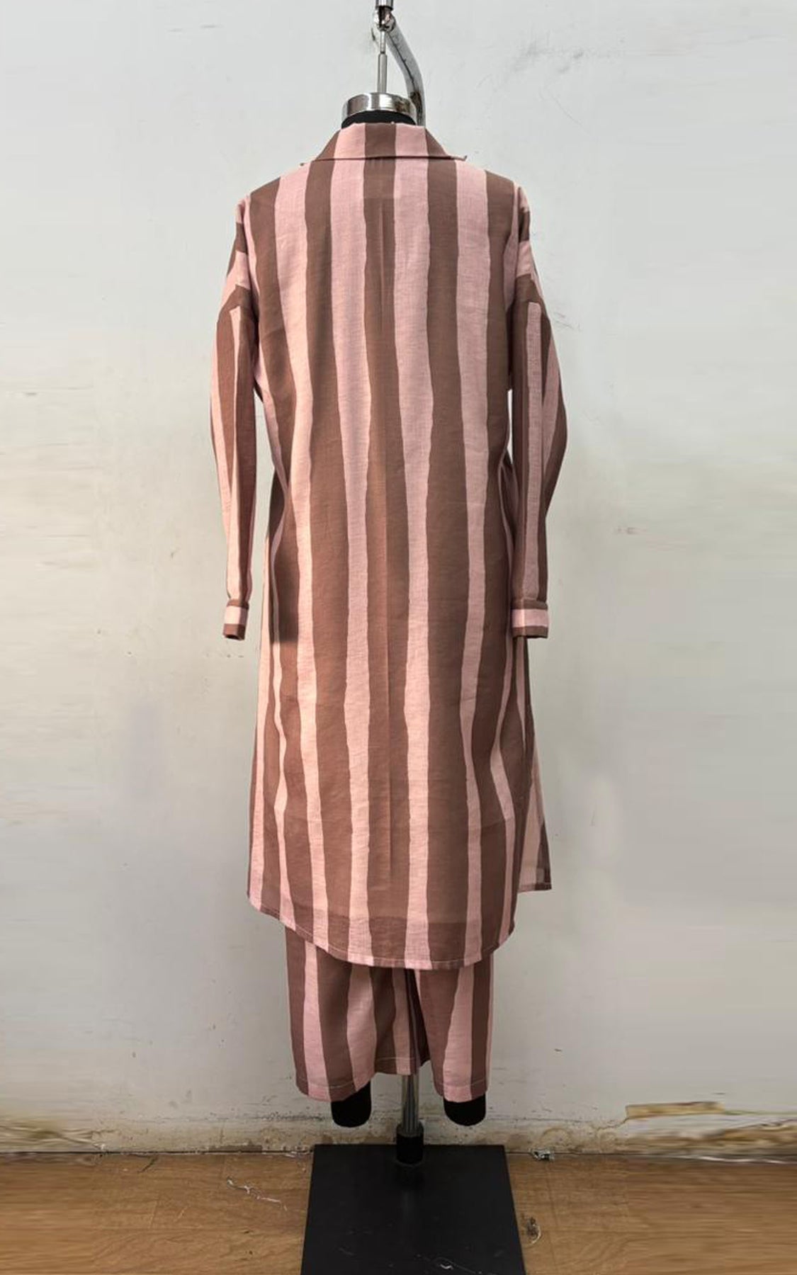 Striped printed kurta with a drop shoulder that has an overlap cuff detailing on the sleeve. The kurta has pockets on both the side, it is paired with matching straight fit stripe printed pants.