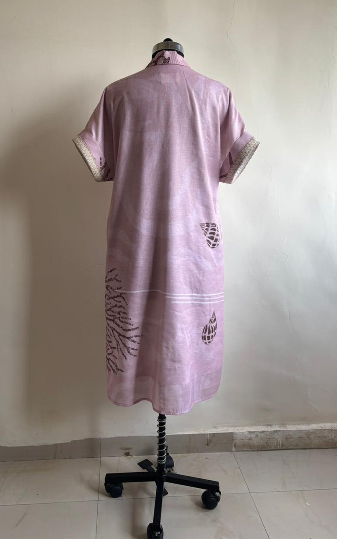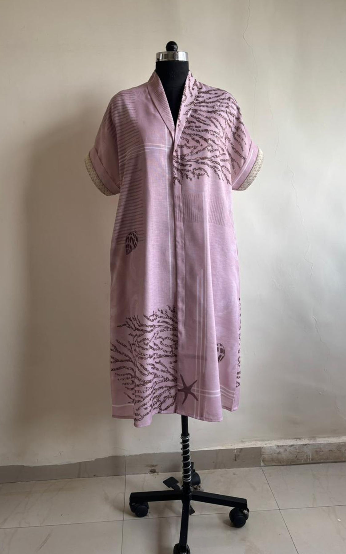 Ocean inspired pink midi dress, with shawl collar and center pleat with a slit, it has border detailing on the sleeve and pocket on both side.