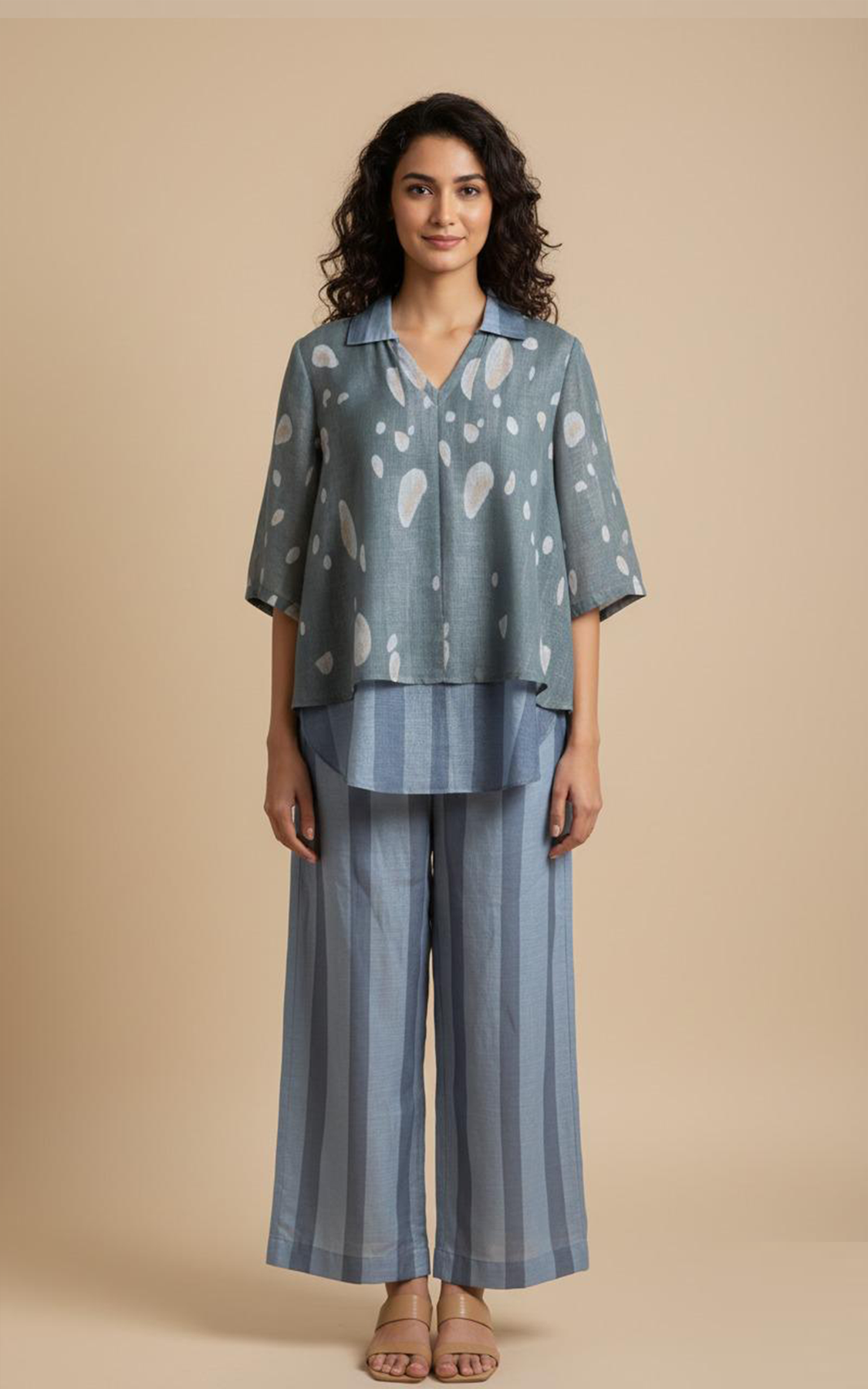 Water effect inspired abstract printed relaxed shirt with a cutout back. The shirt is paired with a stripe printed pant. The pant has side pockets and an elastic at the back of the waist band.