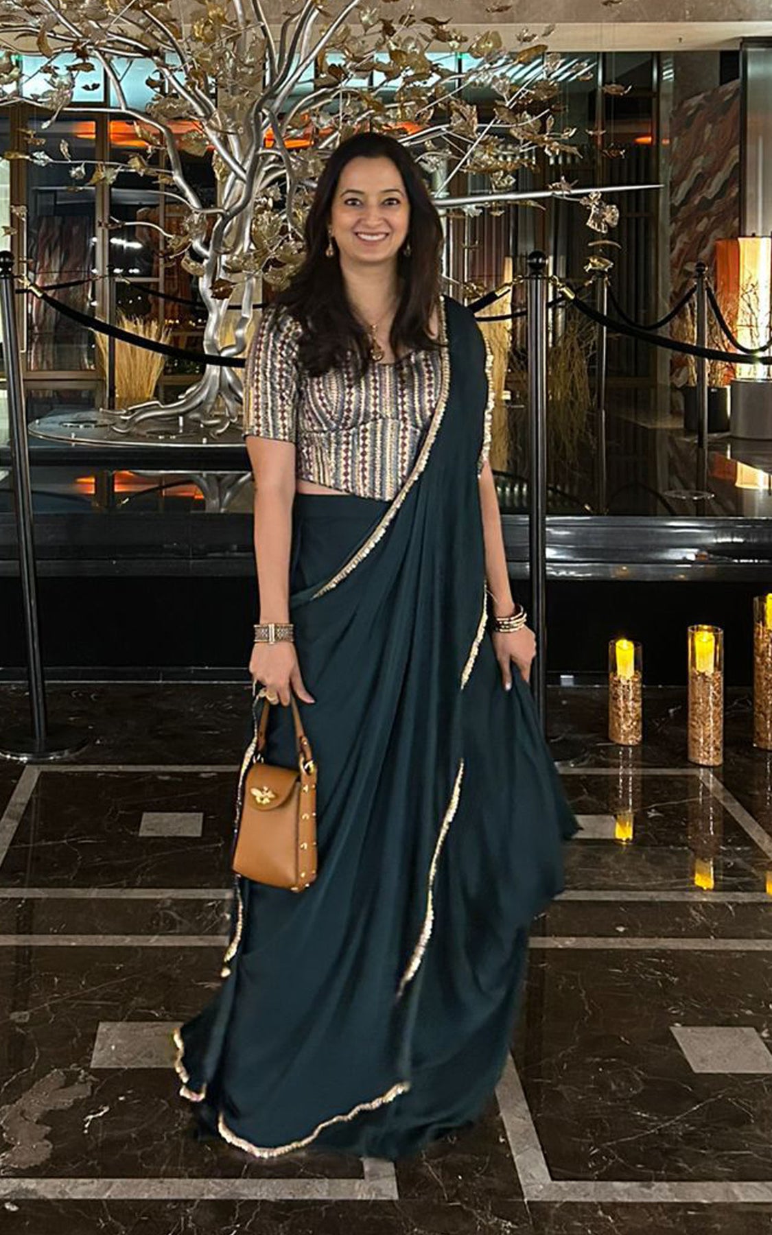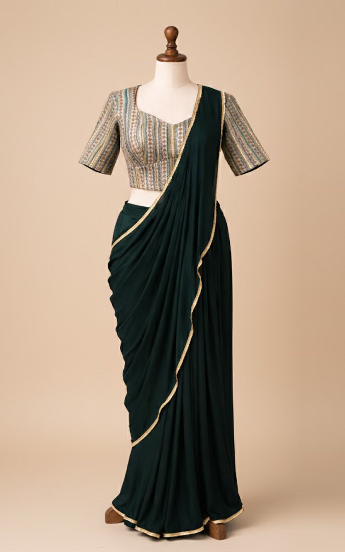 Solid pre-stitched saree paired with a printed sequin embroidered corset style blouse.