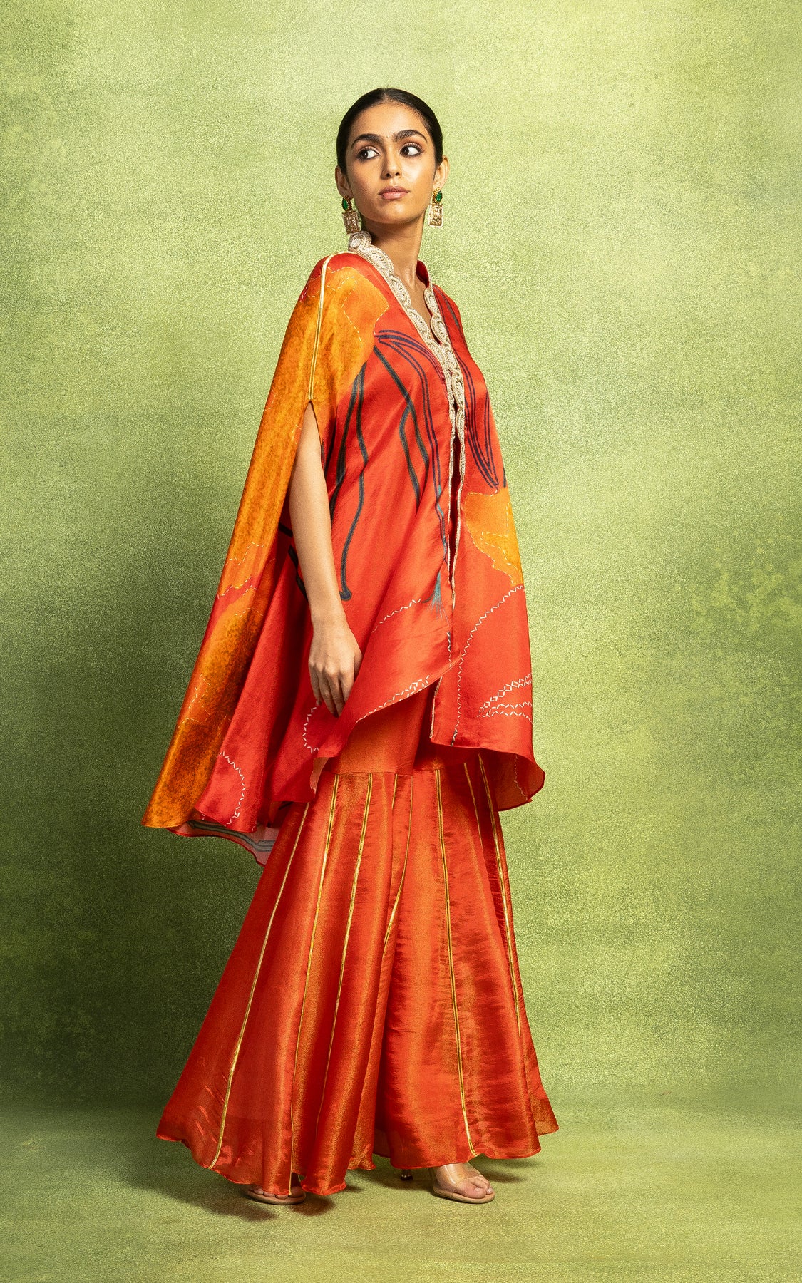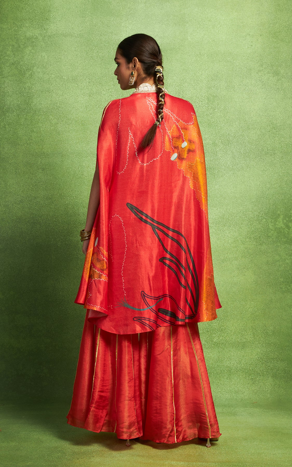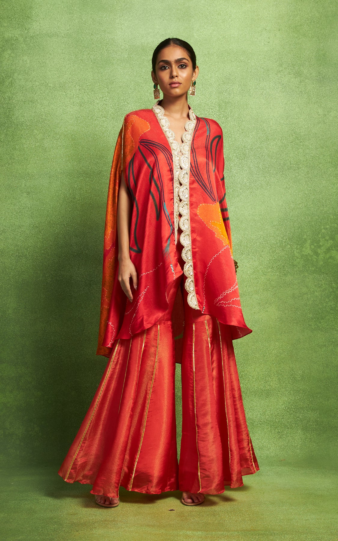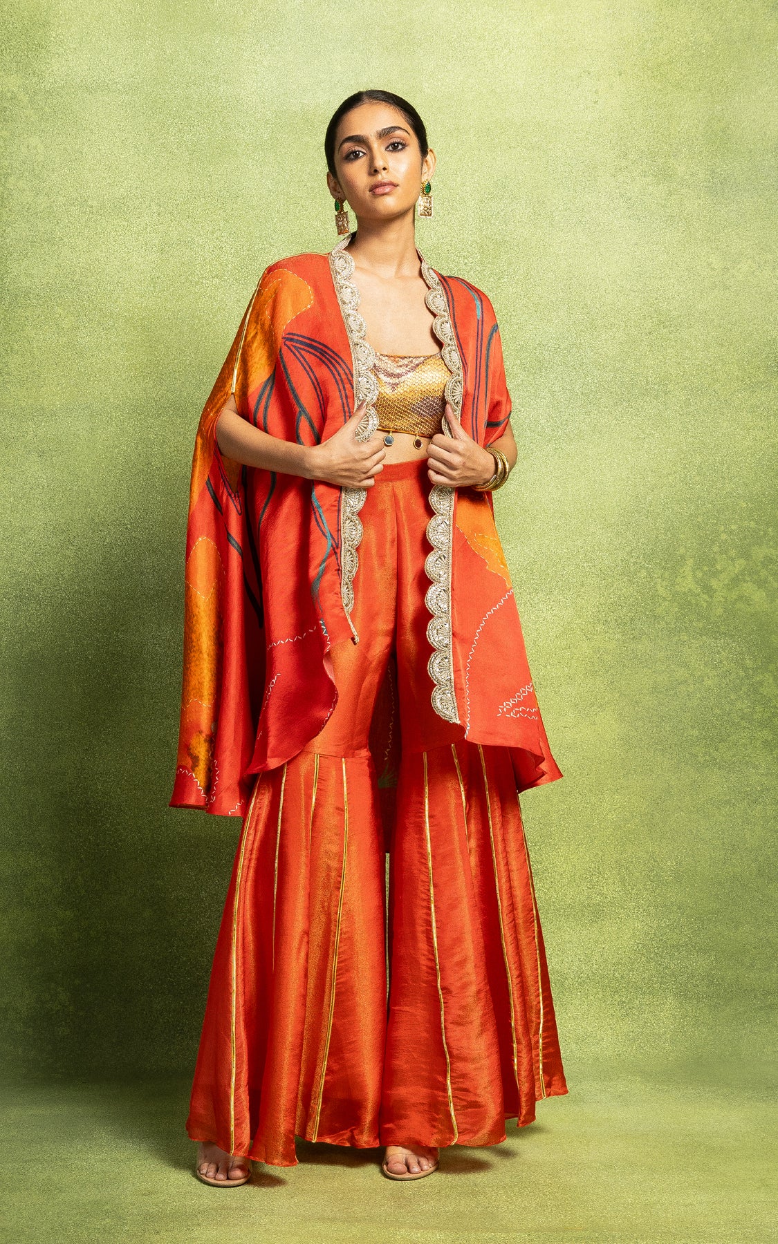Asymetric abstract floral print jacket with hand embroidery detailing with a full sequin bustier.