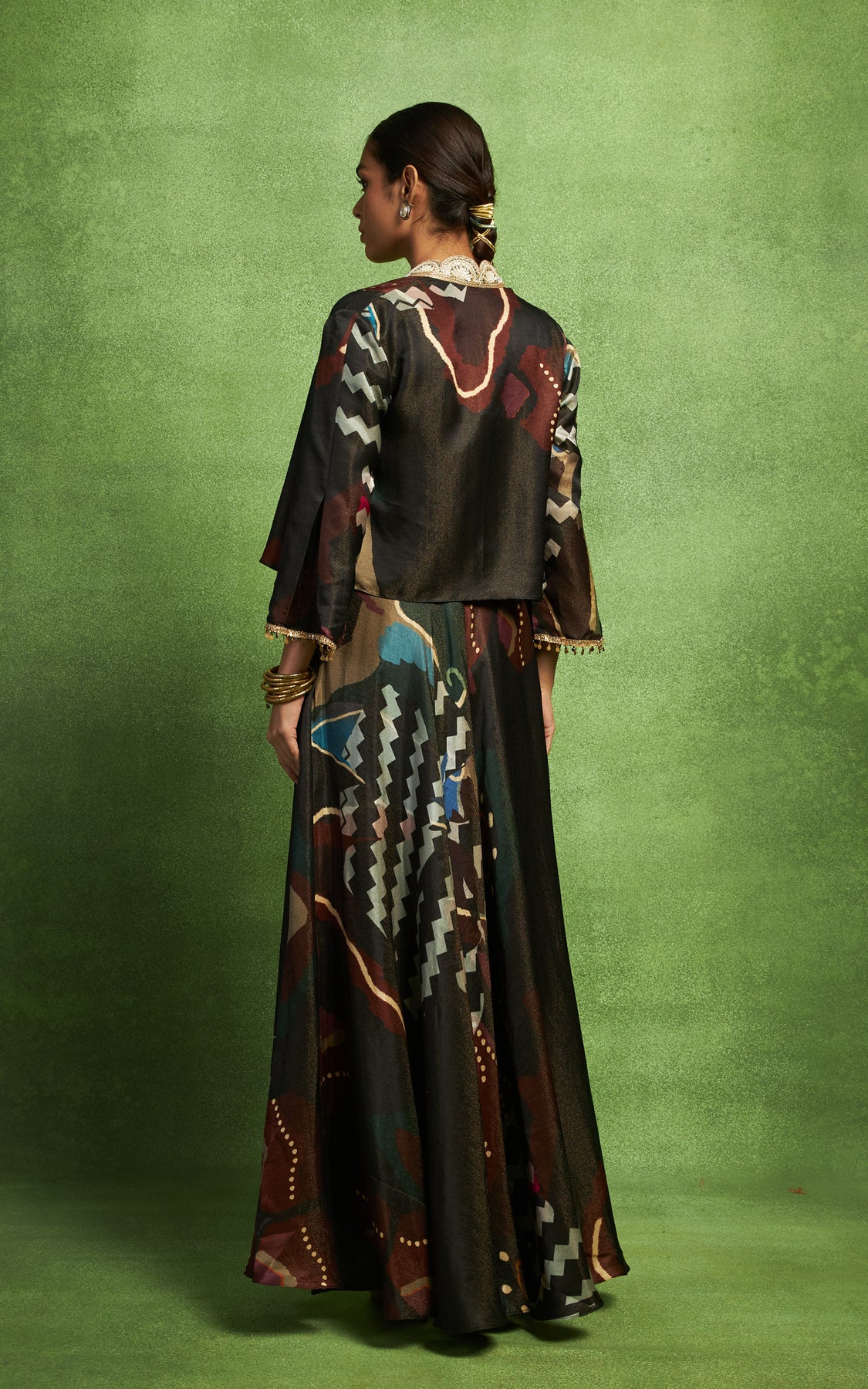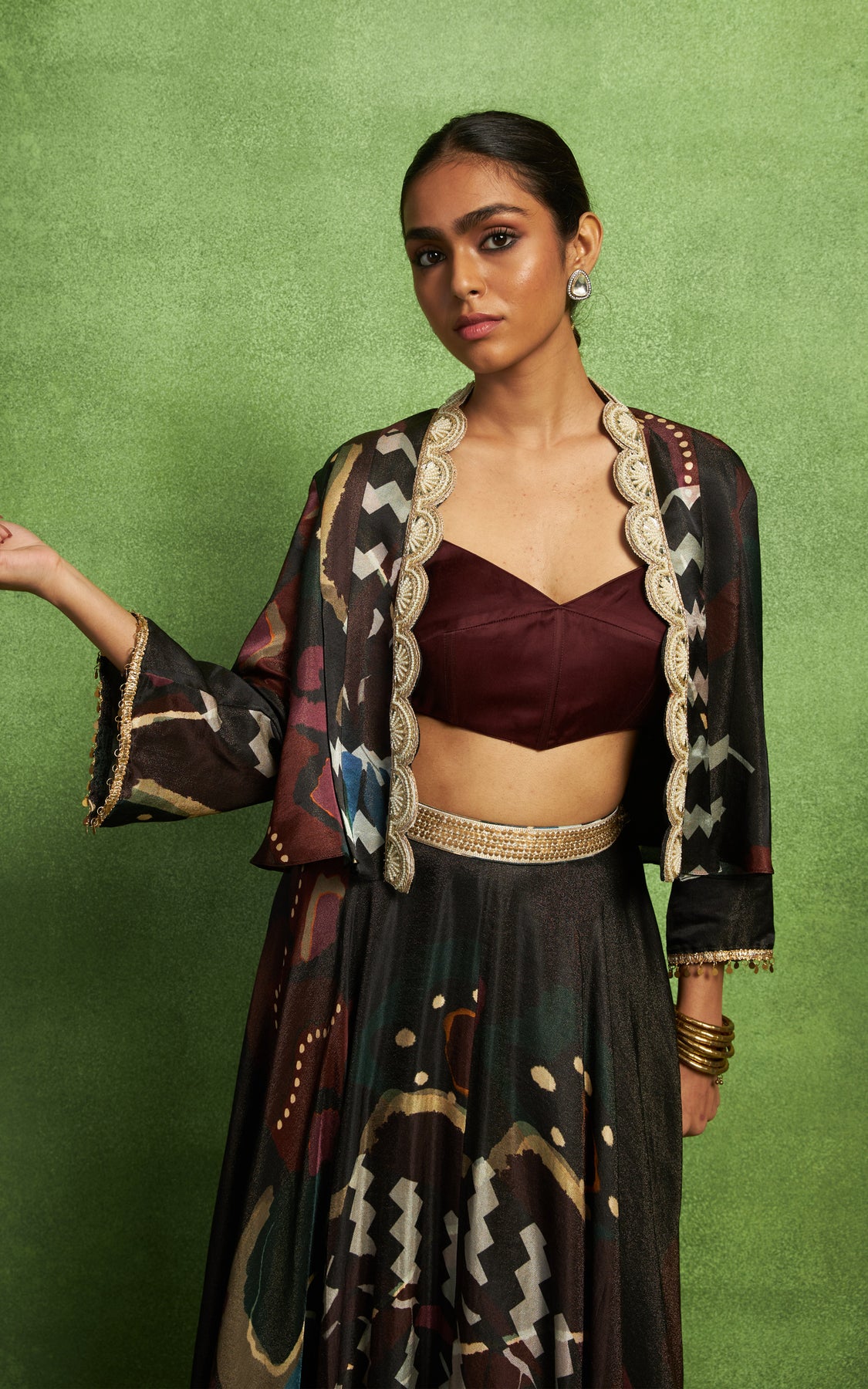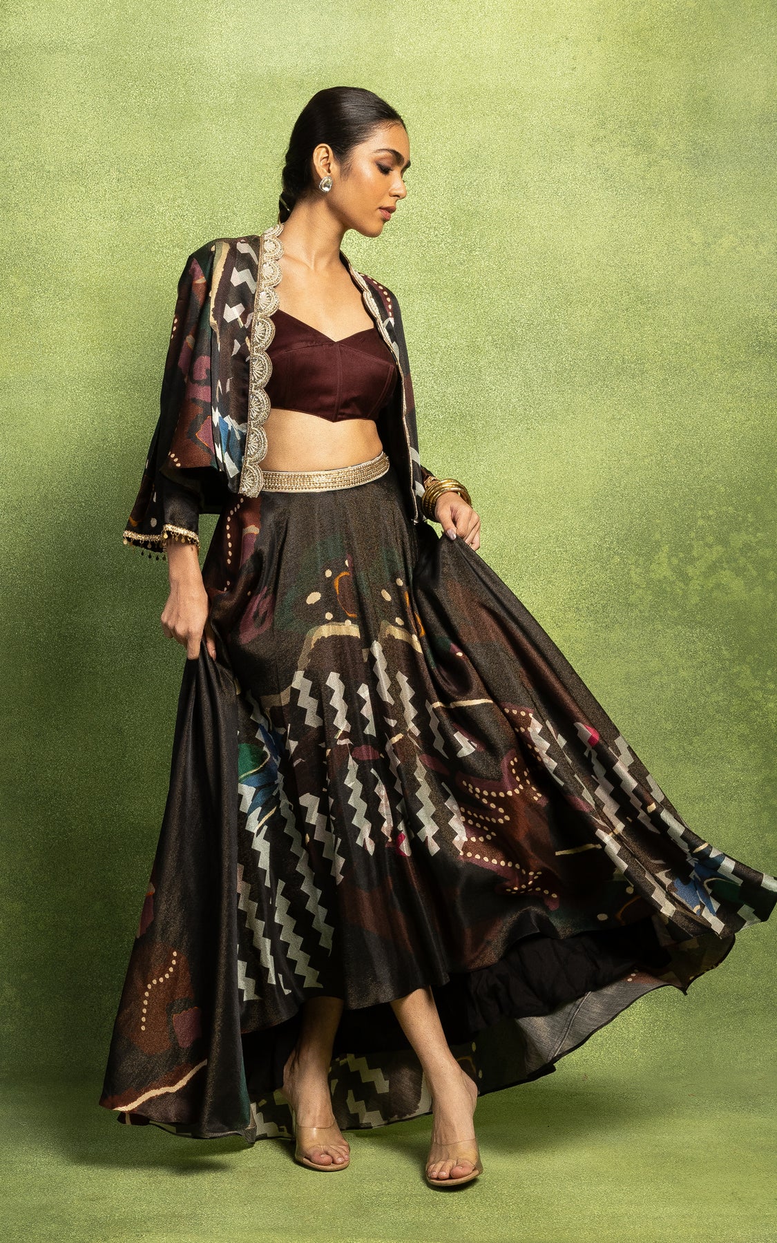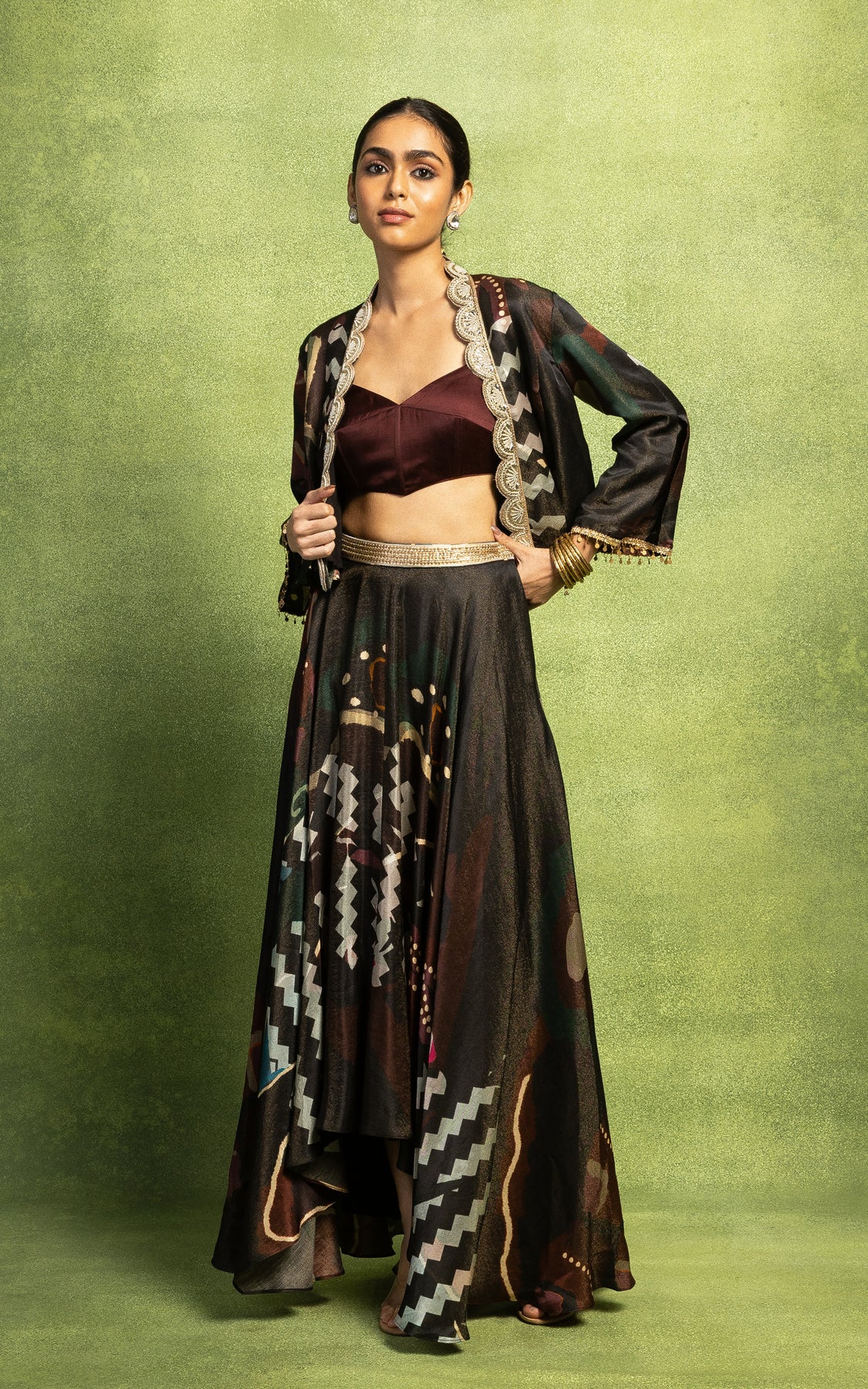 The jacket is paired with an asymmetric printed skirt with hand embroidery detailing on the waist and pockets on both sides. The set comes with a solid bustier.