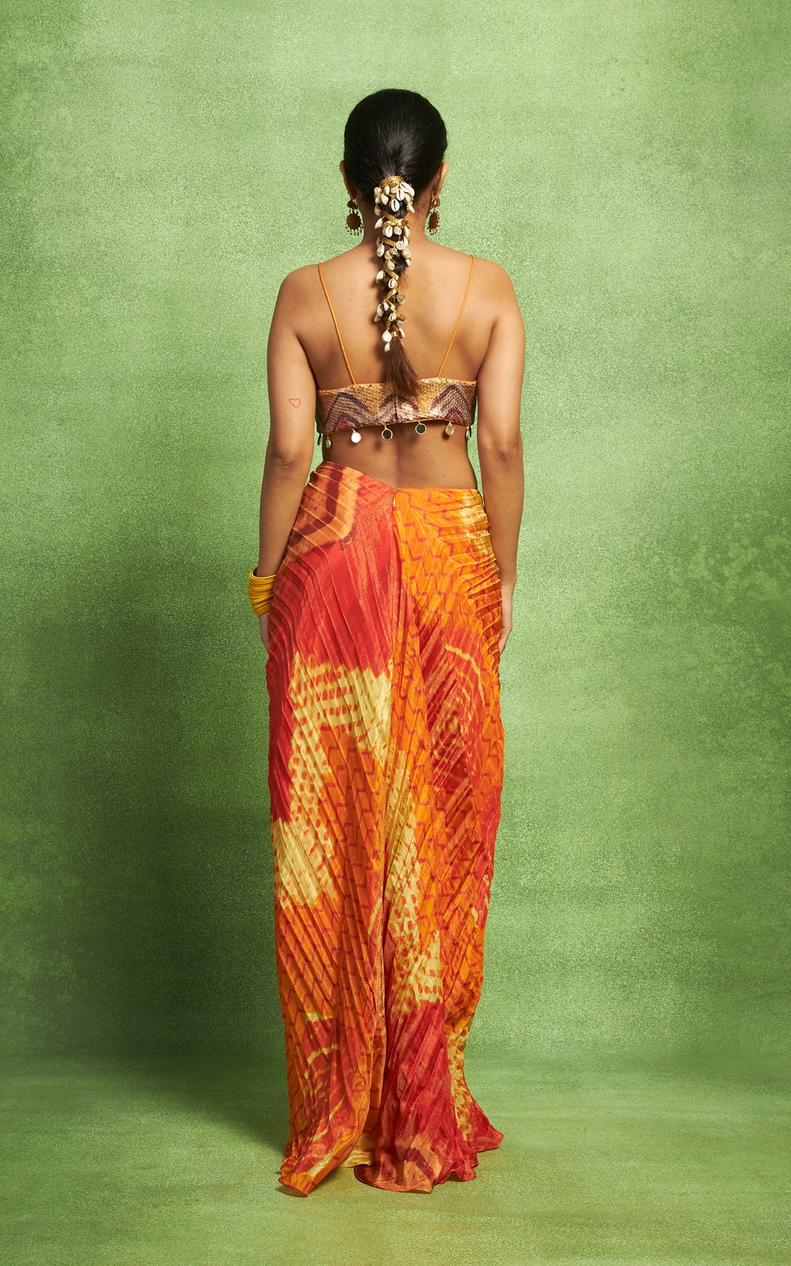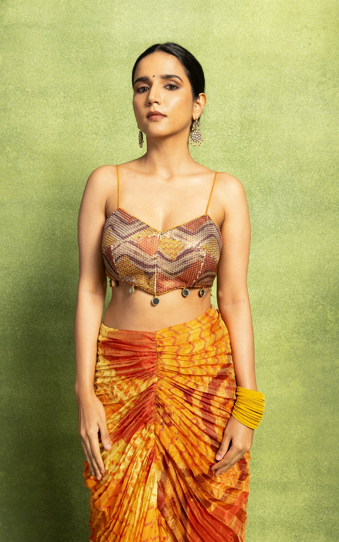 The printed bustier comes with a full sequin embroidery detailing, this bustier is paired with a hand pleated skirt with a slight slit in the front.
