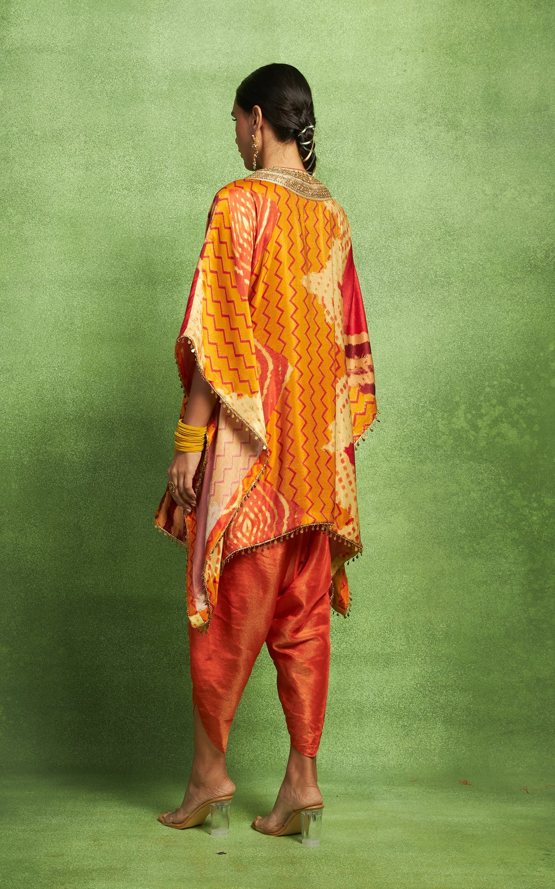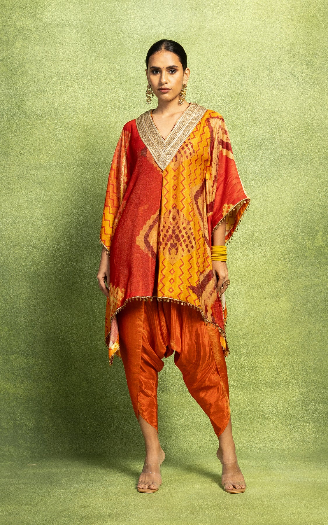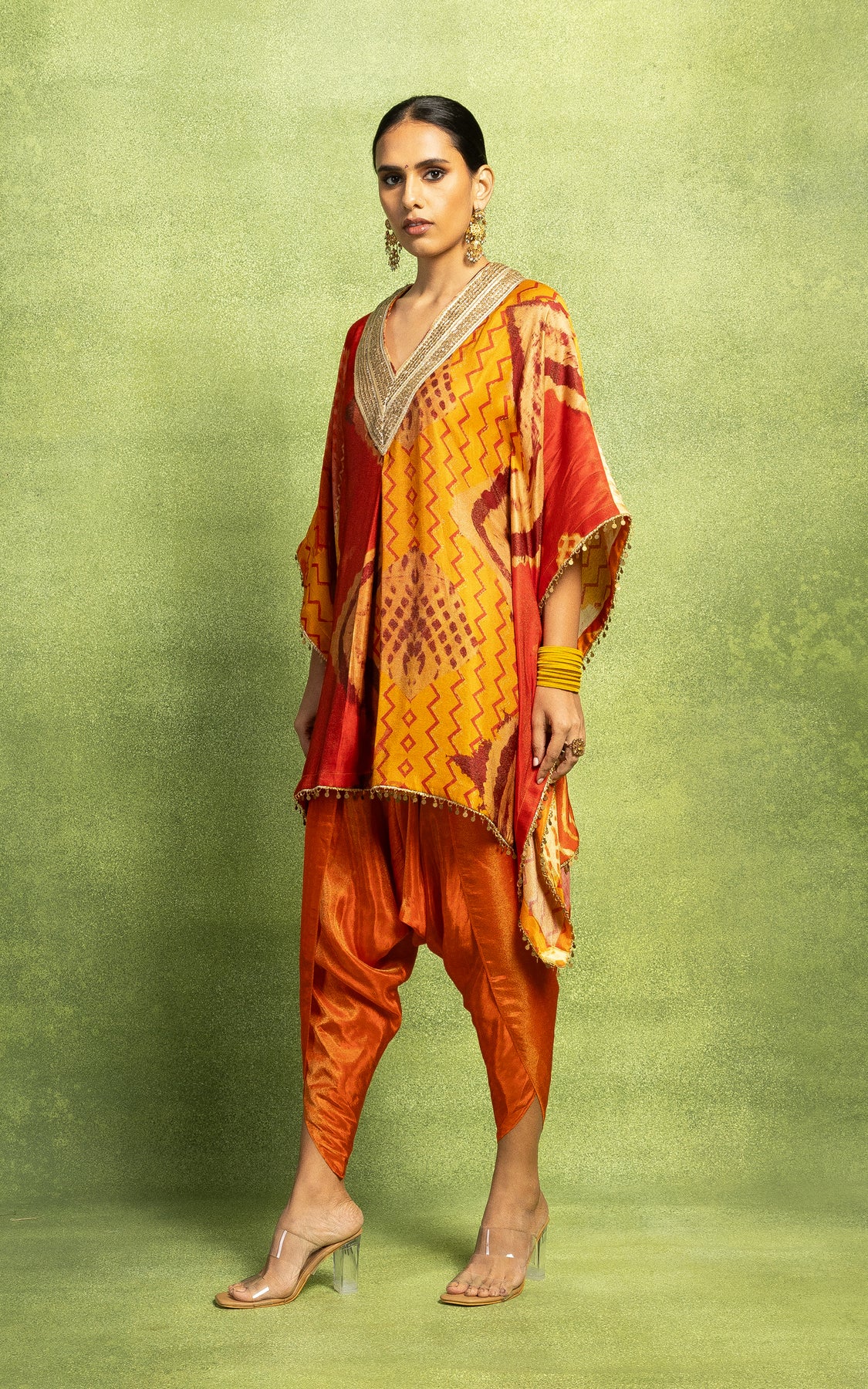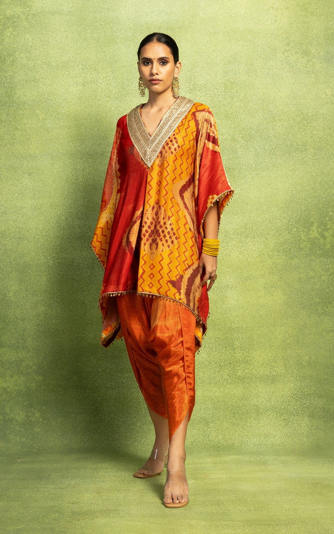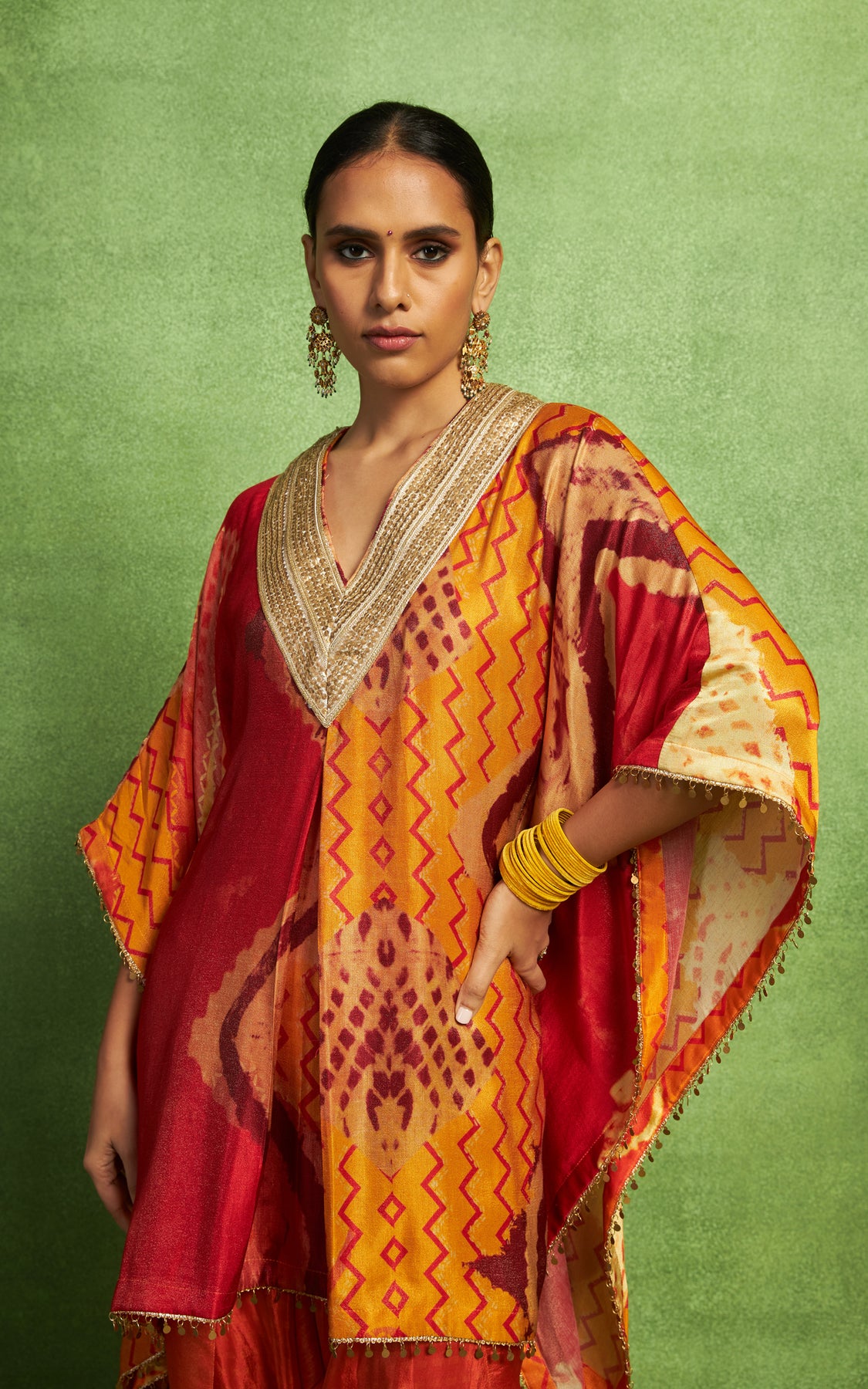 The abstract print V-neck kaftan top in shades of orange and yellow comes with a detailed hand embroidered neckline along with hanging embroidery details across the hemline and sleeves.