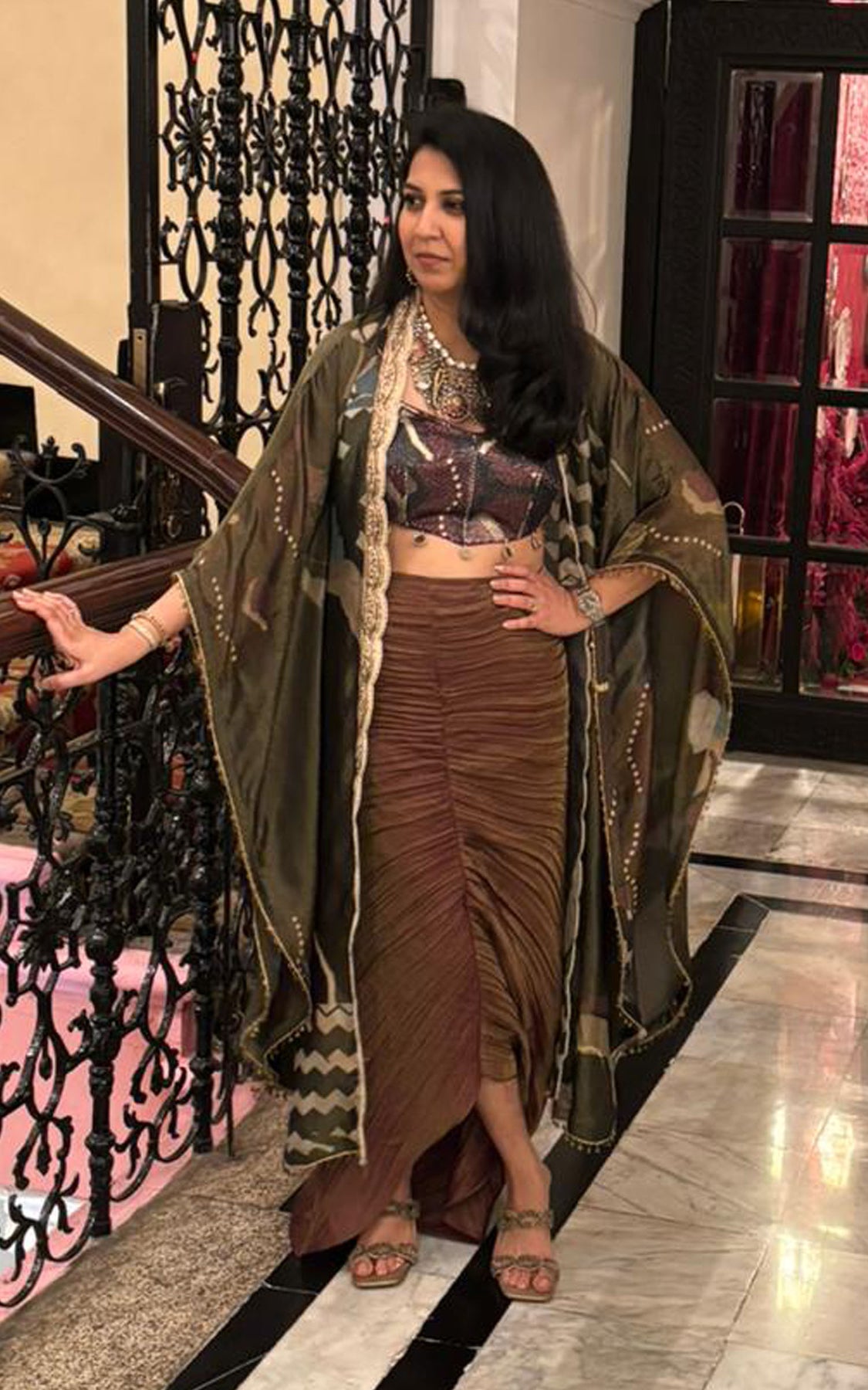 The jacket is paired with a hand pleated skirt and a sequin embroidered bustier.