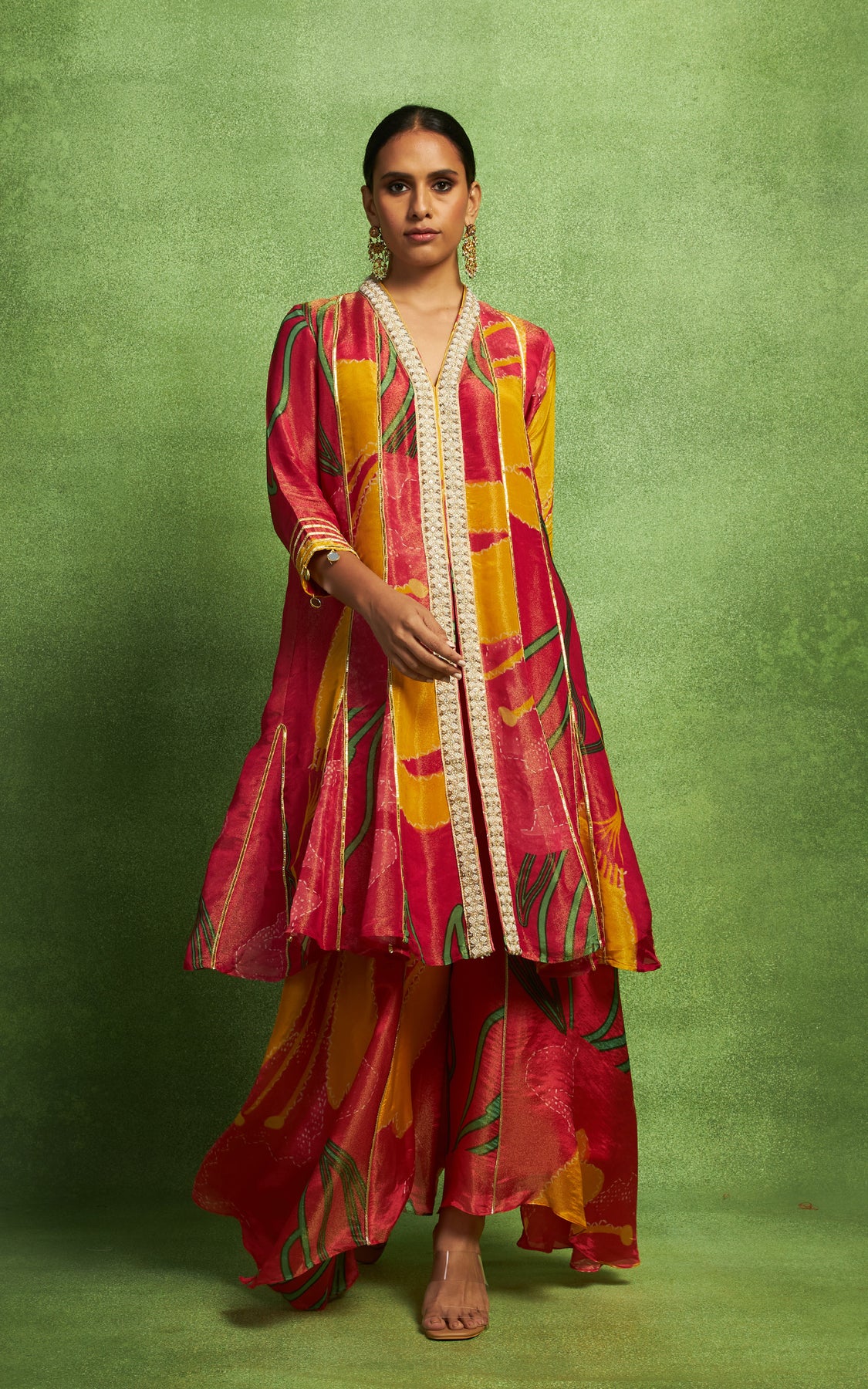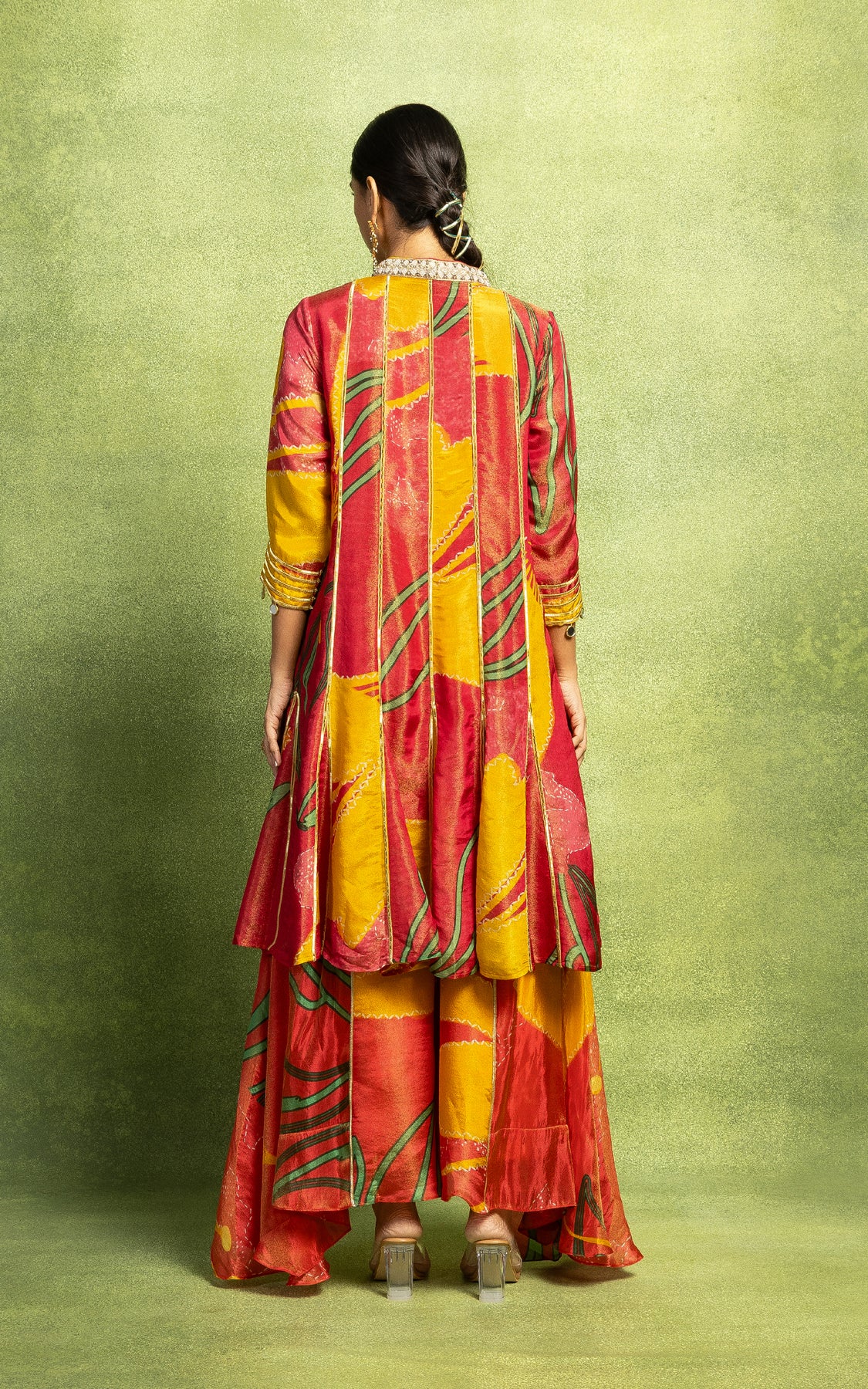 Flowy panelled kurta with hand embroidery detailing. The sleeves also have mirror detailing at the cuff.
