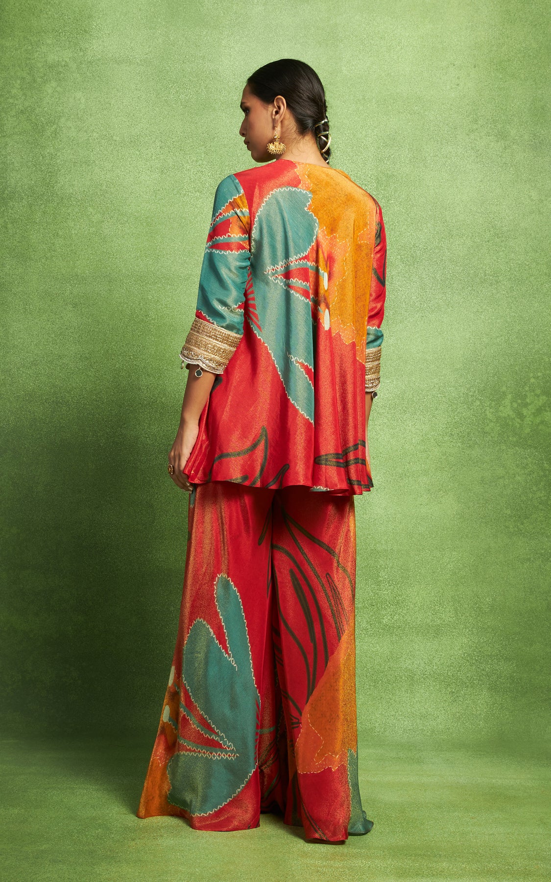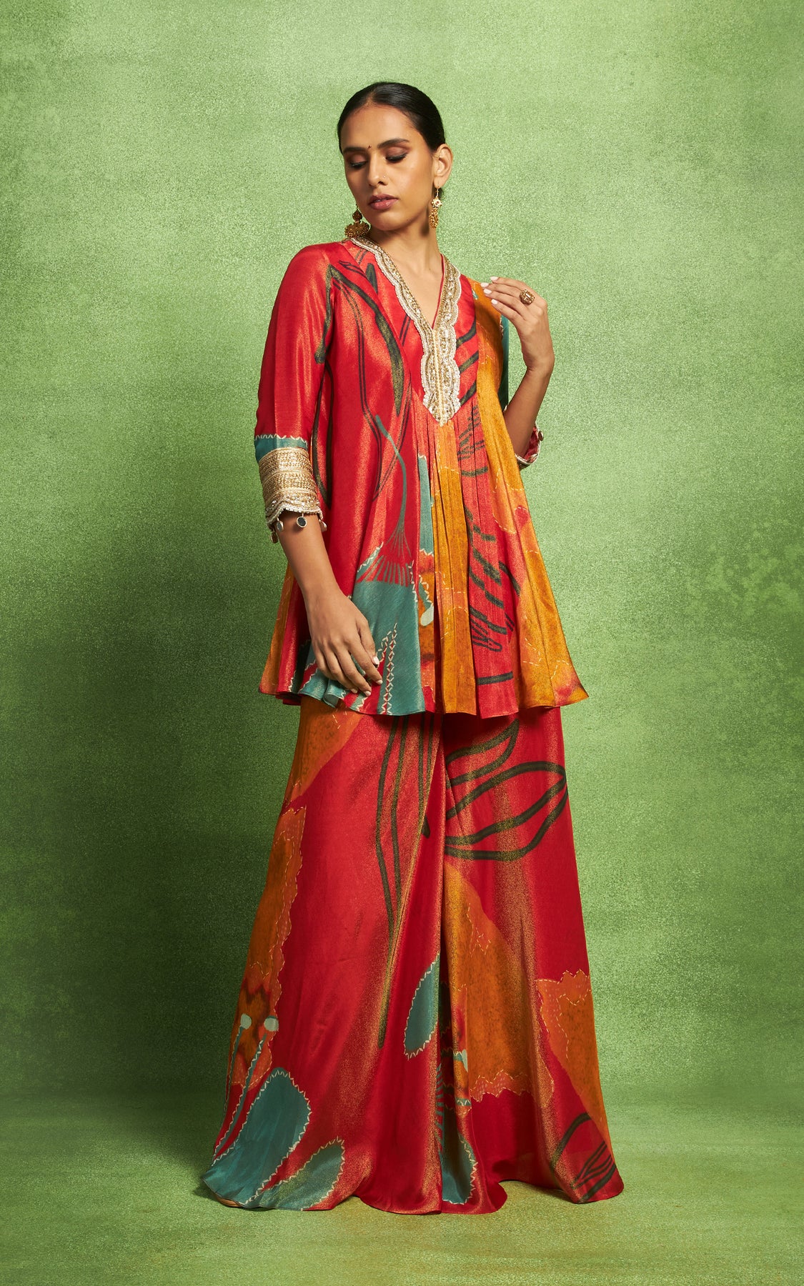 The kurta is paired with flared printed pants with an elasticated waist band for easy and comfortable wear.