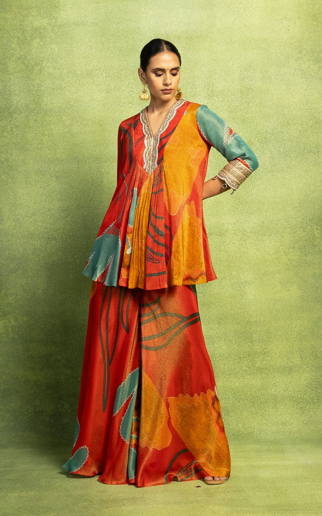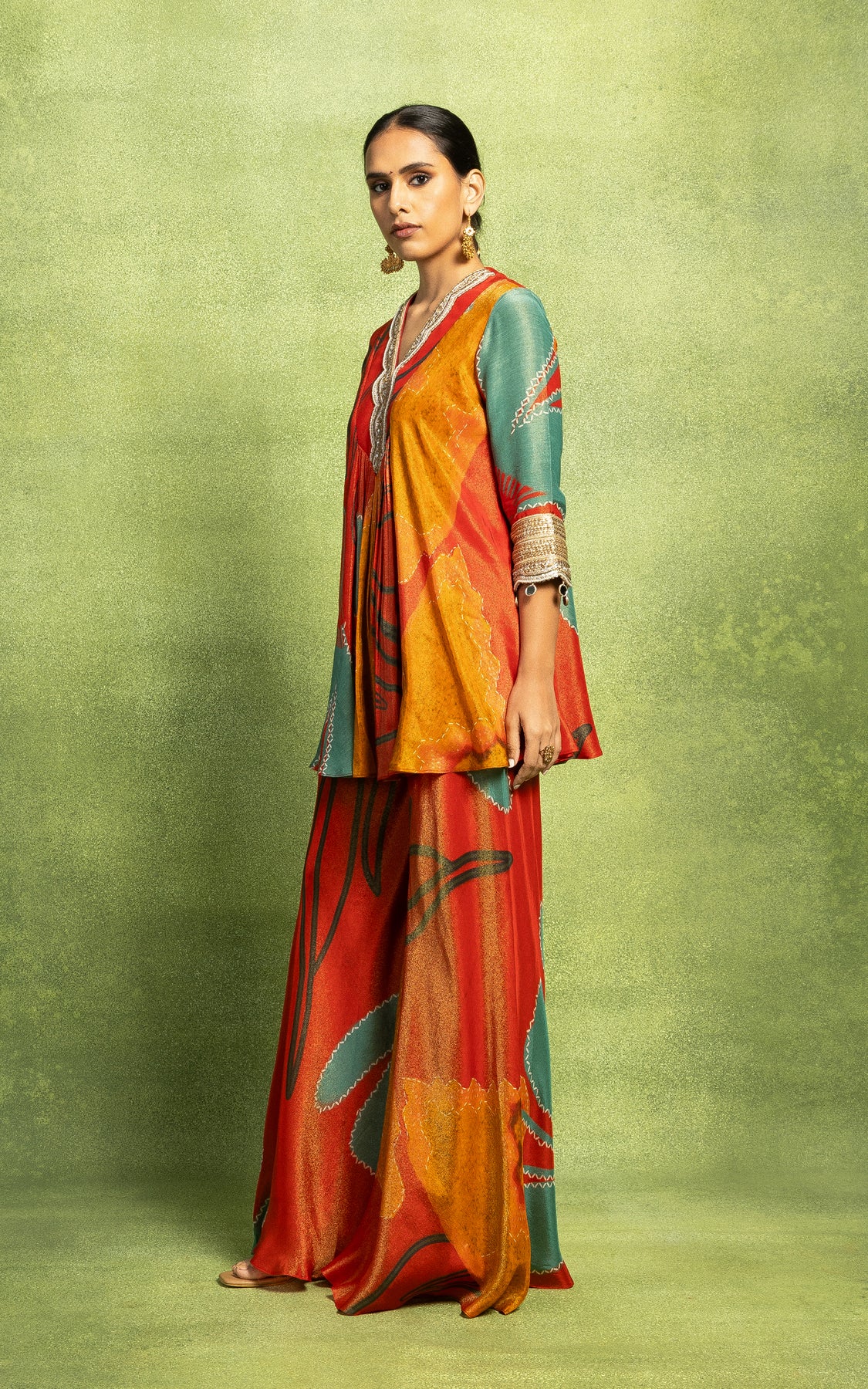 A comfortable printed flowy V-neck kurta, with hand embroidery detailing on the neckline and sequin border details on the sleeve cuffs with mirror hangings.