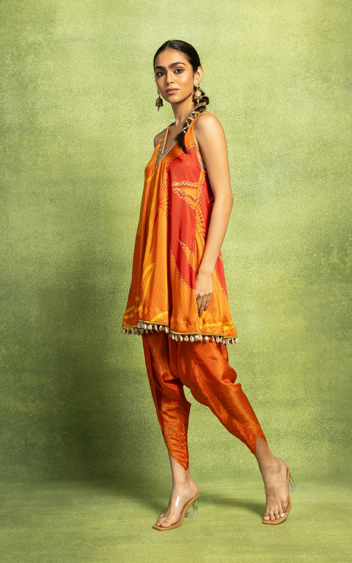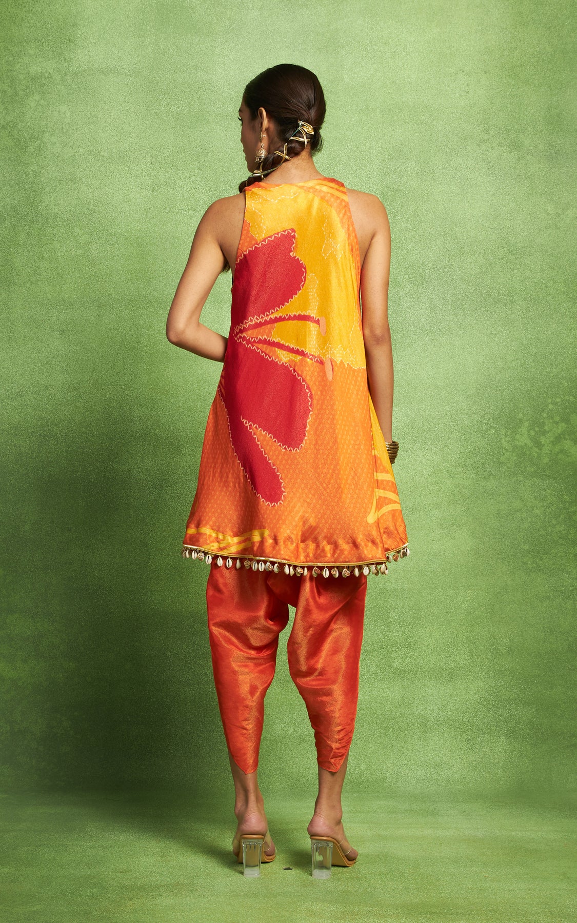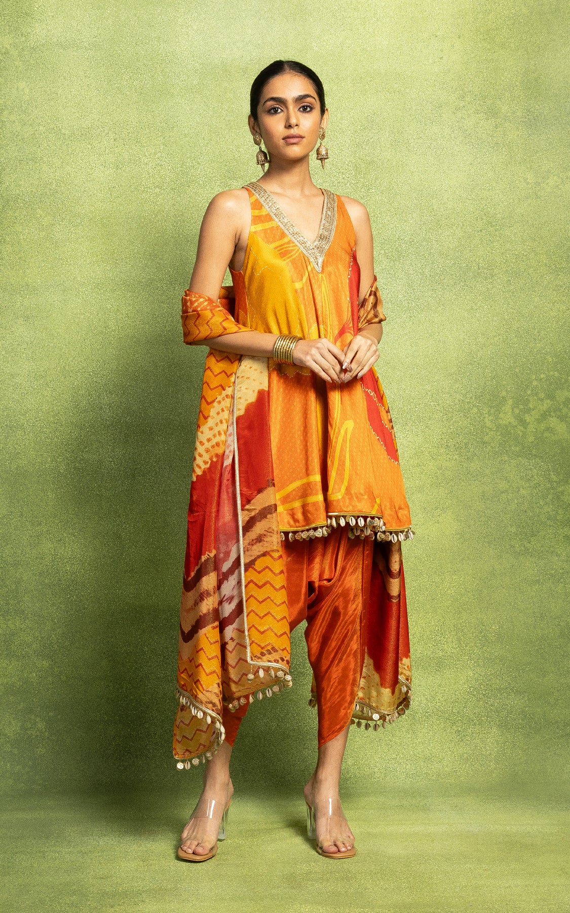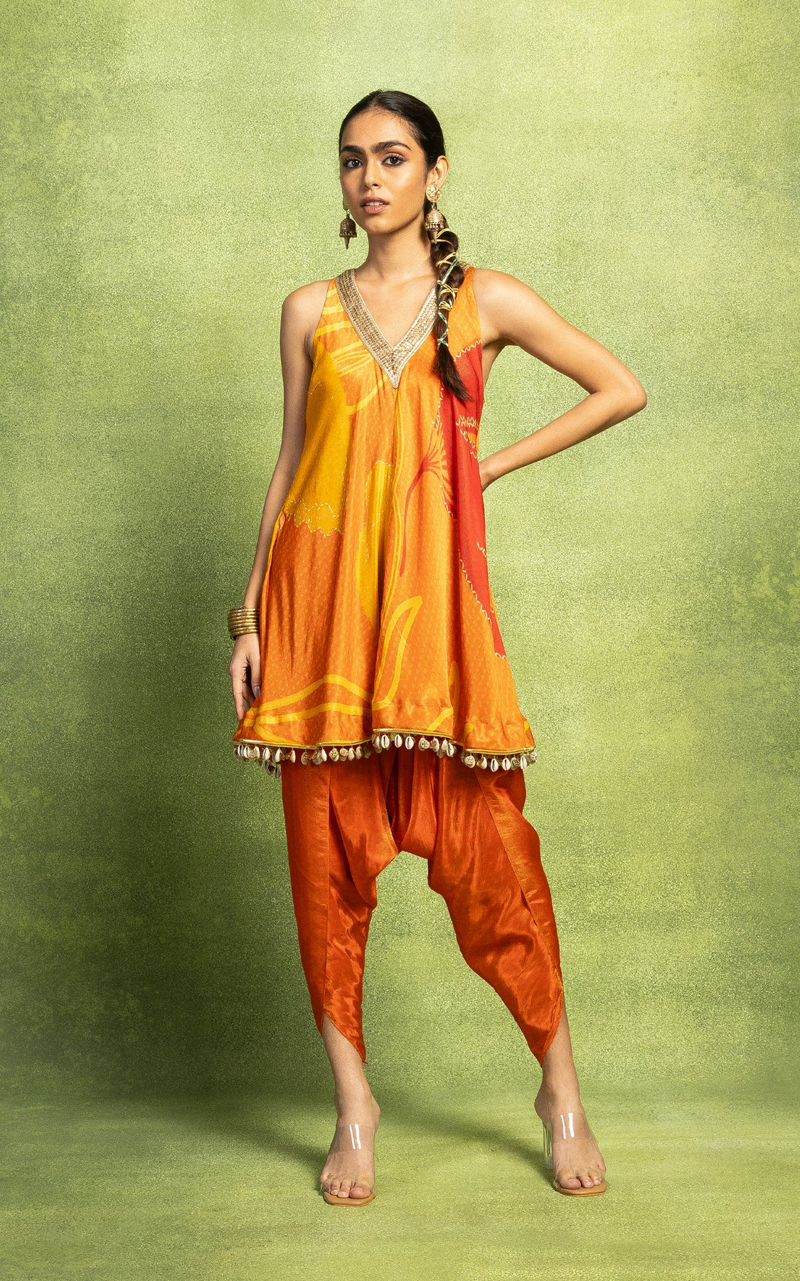 V neck abstract floral print kurta with embroidery detailing at the neck line and shell details around the hemline. The kurta is paired with dhoti style pants & comes with a printed dupatta with embroidery detailing.