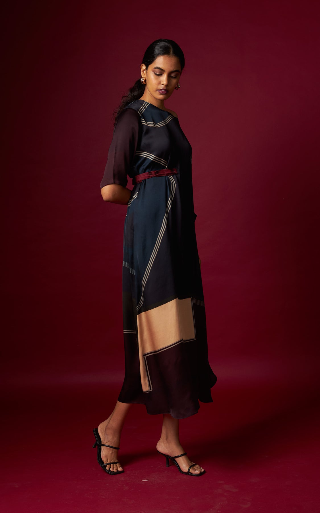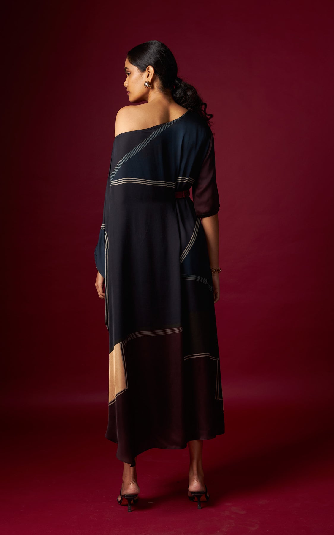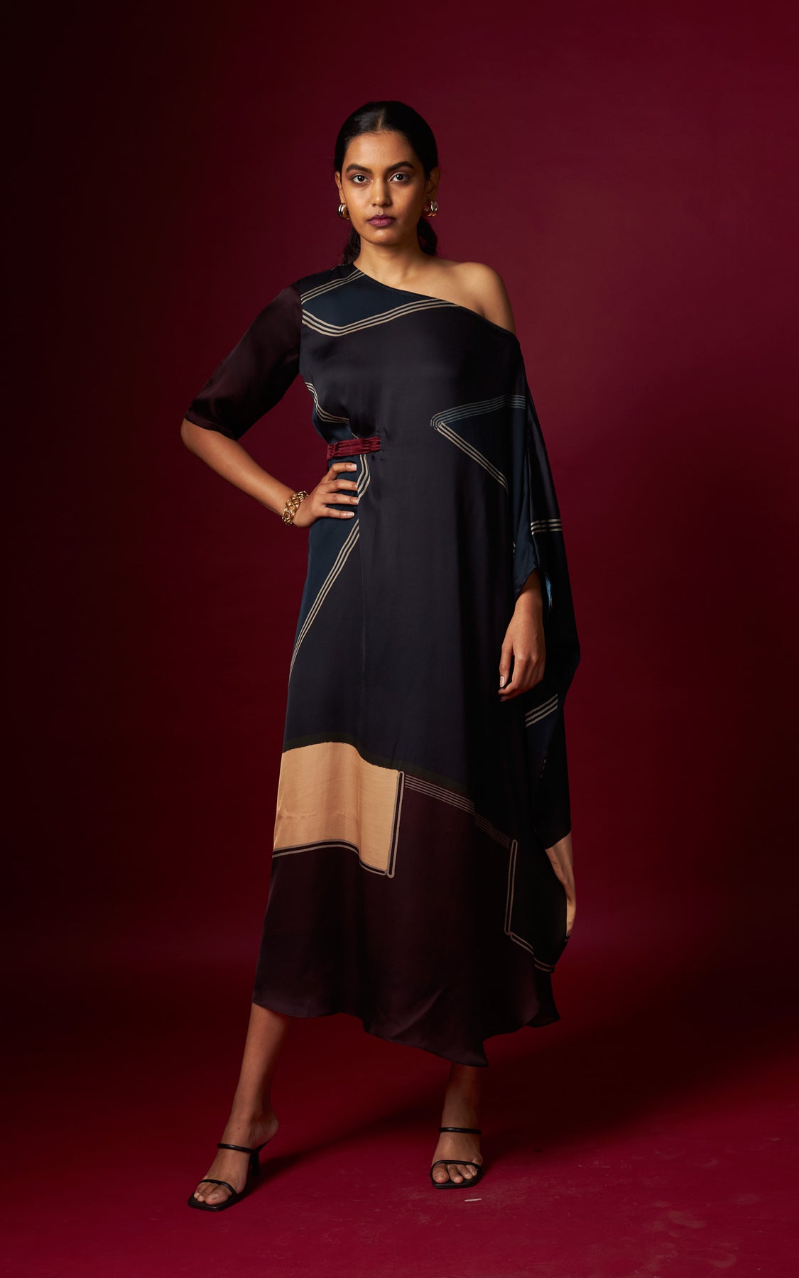 An abstract printed drop-shoulder drape tailored in a fluid, flowy silhouette with sleeves on both sides. Finished with a detachable belt that cinches the waist on one side, this style offers effortless elegance and a flattering fit.