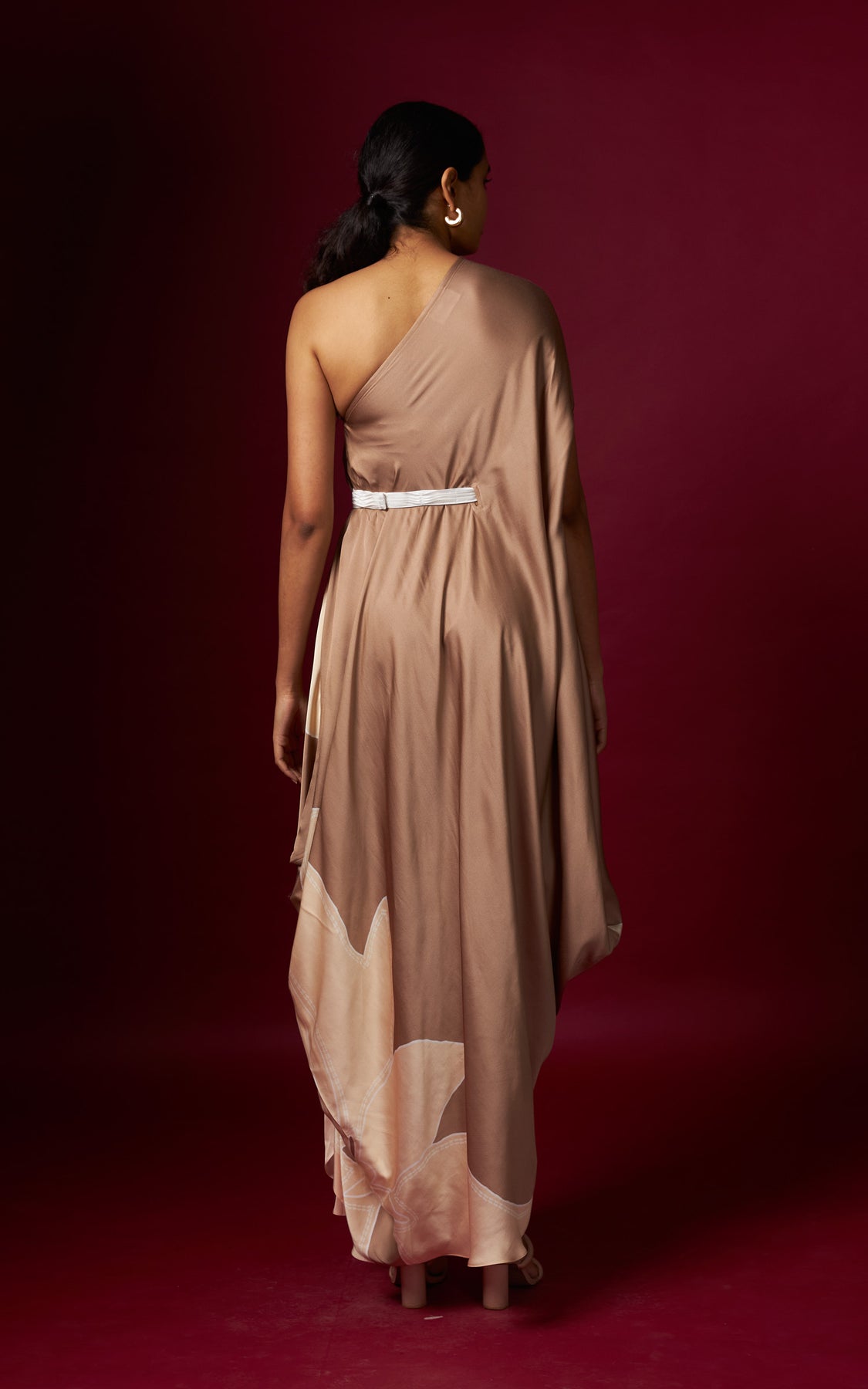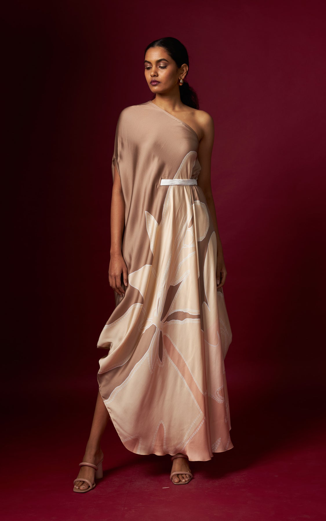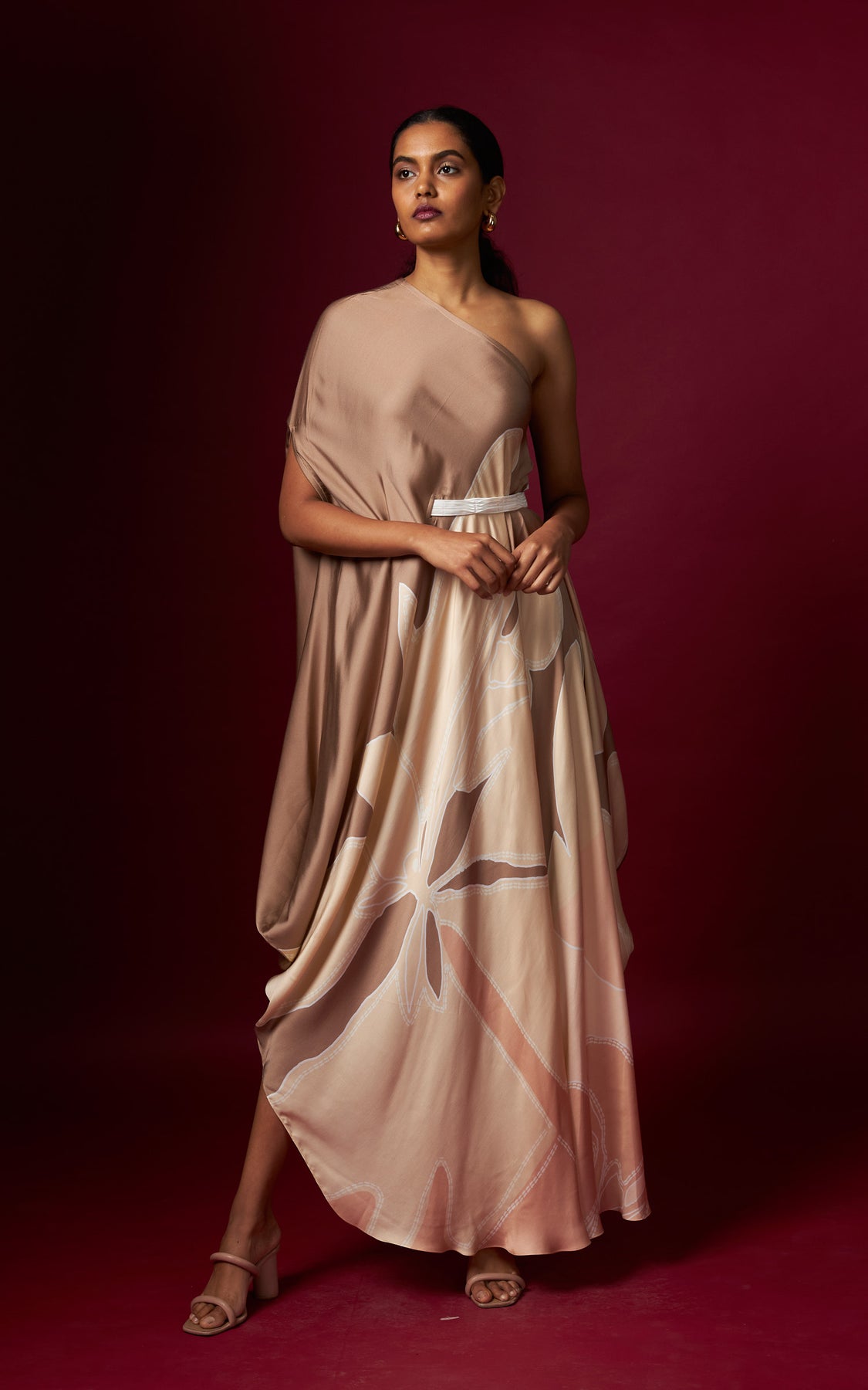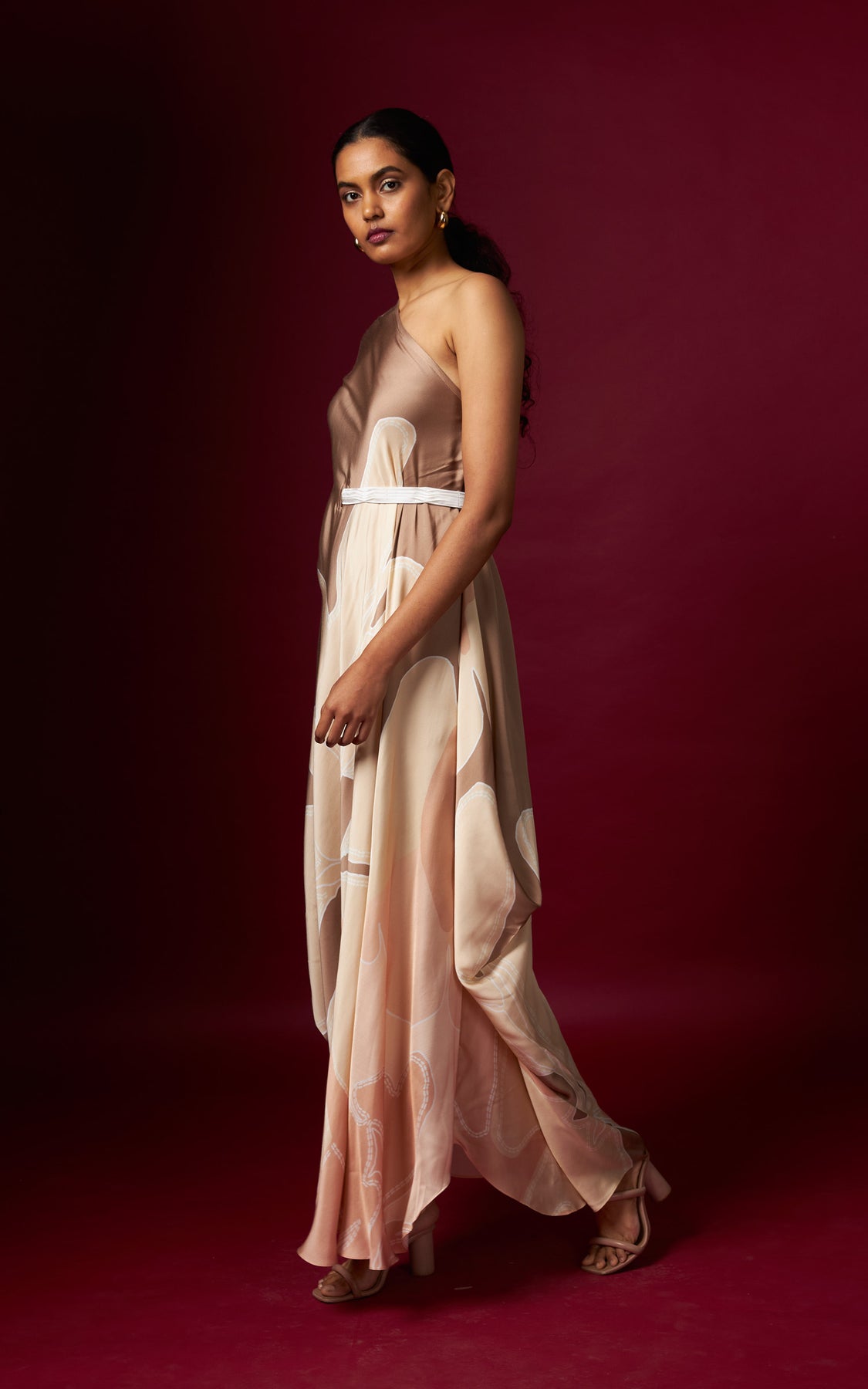 A beige abstract printed one-shoulder drape dress, finished with a detachable belt that cinches the waist on one side for a flattering fit. Designed in a fluid, flowy silhouette, this style drapes beautifully and complements all body types with effortless ease.