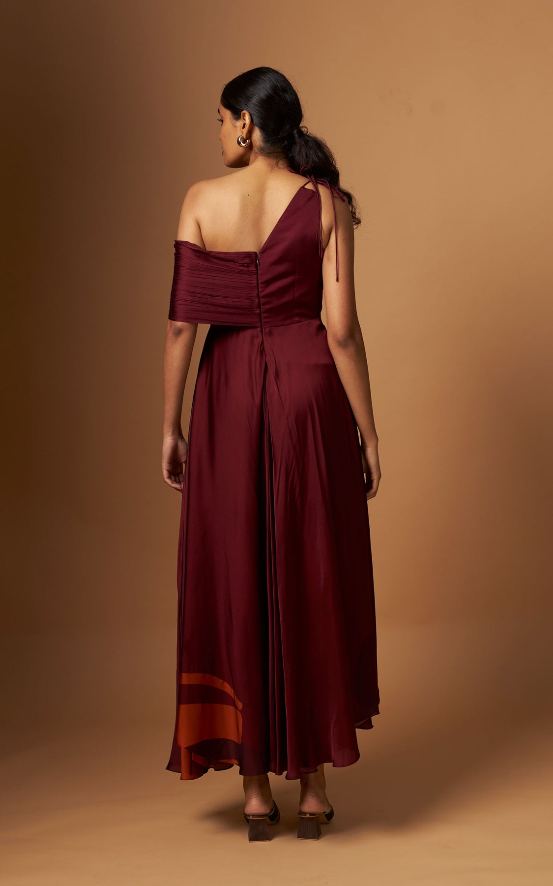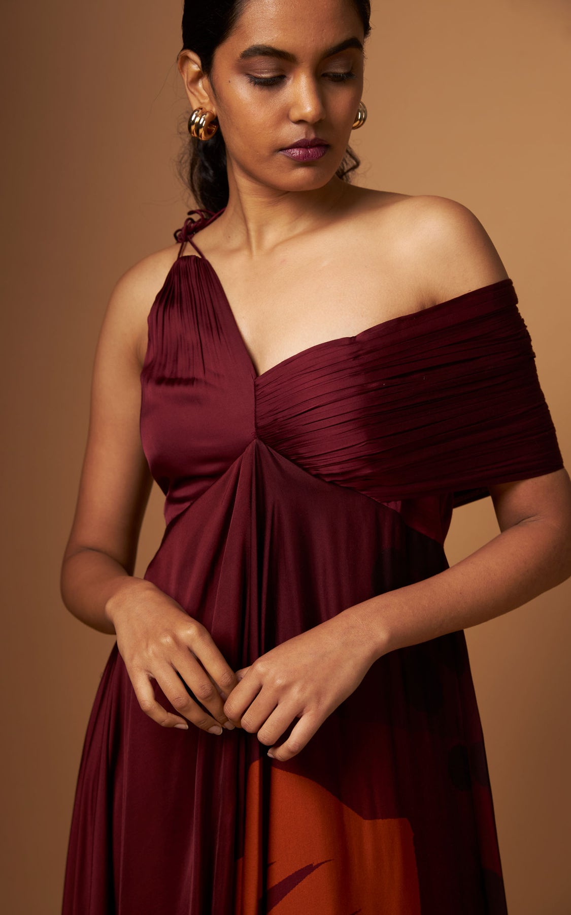 Maroon abstract print one-shoulder drape dress featuring an adjustable tie-up shoulder strap and a hand pleated drop shoulder that elegantly covers the arms.