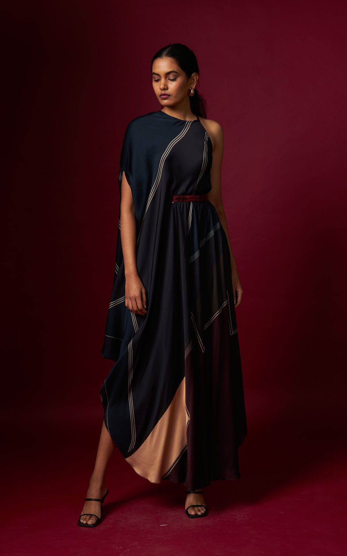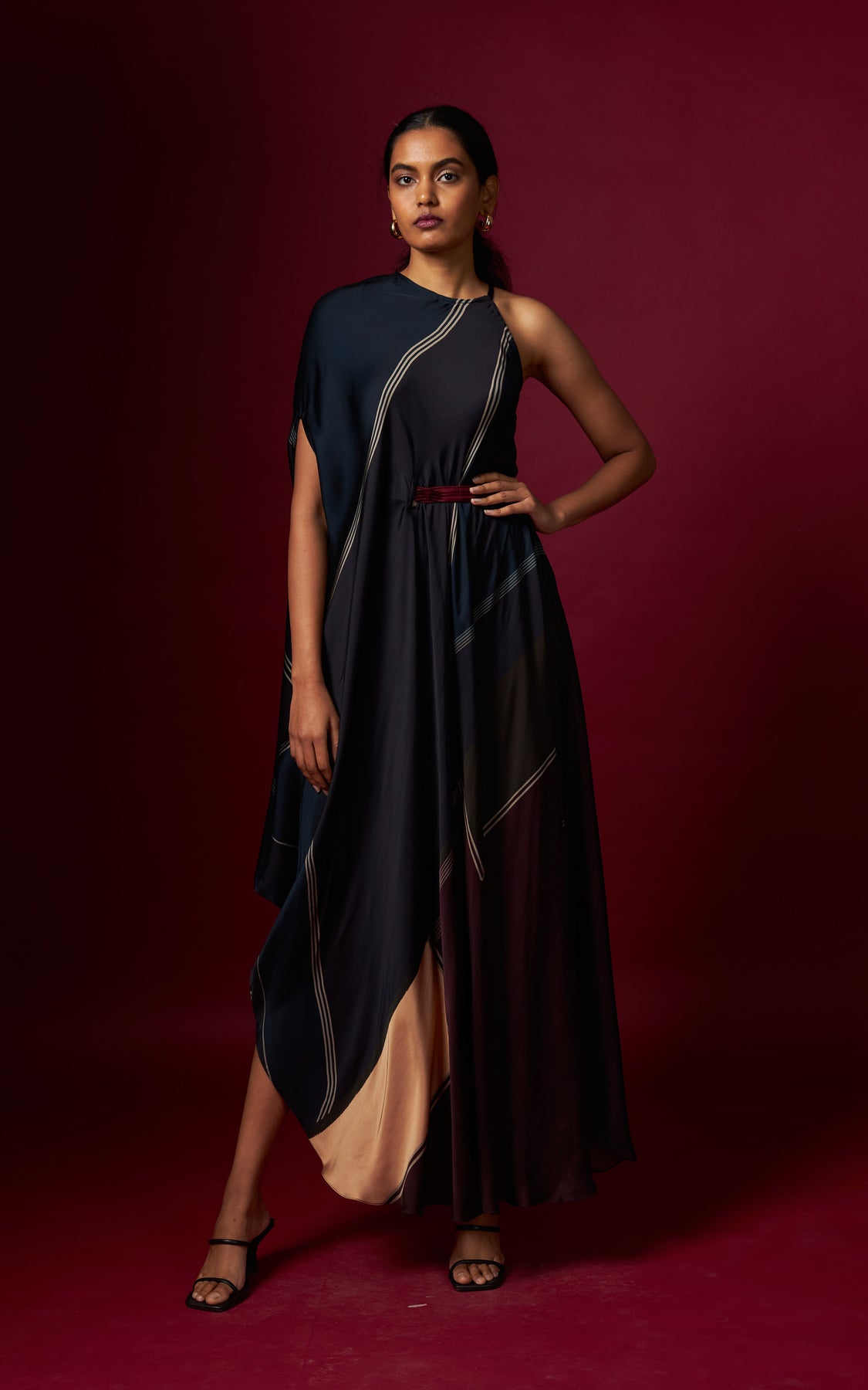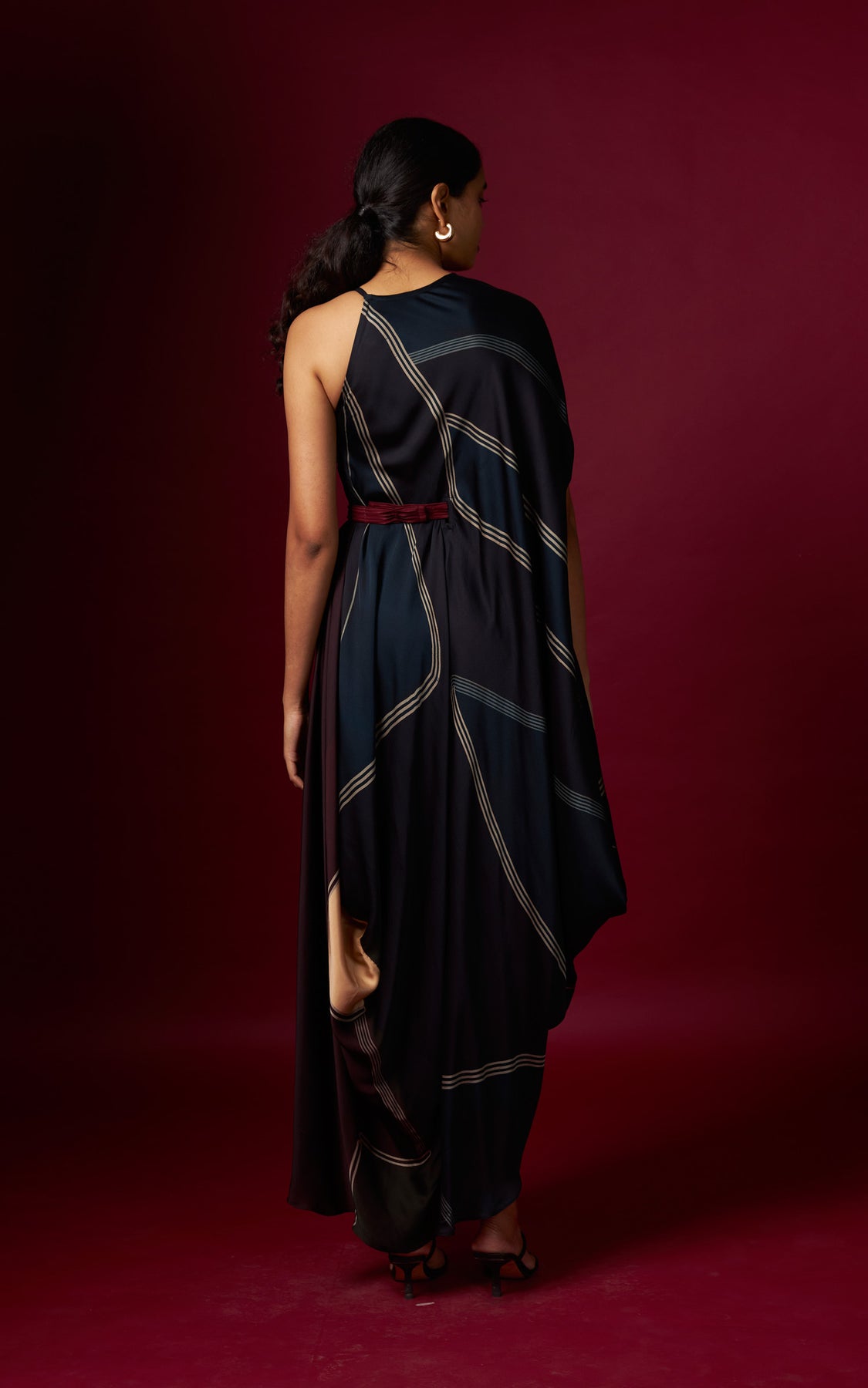 An abstract print incut drape, finished with a detachable belt that cinches the waist on one side for a flattering fit. Crafted in a fluid, flowy silhouette, this style drapes beautifully and complements all body types with effortless elegance.