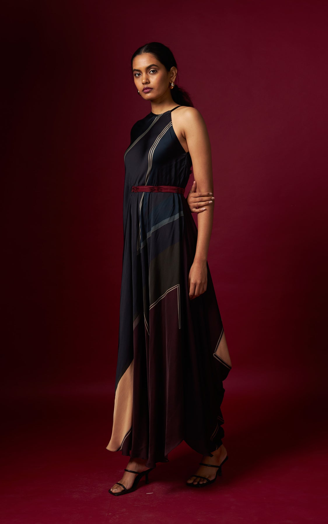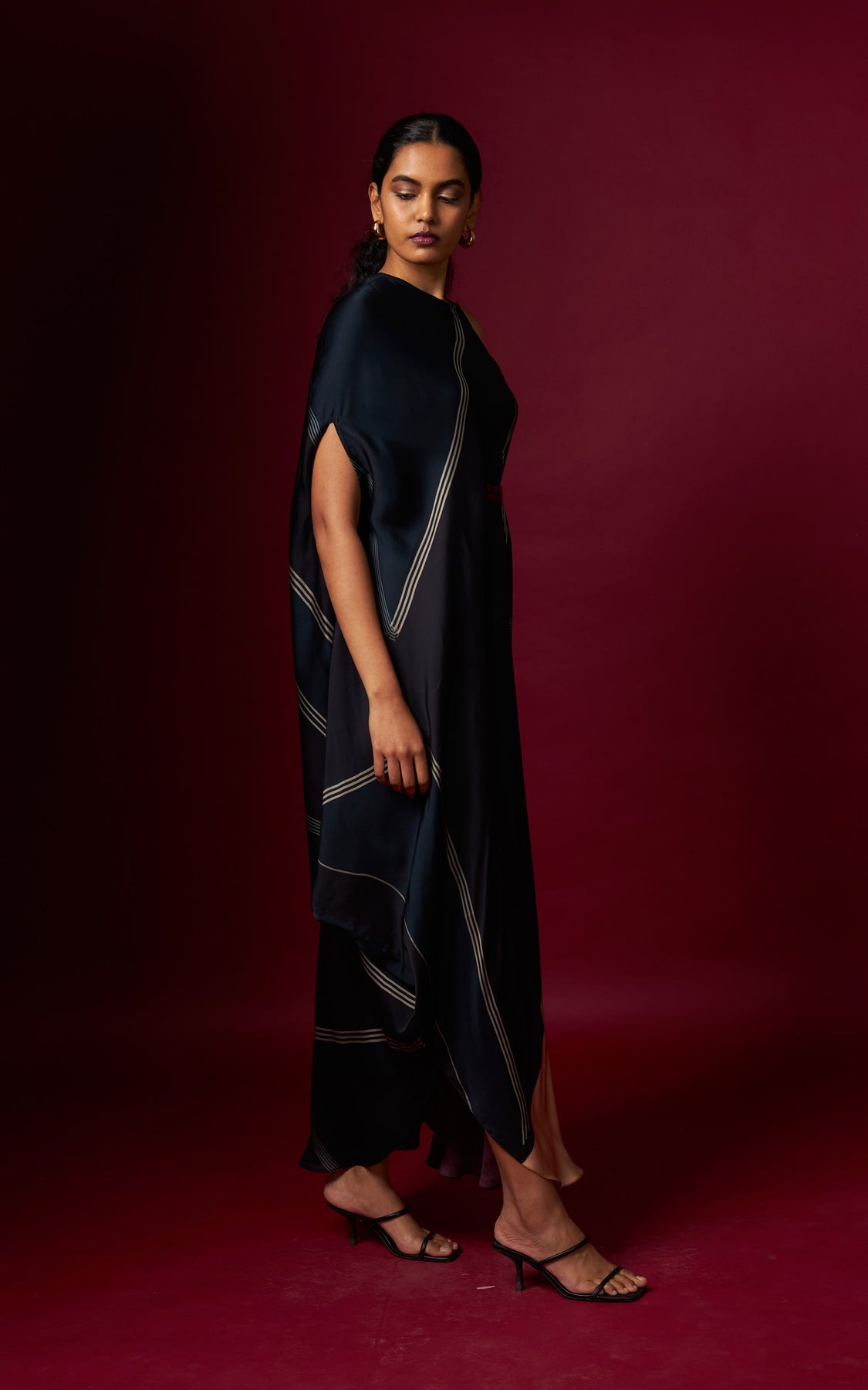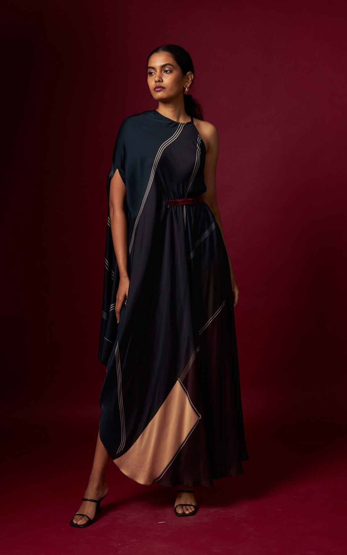 An abstract print incut drape, finished with a detachable belt that cinches the waist on one side for a flattering fit. Crafted in a fluid, flowy silhouette, this style drapes beautifully and complements all body types with effortless elegance.