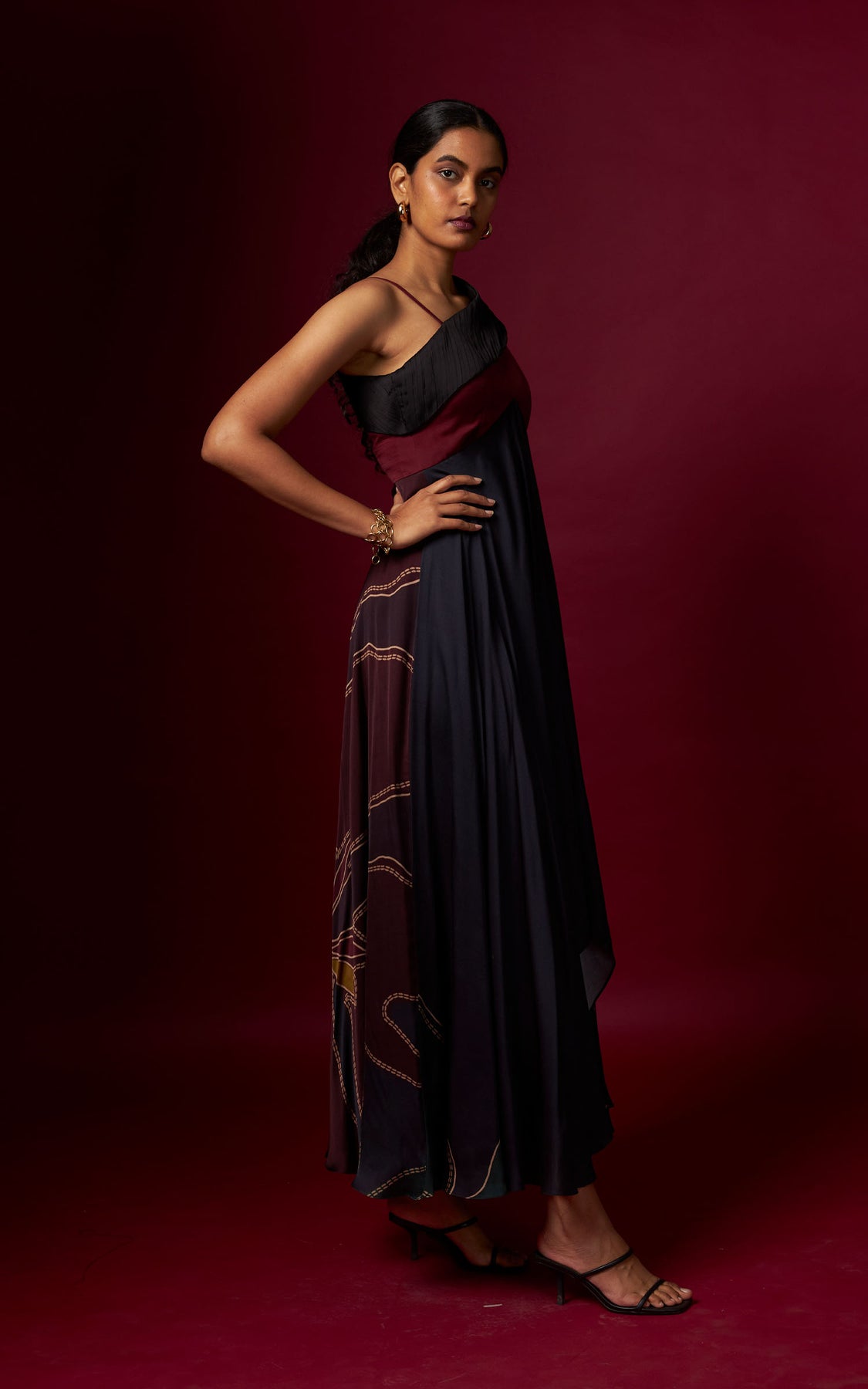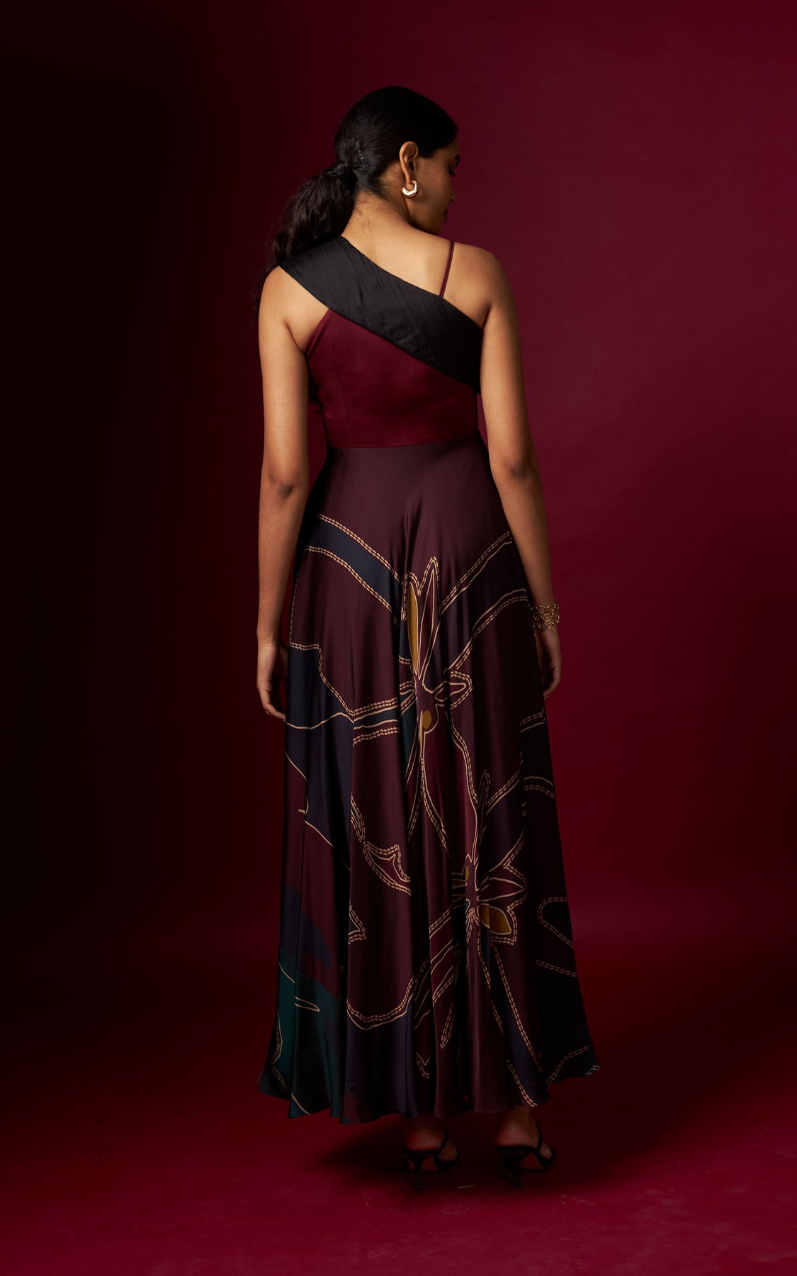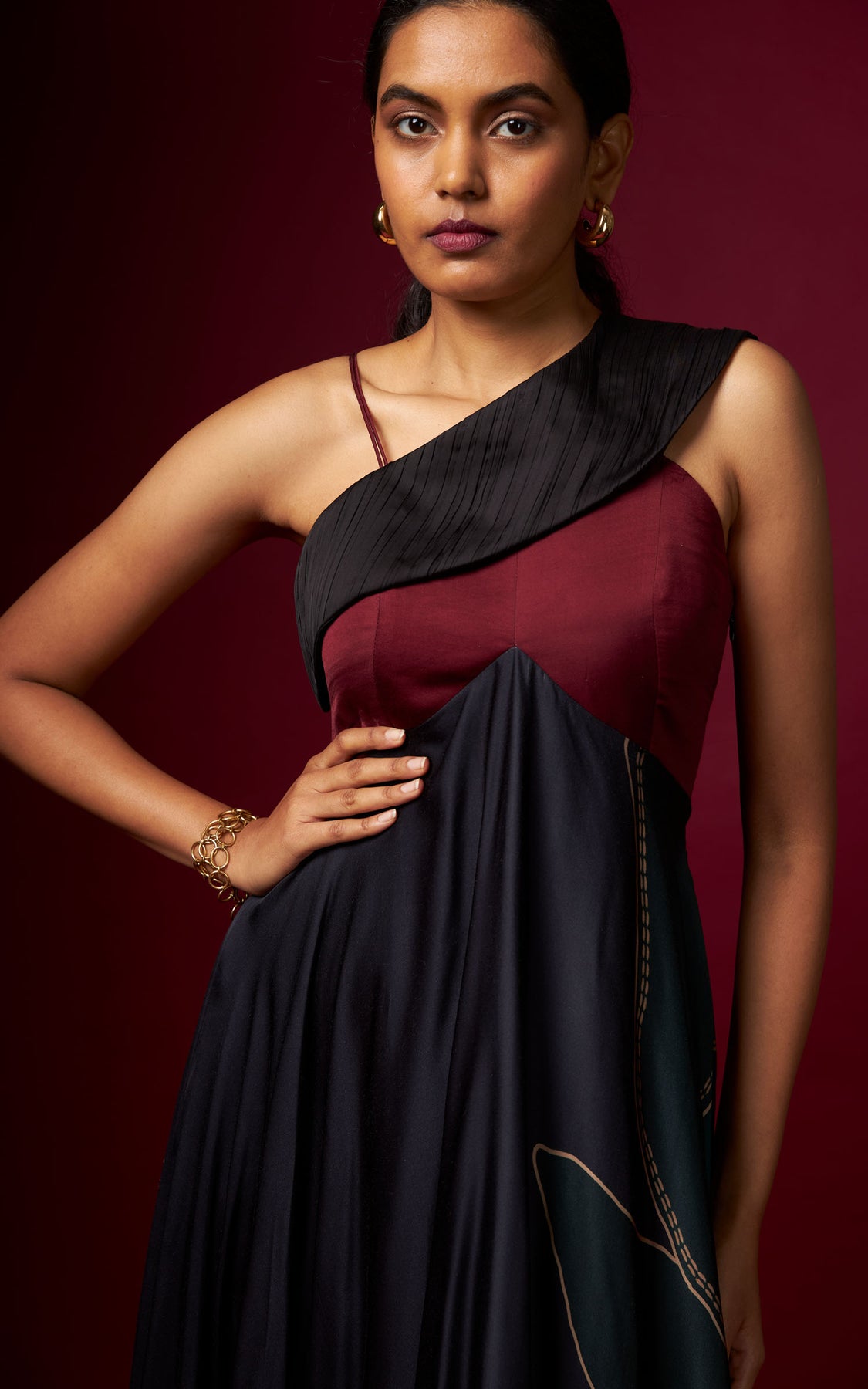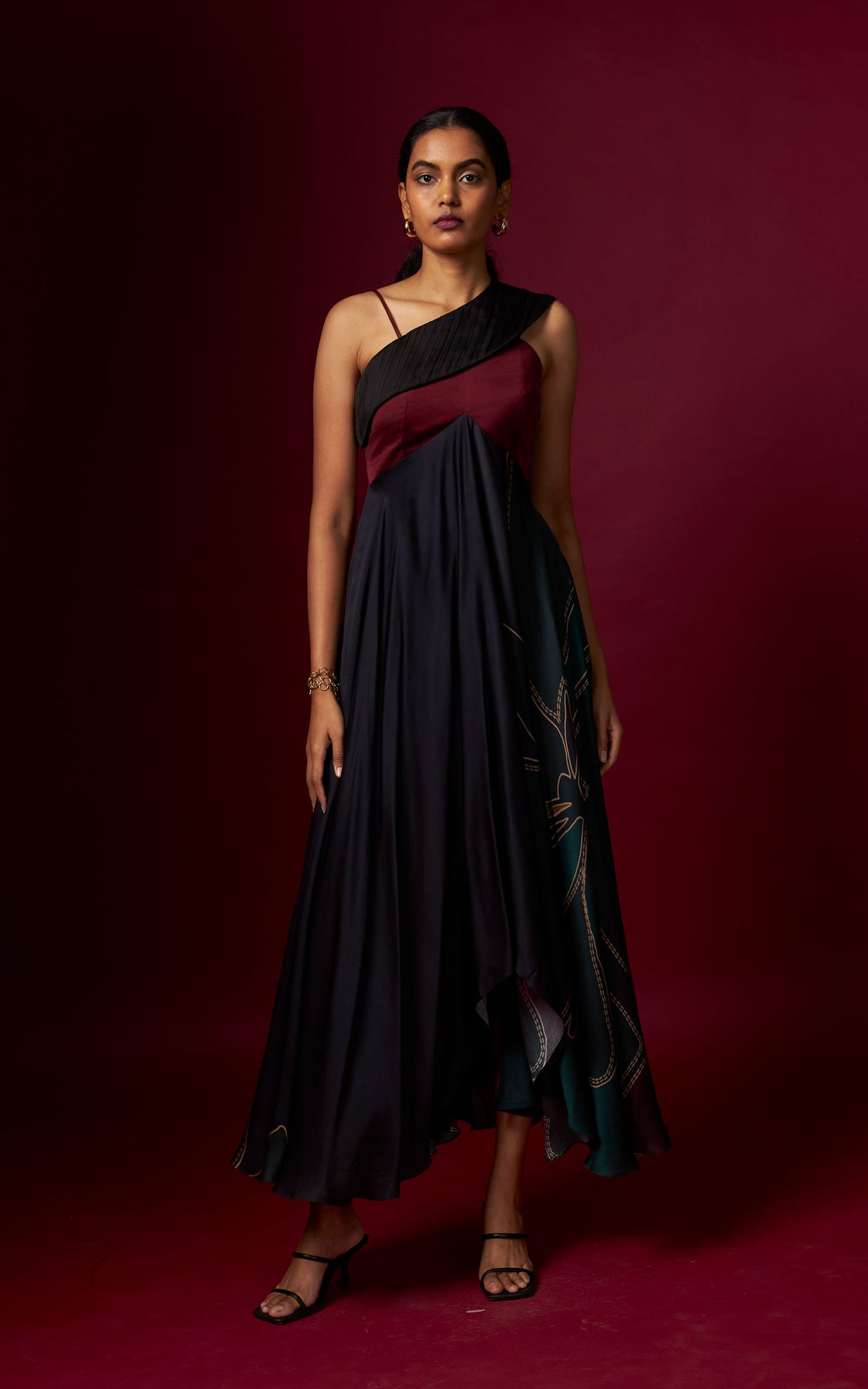 This abstract print one-shoulder dress is designed with an asymmetric hemline and intricate hand-pleating on the yoke for added texture and movement.