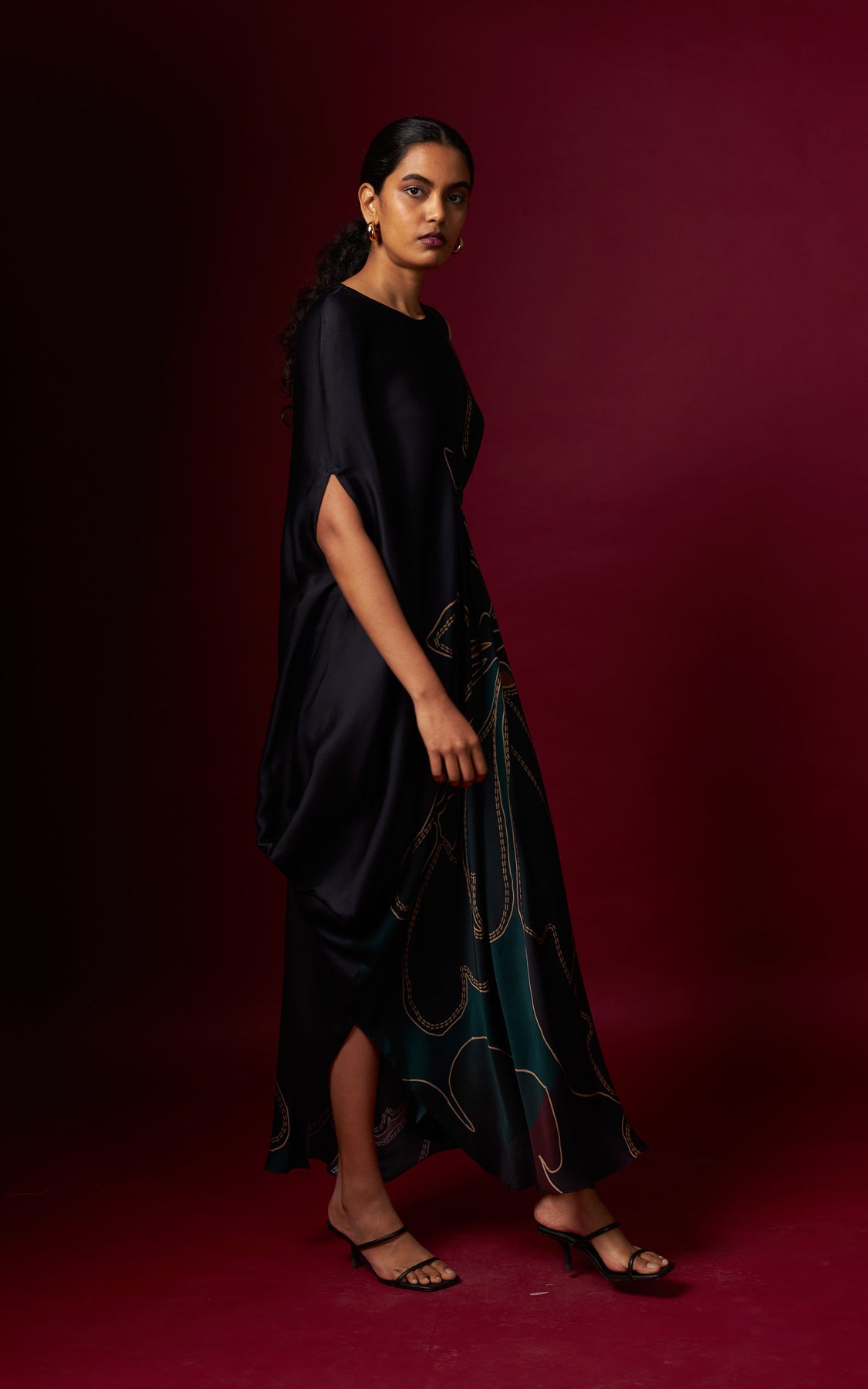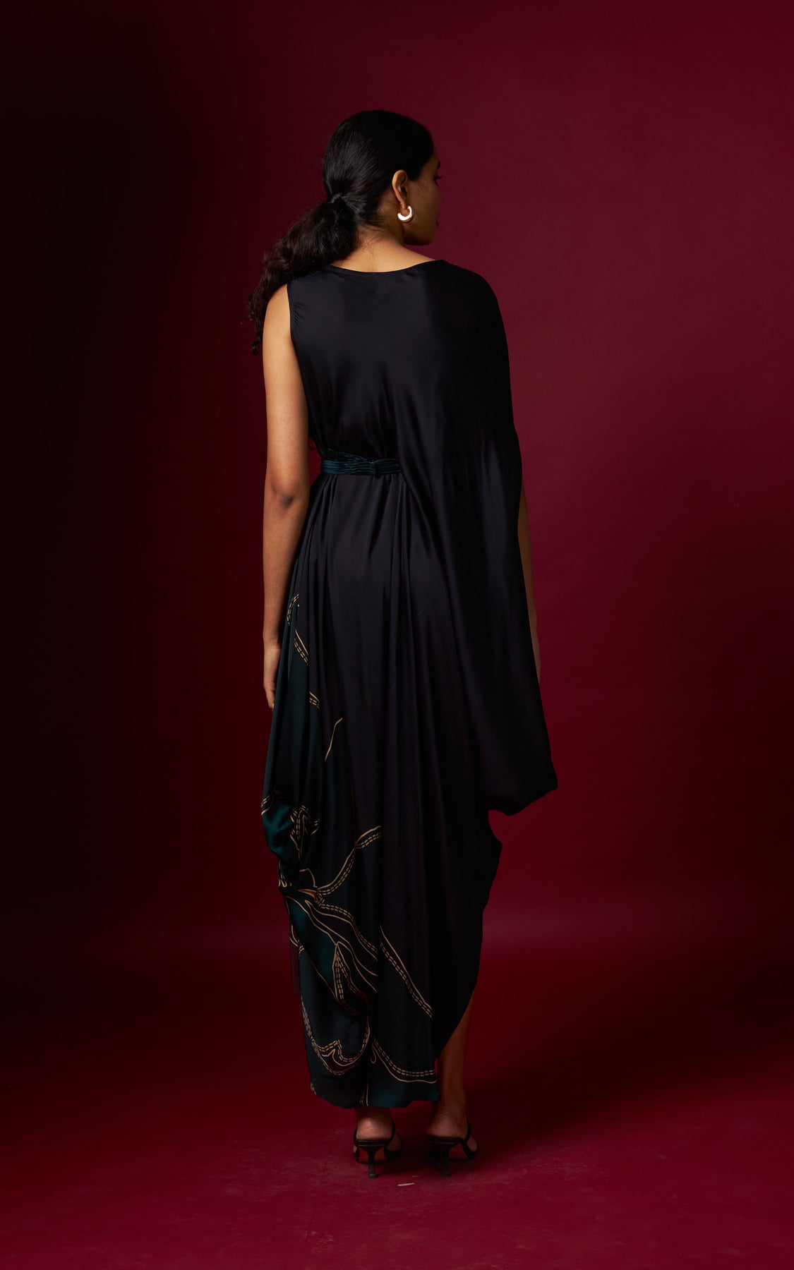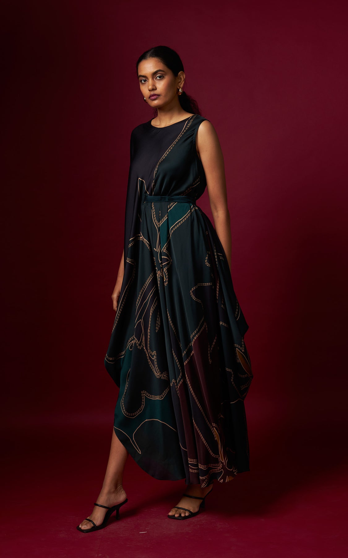 Abstract print sleeveless drape, finished with a detachable belt that cinches the waist on one side for a flattering fit. Designed in a fluid, flowy silhouette, this style drapes beautifully and complements all body types with effortless elegance.