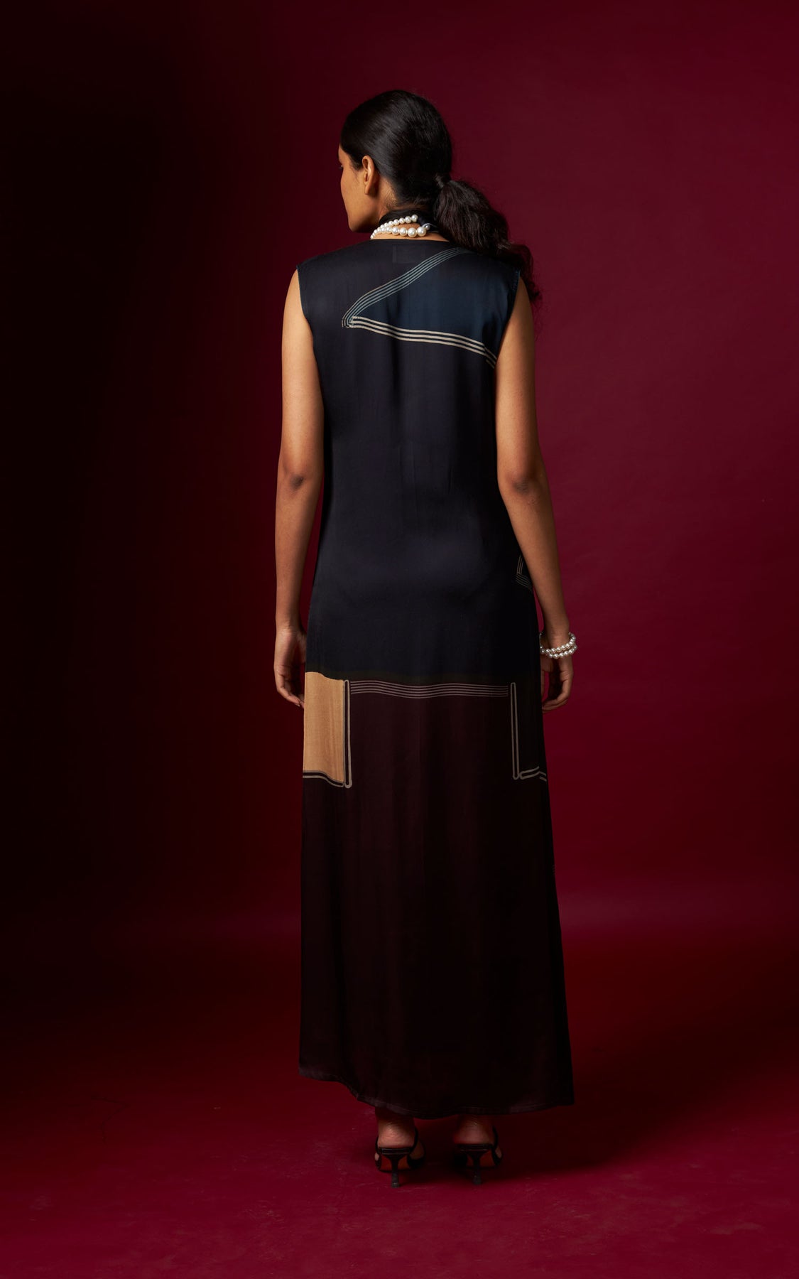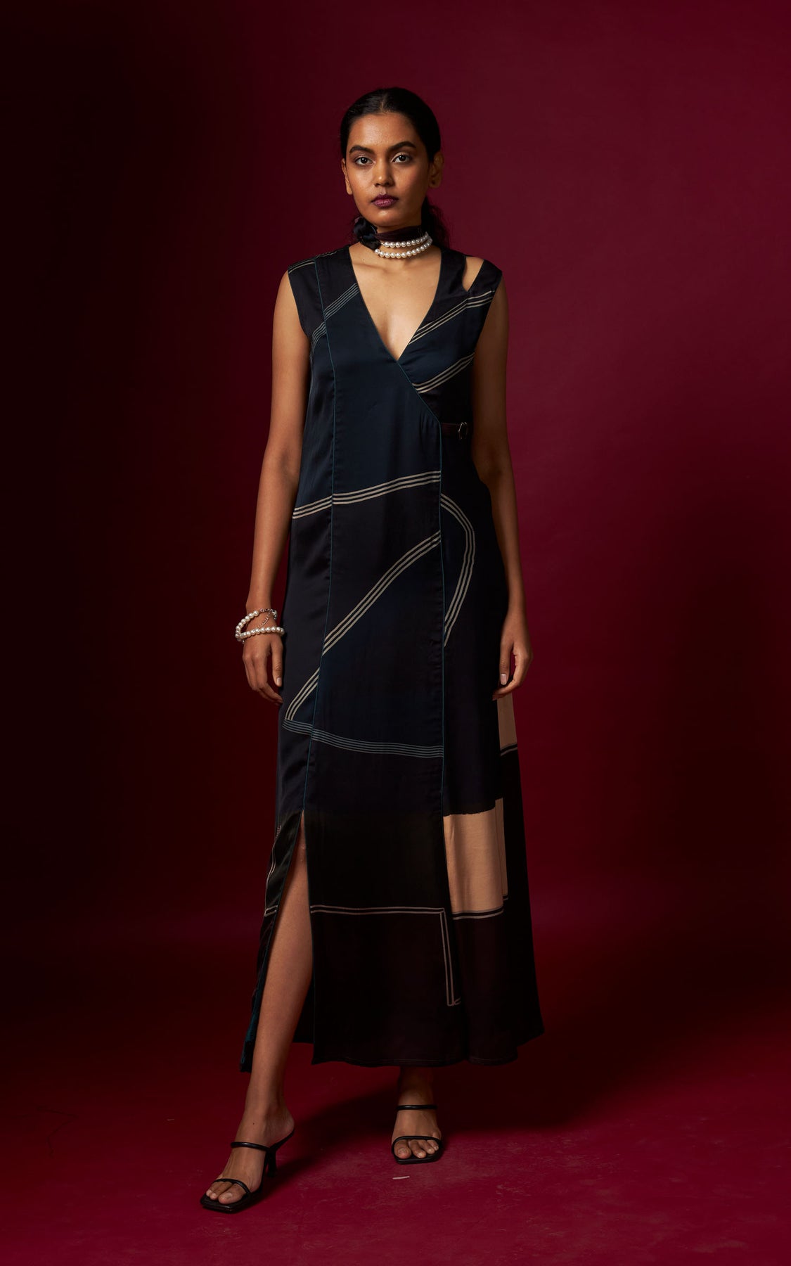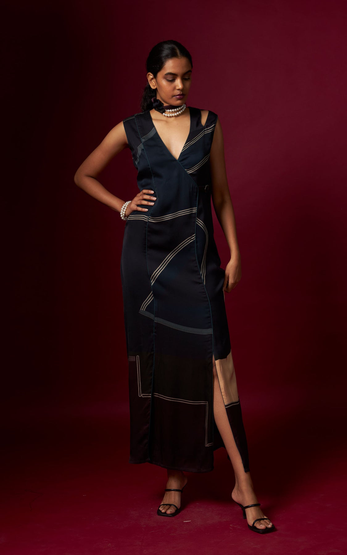 An abstract print paneled overlap dress with subtle cut-out shoulder detailing, finished with a statement side buckle belt for a contemporary edge.