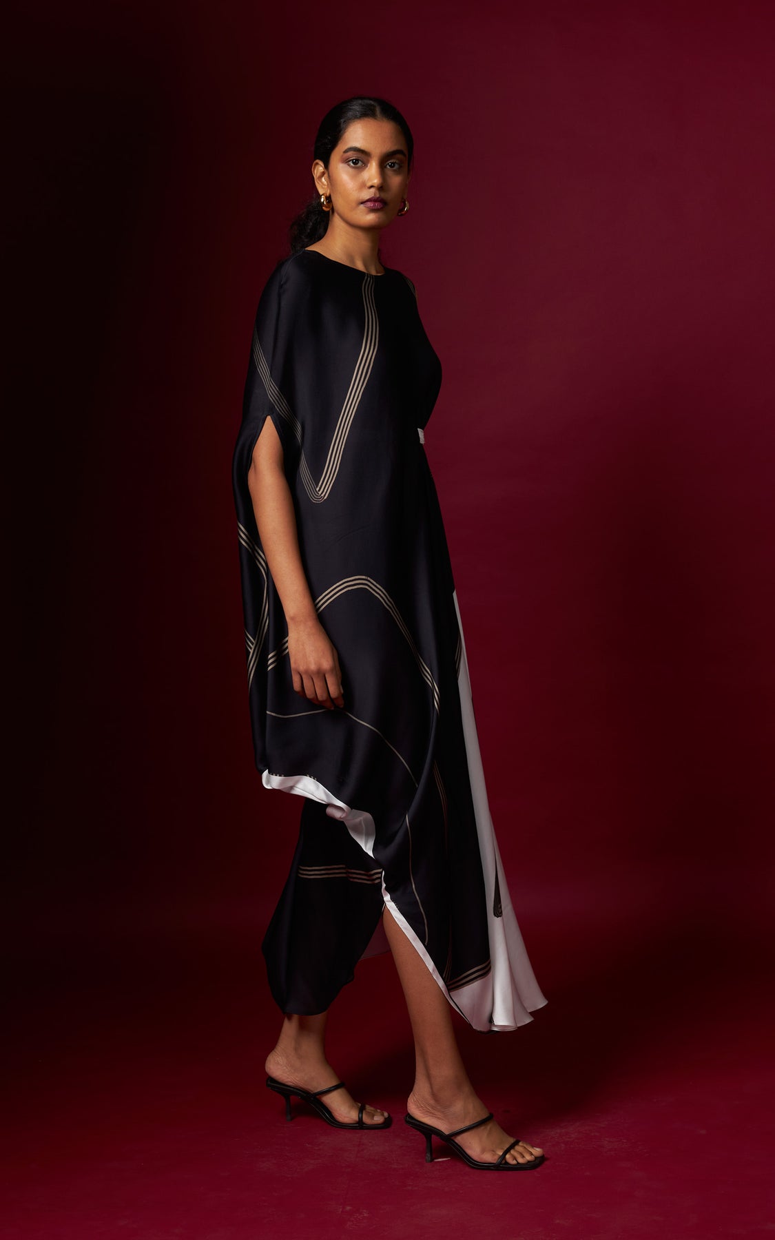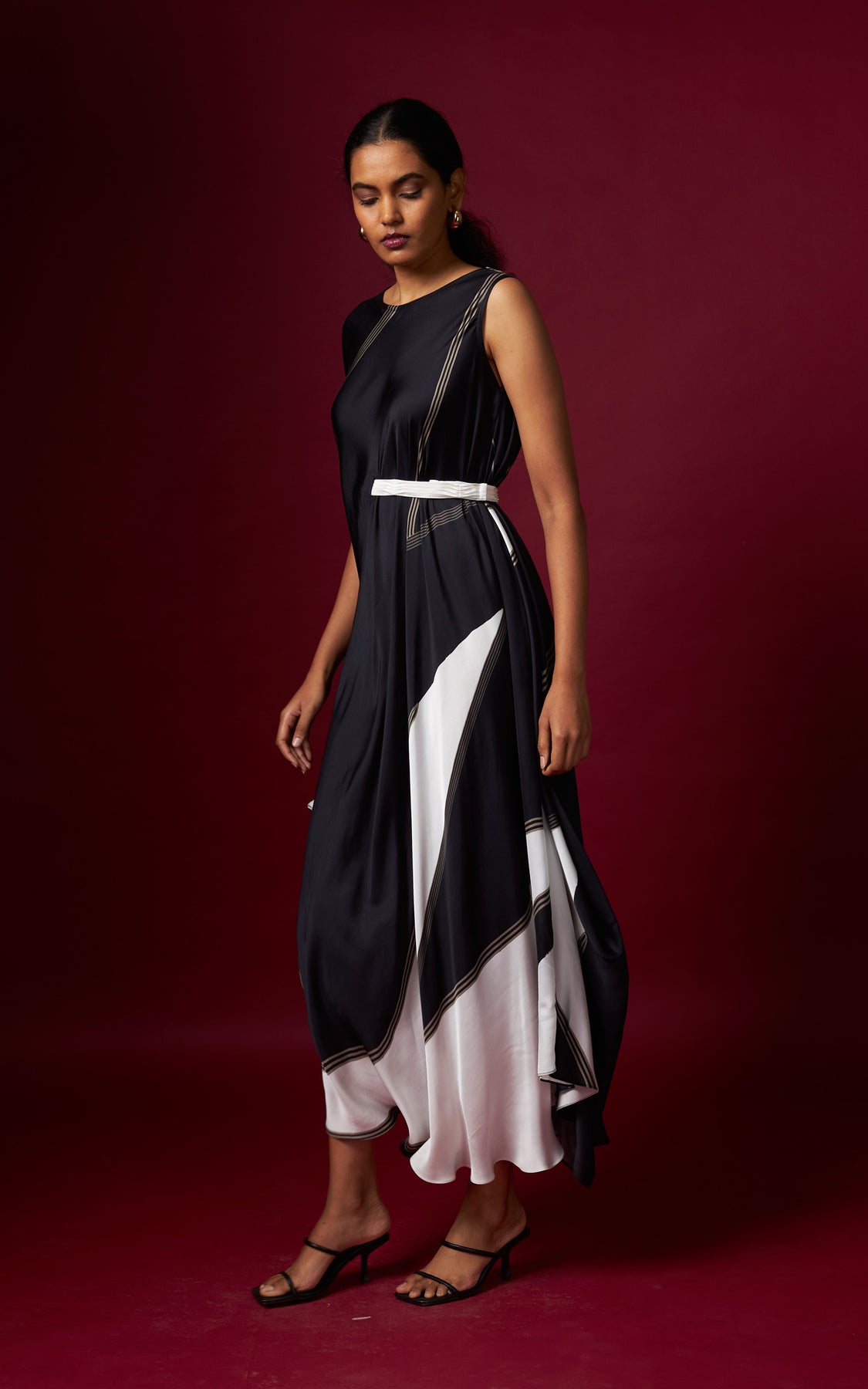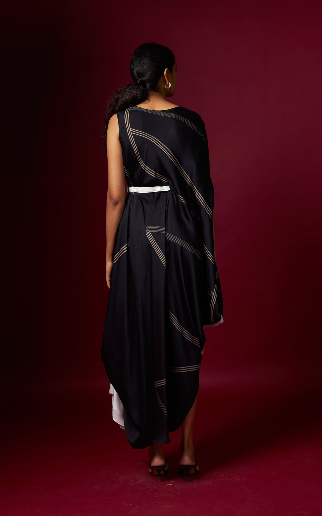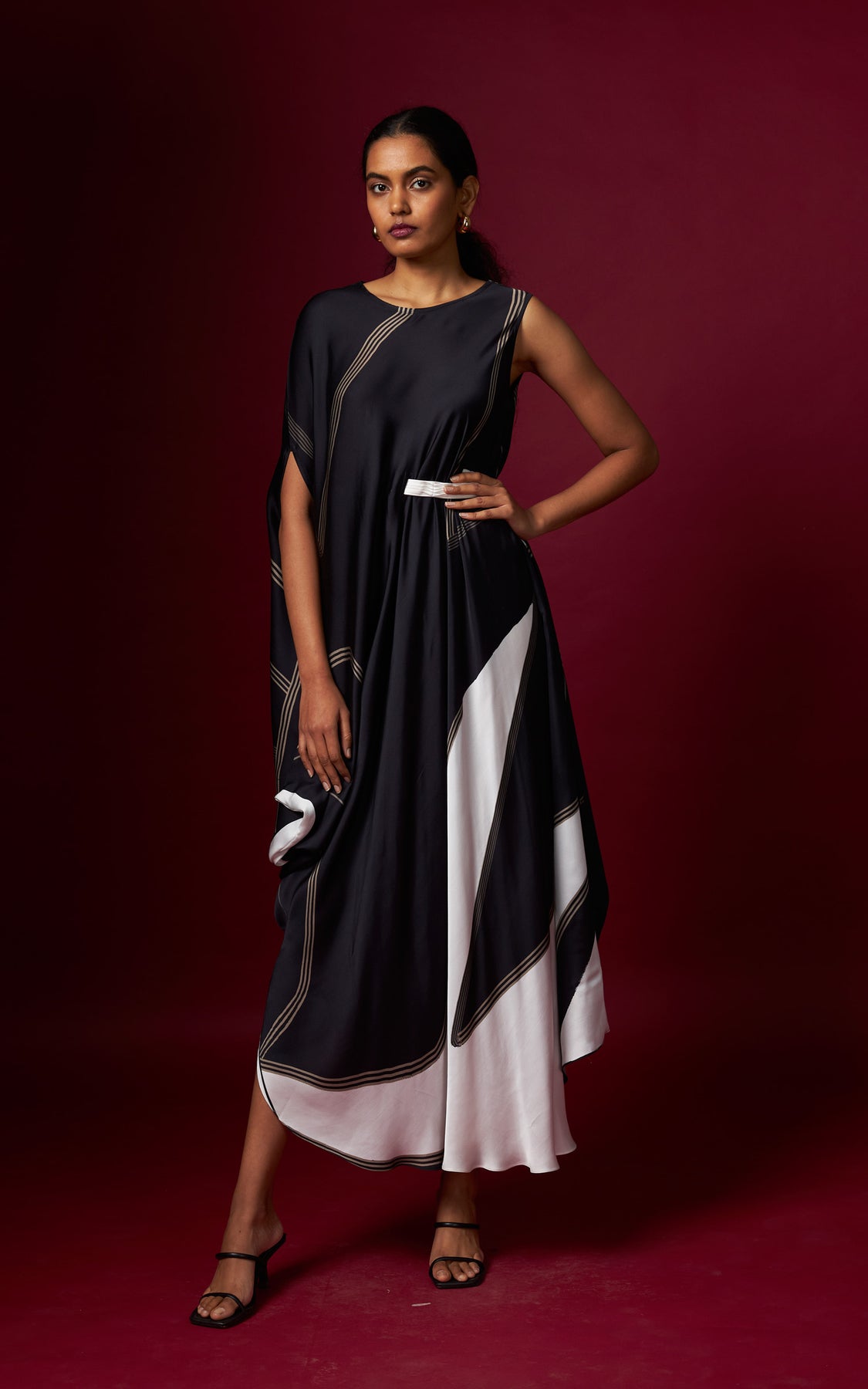 A black and white abstract printed sleeveless drape, finished with a detachable belt that cinches the waist on one side for a flattering fit. Designed in a fluid, flowy silhouette, this style drapes beautifully and complements all body types with effortless elegance..