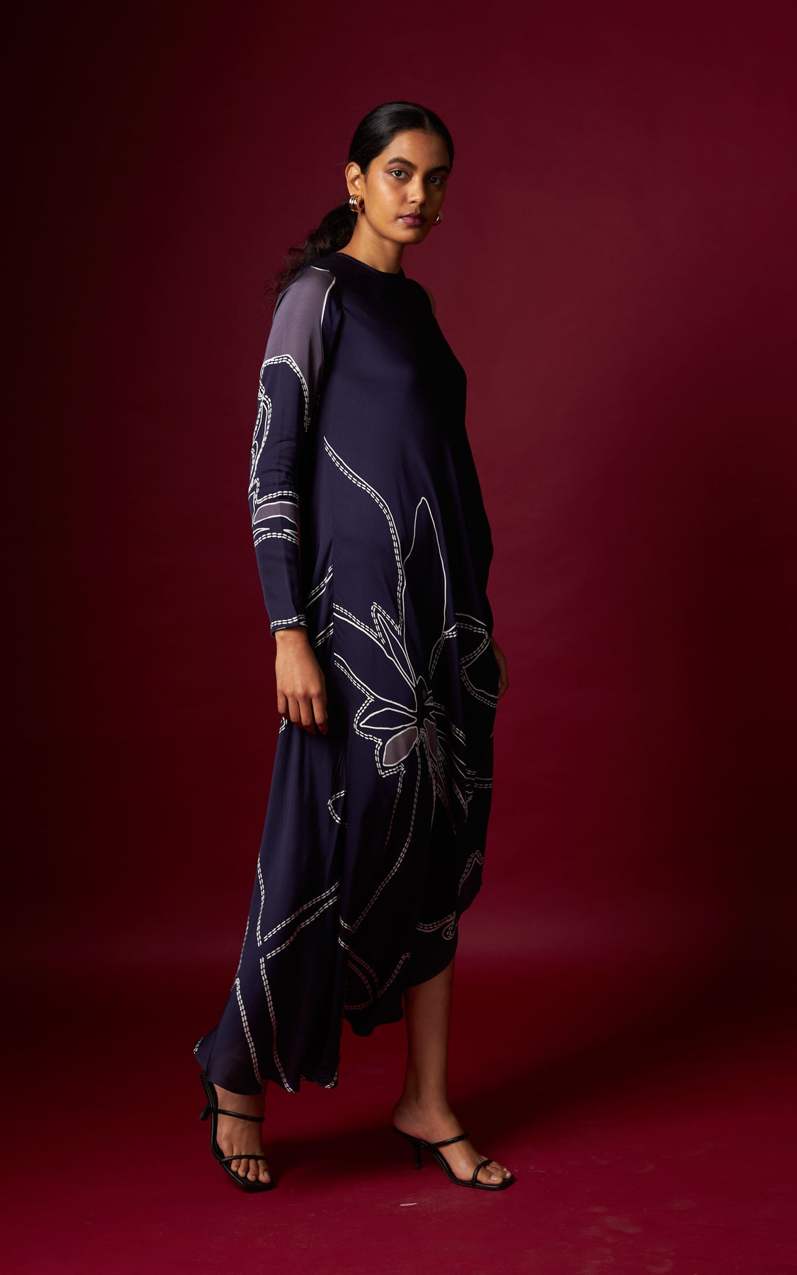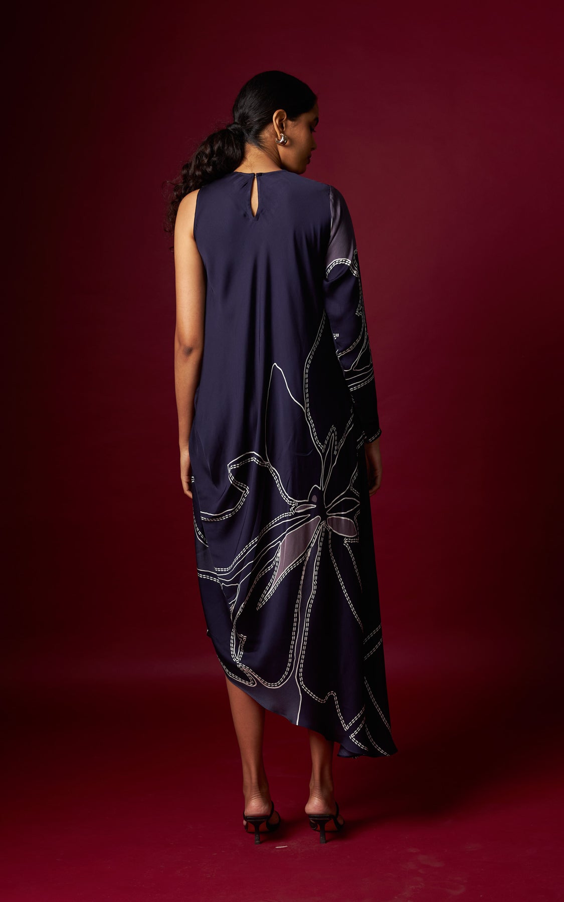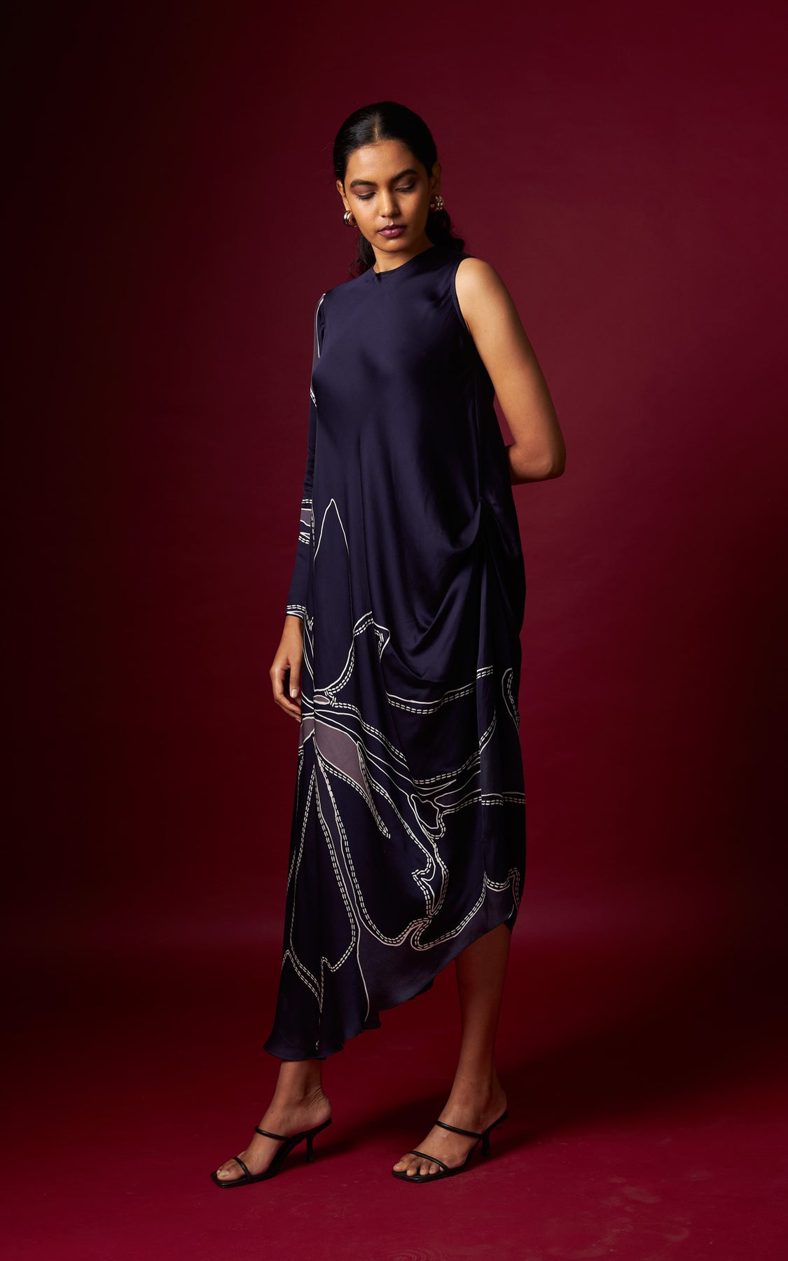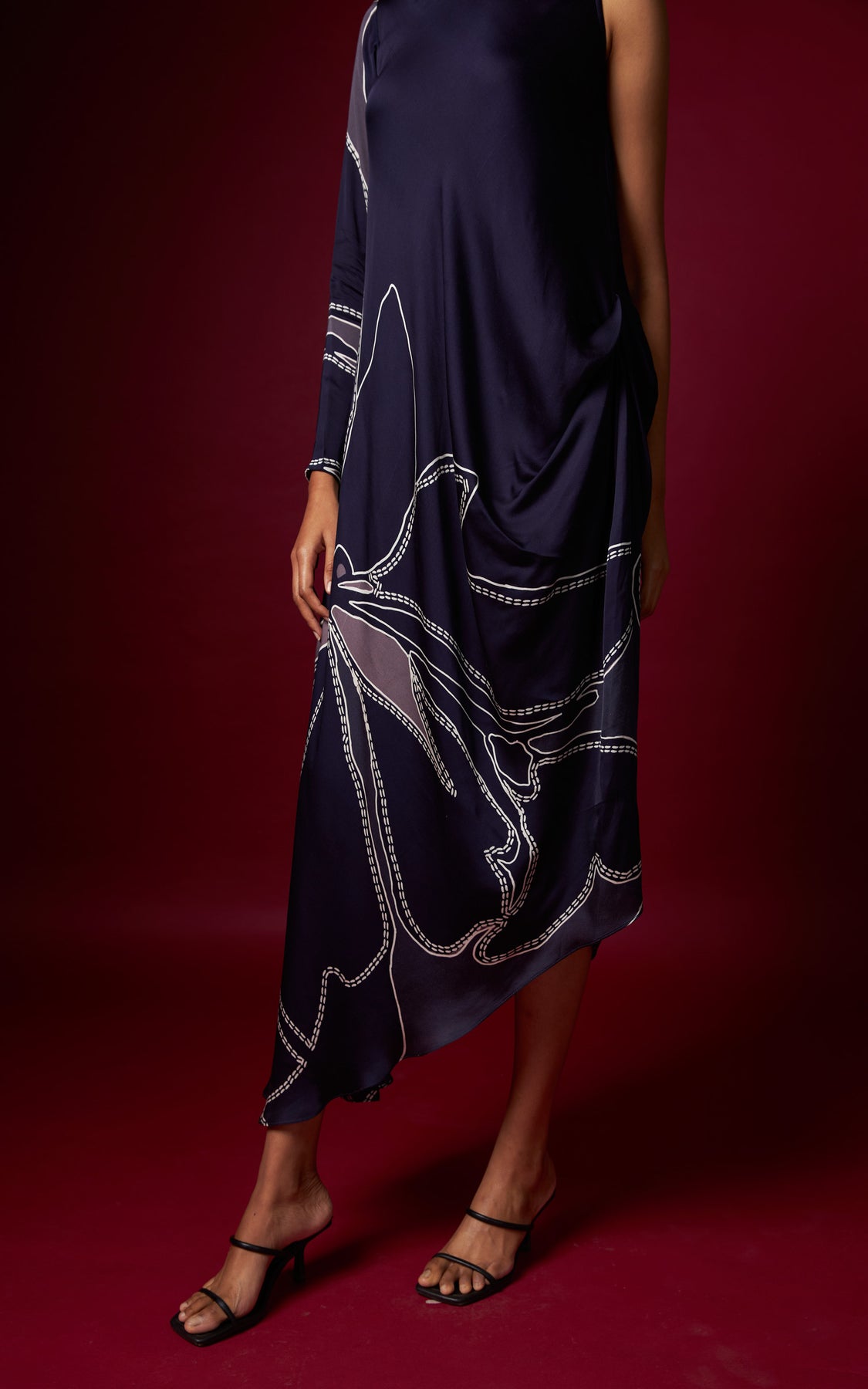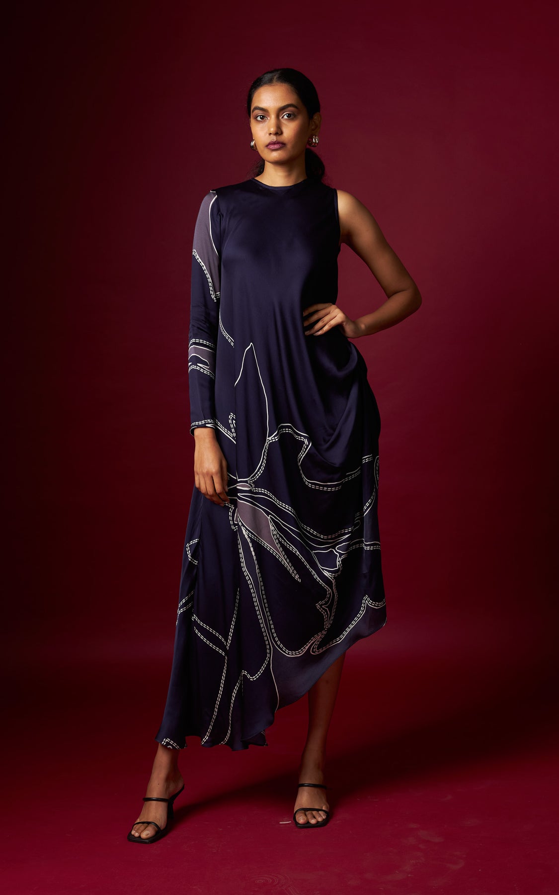 An abstract print signature drape dress featuring a one-sided sleeve and a statement asymmetric hemline.