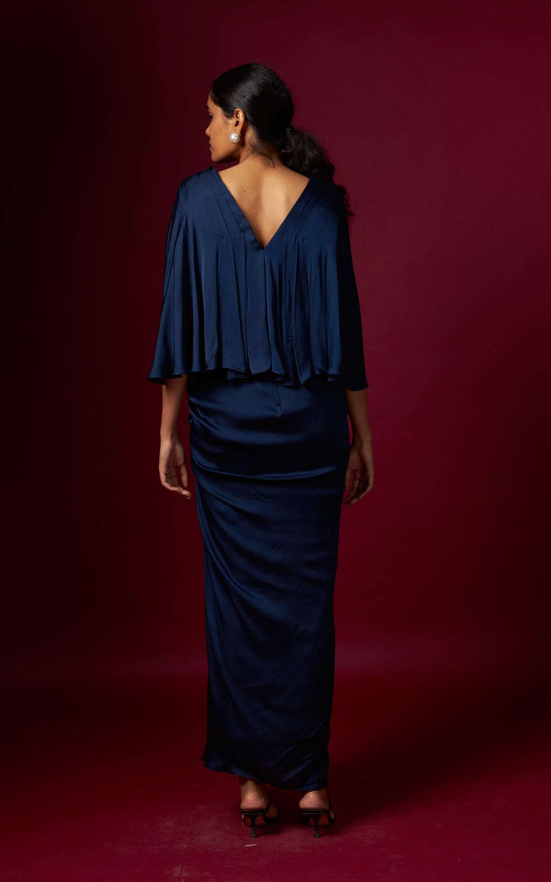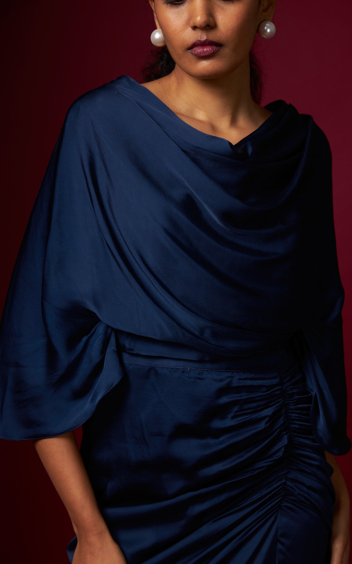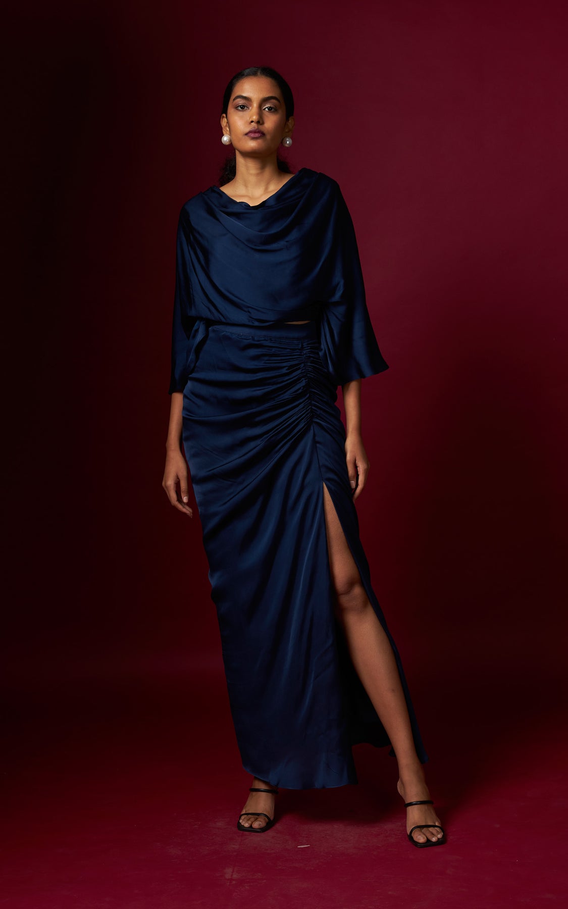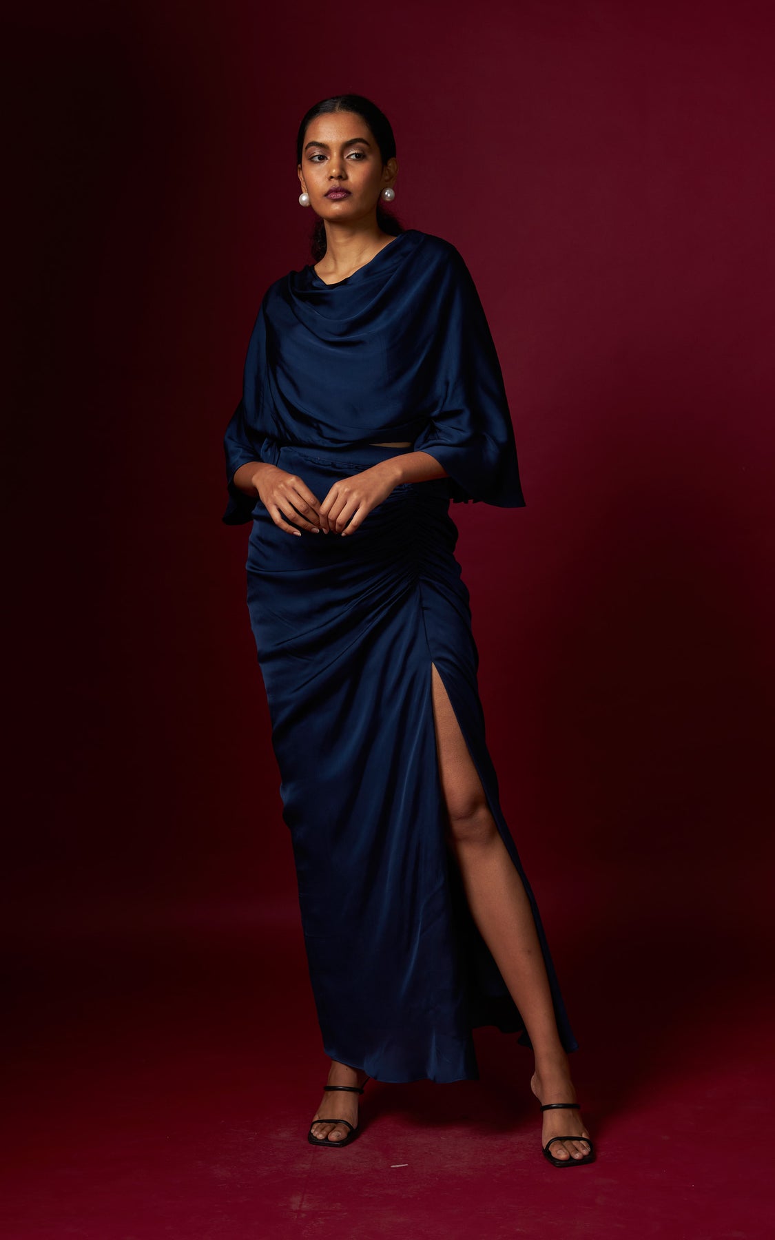 A blue cowl-style top paired with flare sleeves and a draped skirt featuring pleated detailing and a statement side slit.