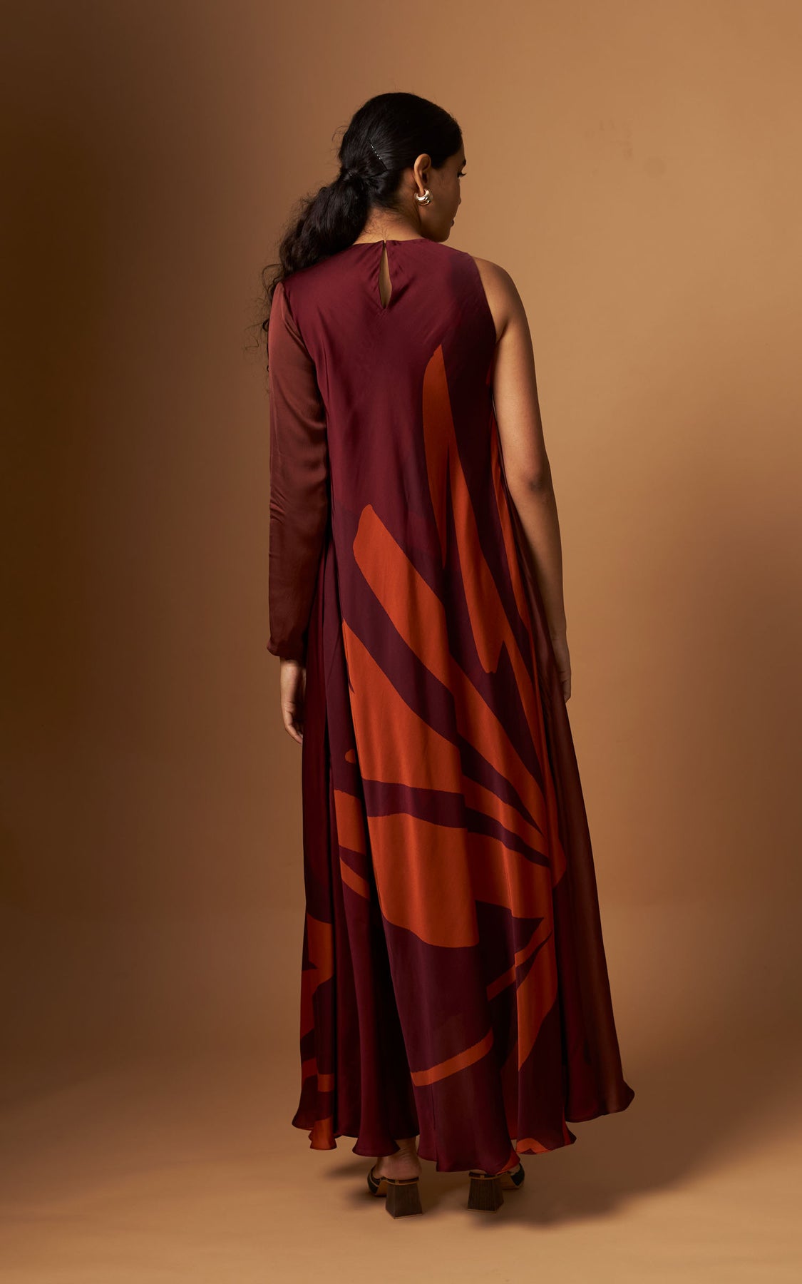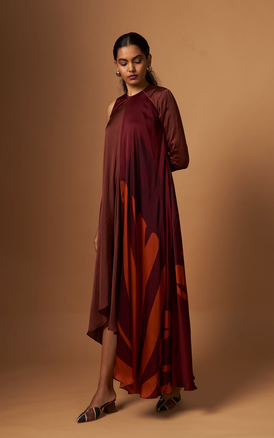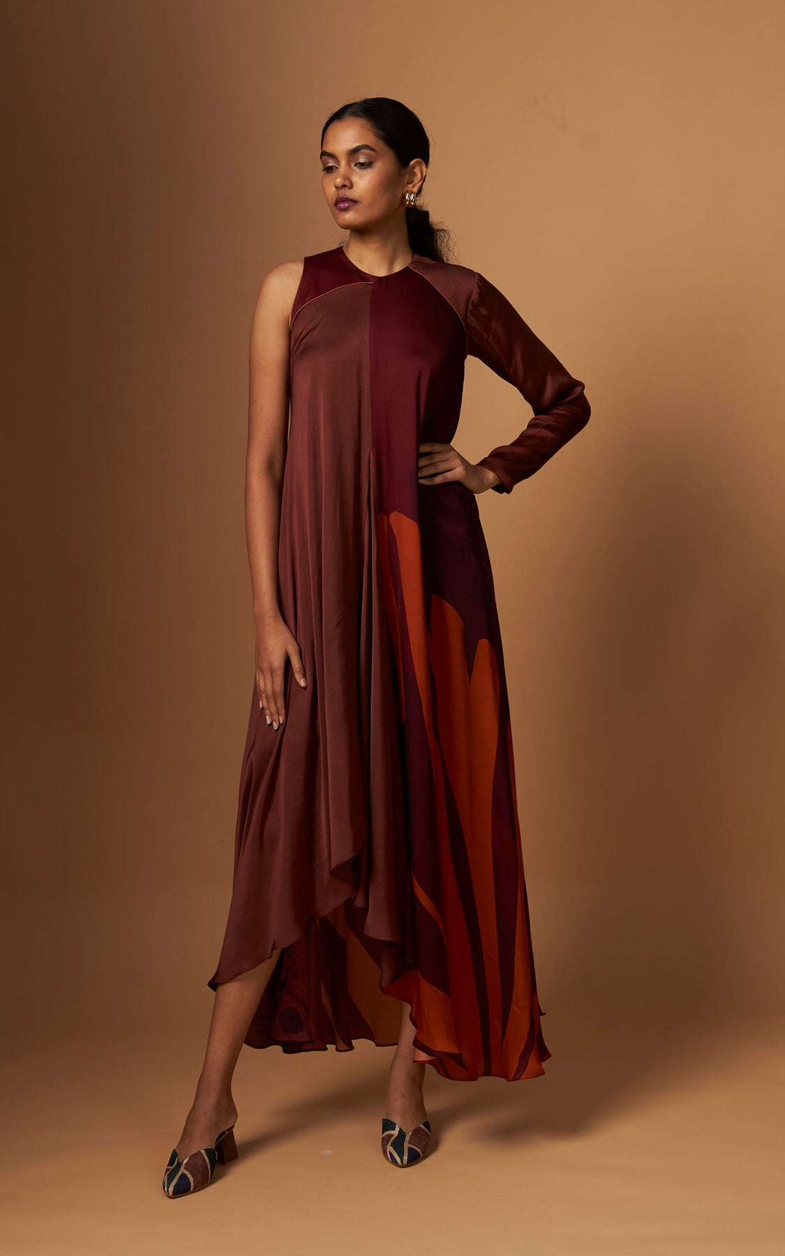 An abstract print incut flowy dress featuring a one-sided sleeve and a statement asymmetric hemline.