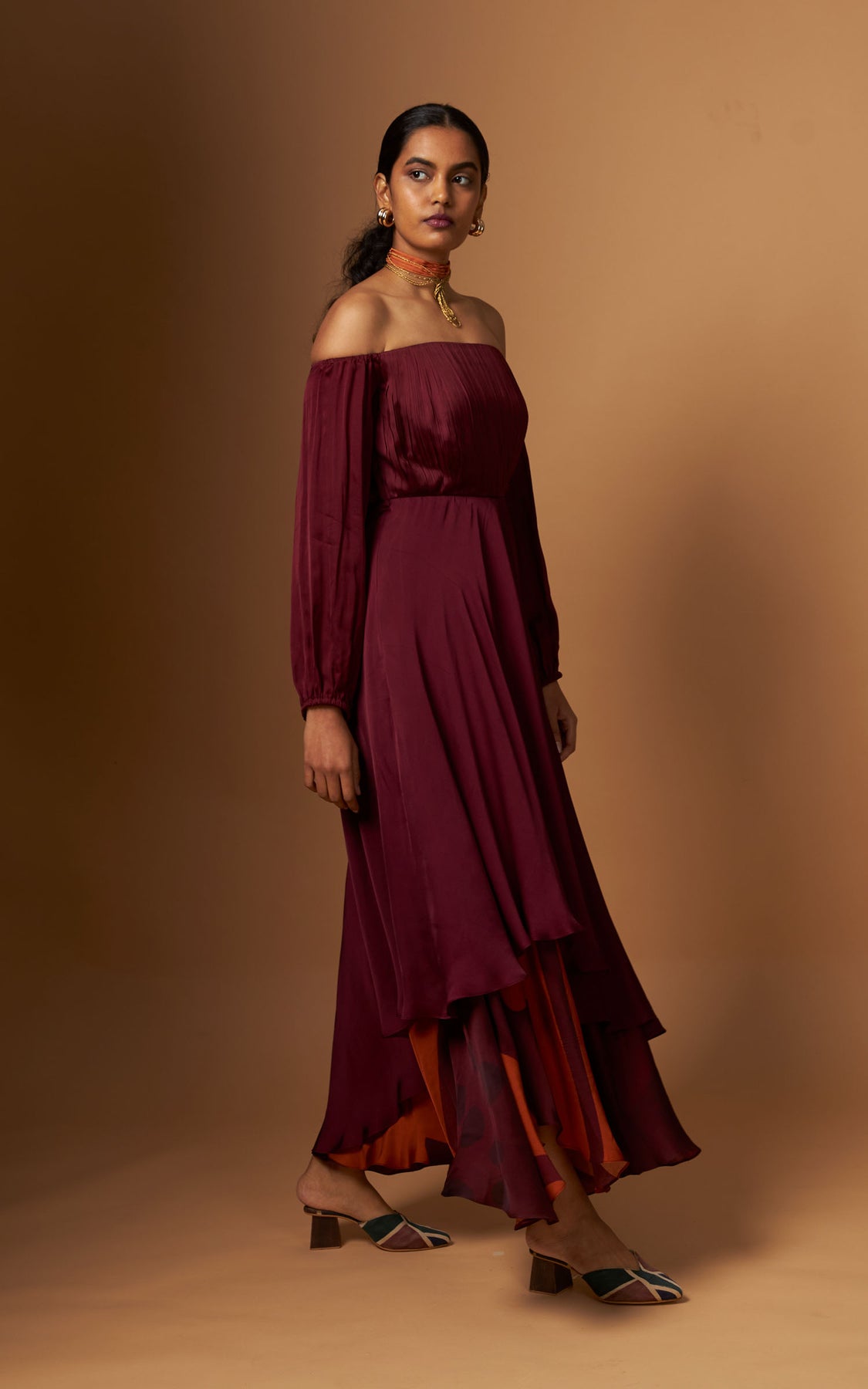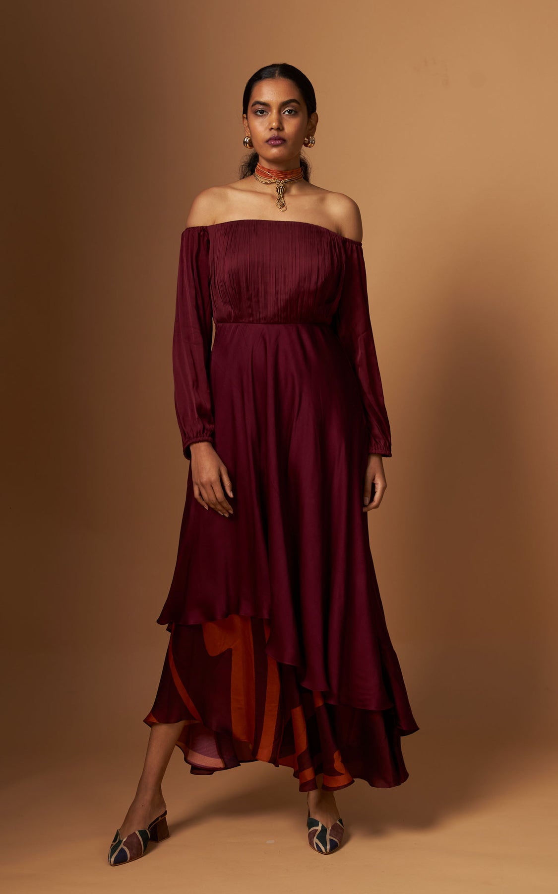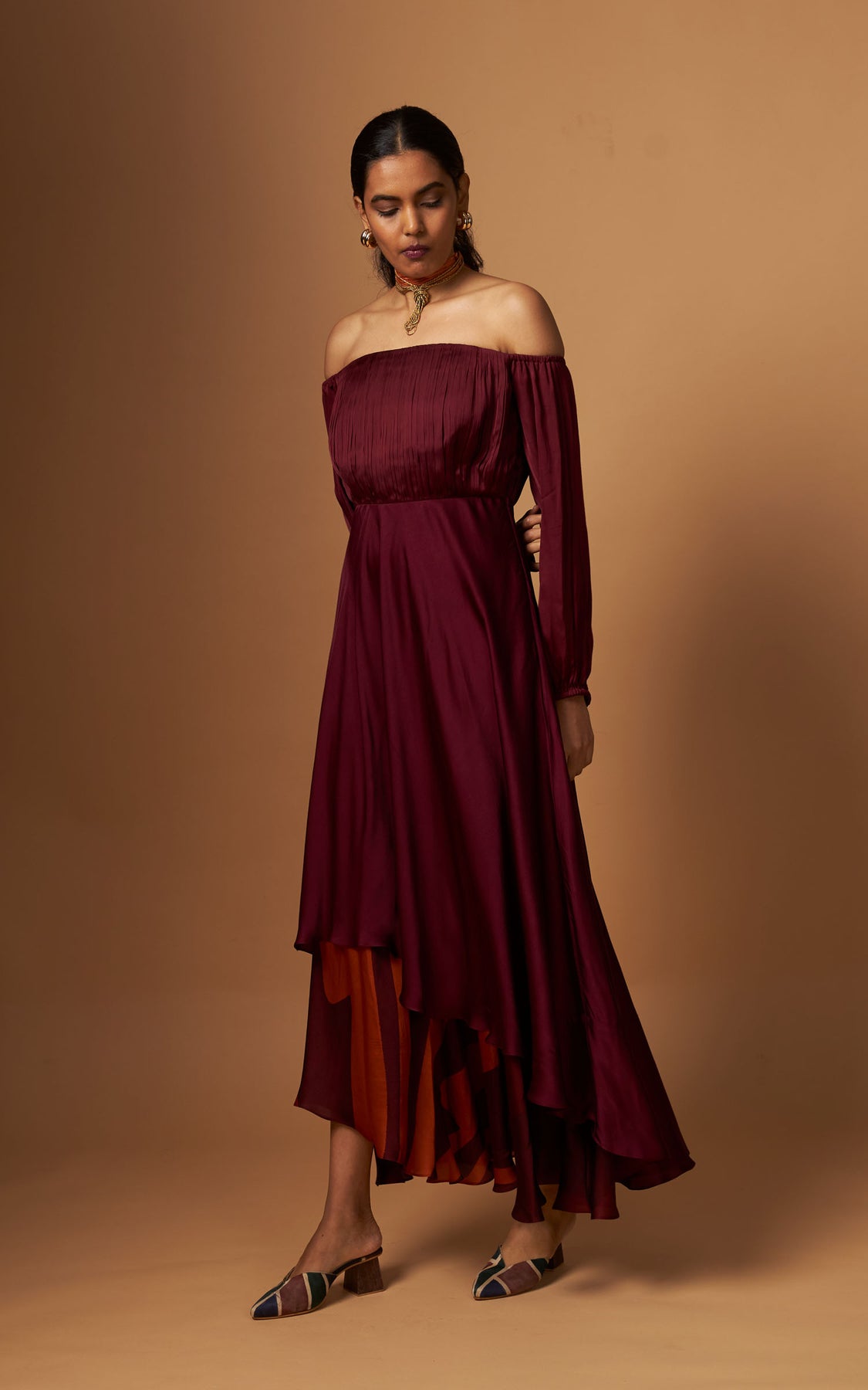 An off-shoulder dress with delicate pleating on the yoke and a fluid asymmetric layered hemline detailed with our abstract print.