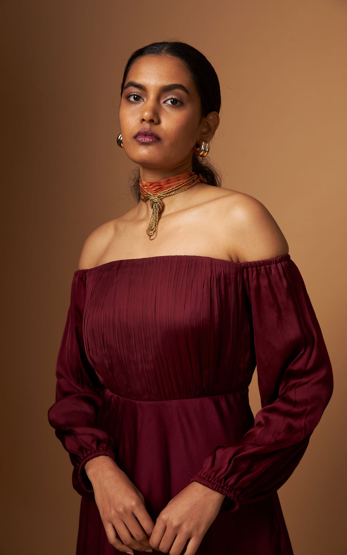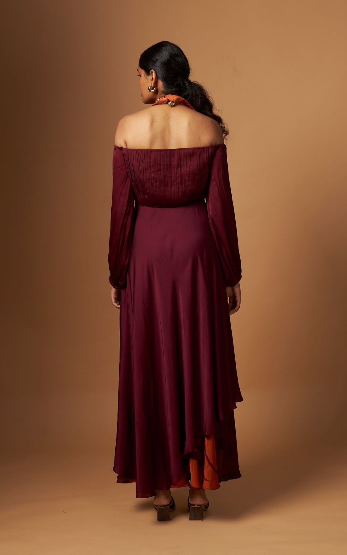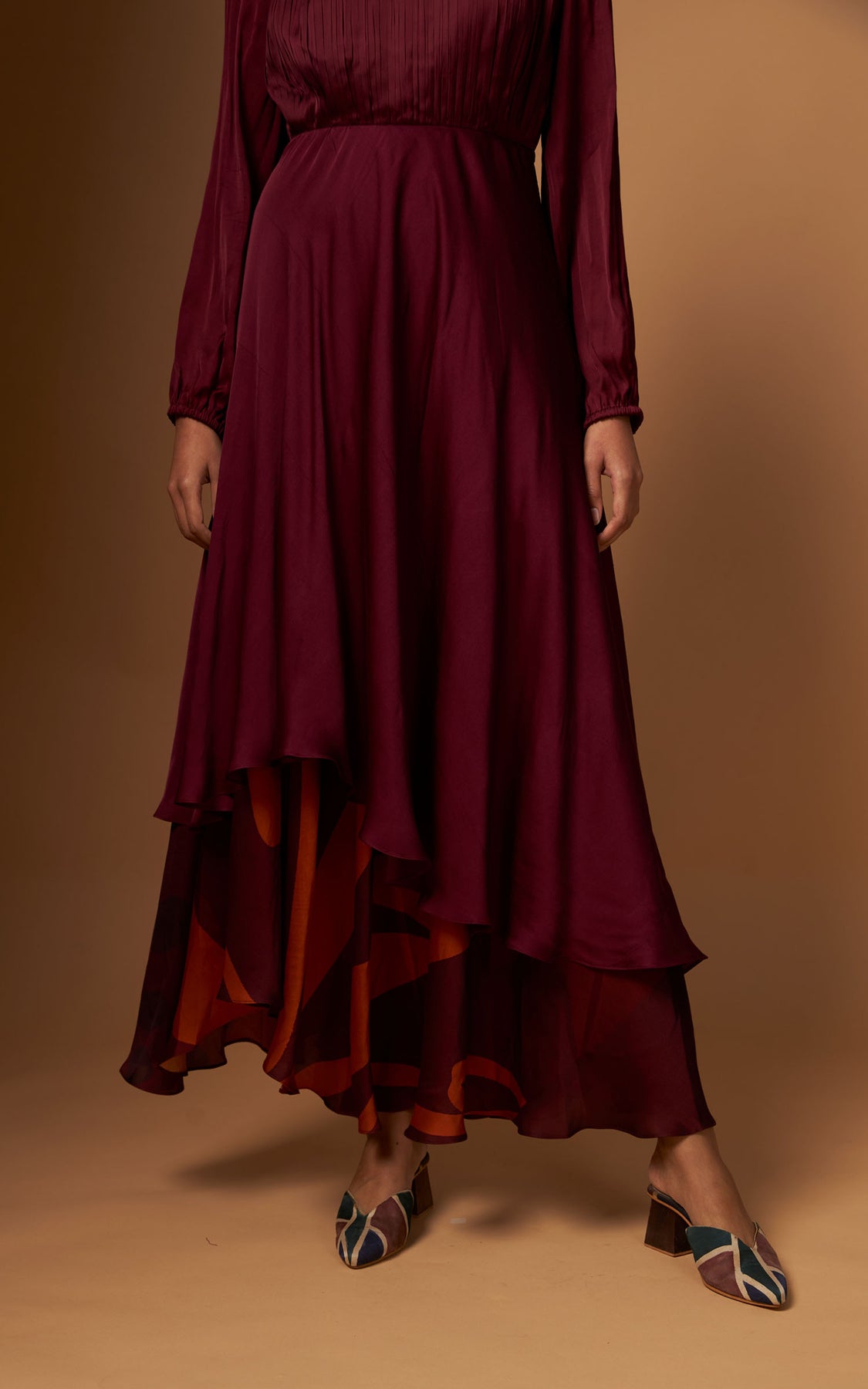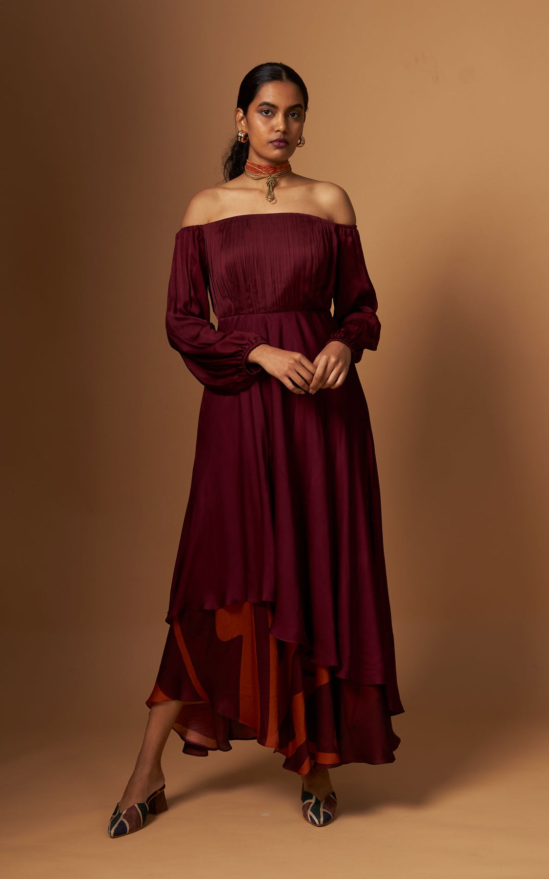 An off-shoulder dress with delicate pleating on the yoke and a fluid asymmetric layered hemline detailed with our abstract print.