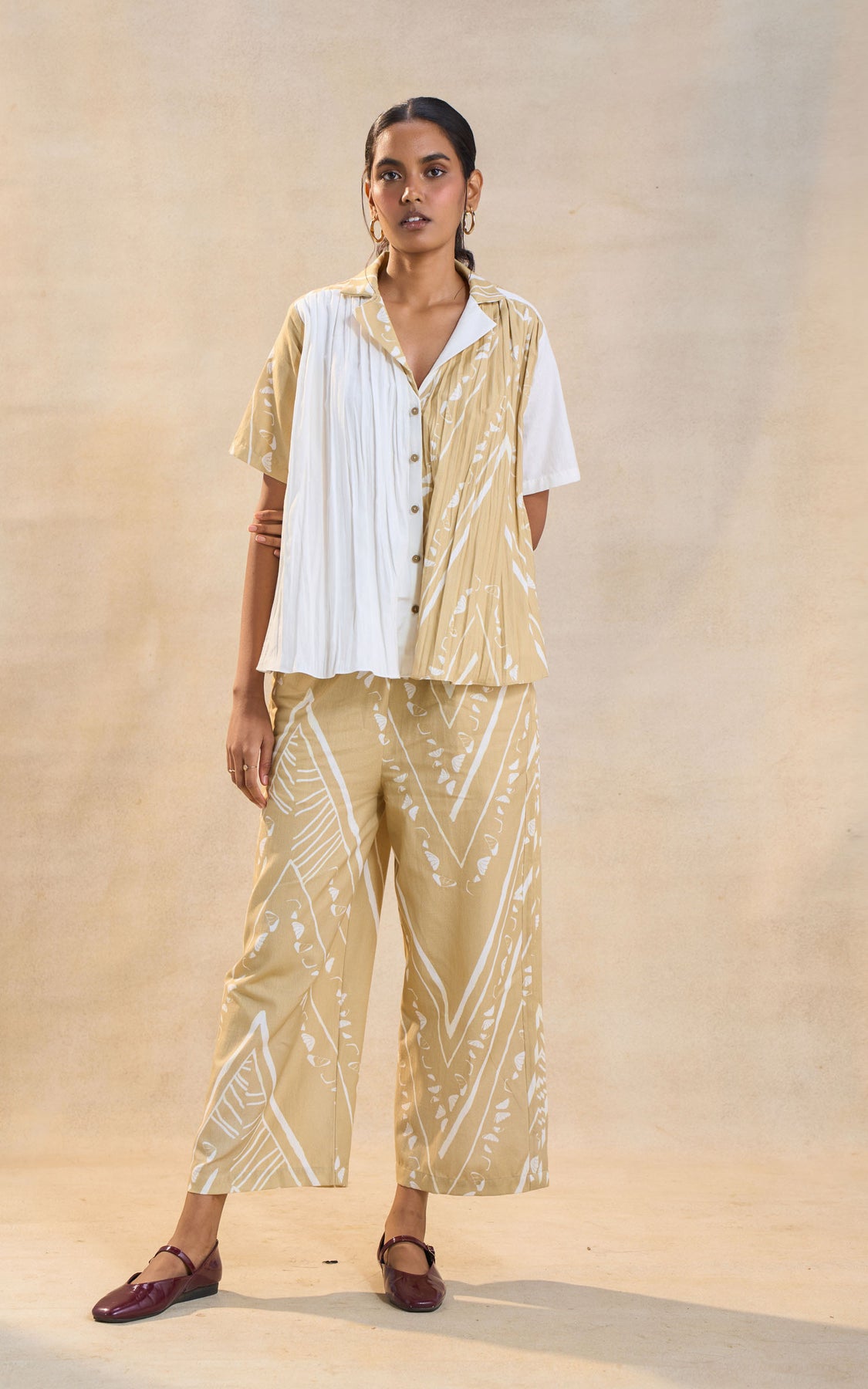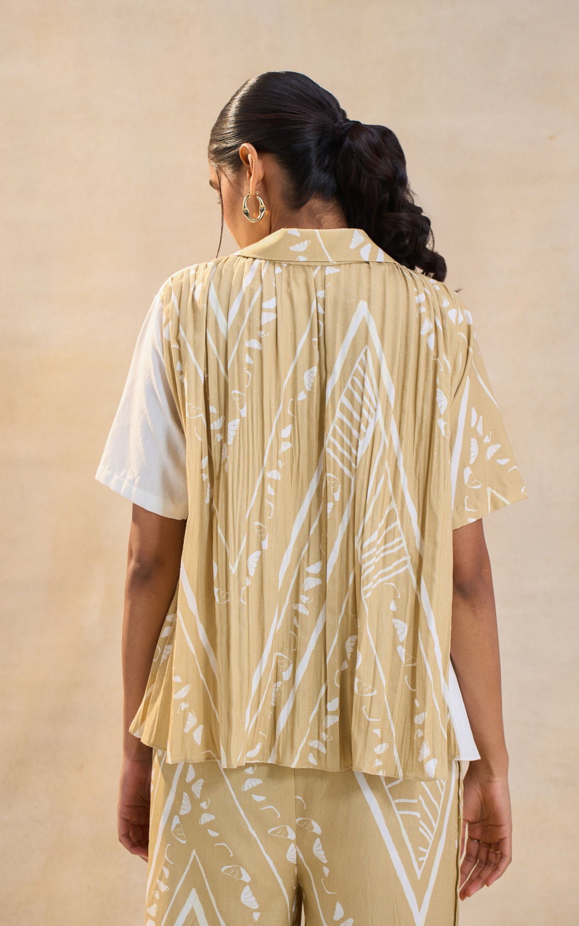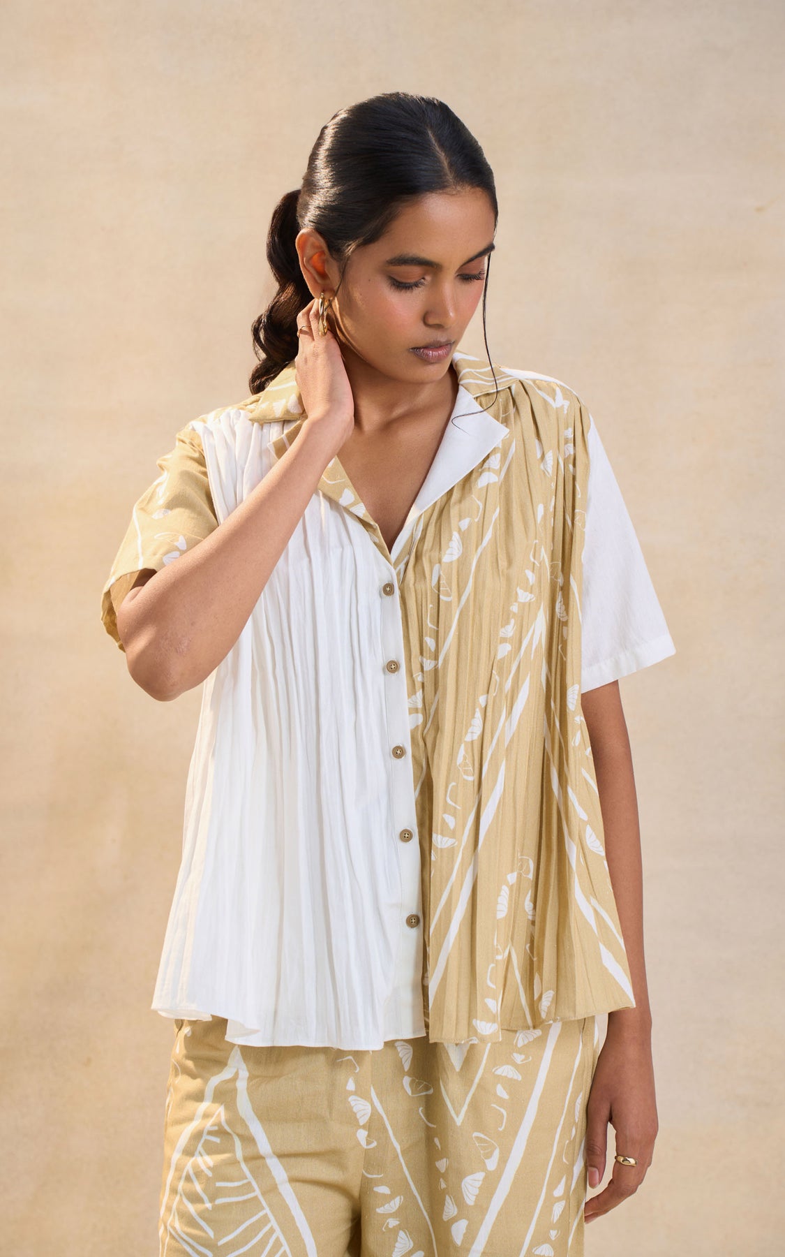 Sea shell inspired abstract printed half n half A- line pleated shirt set.
