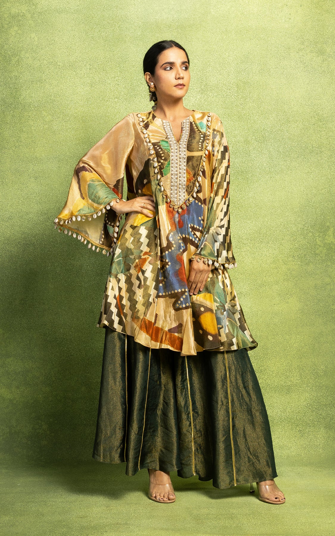 V-Neck abstract print kurta set comes with a hand embroidered neckline with shell details and a flared style sleeve.