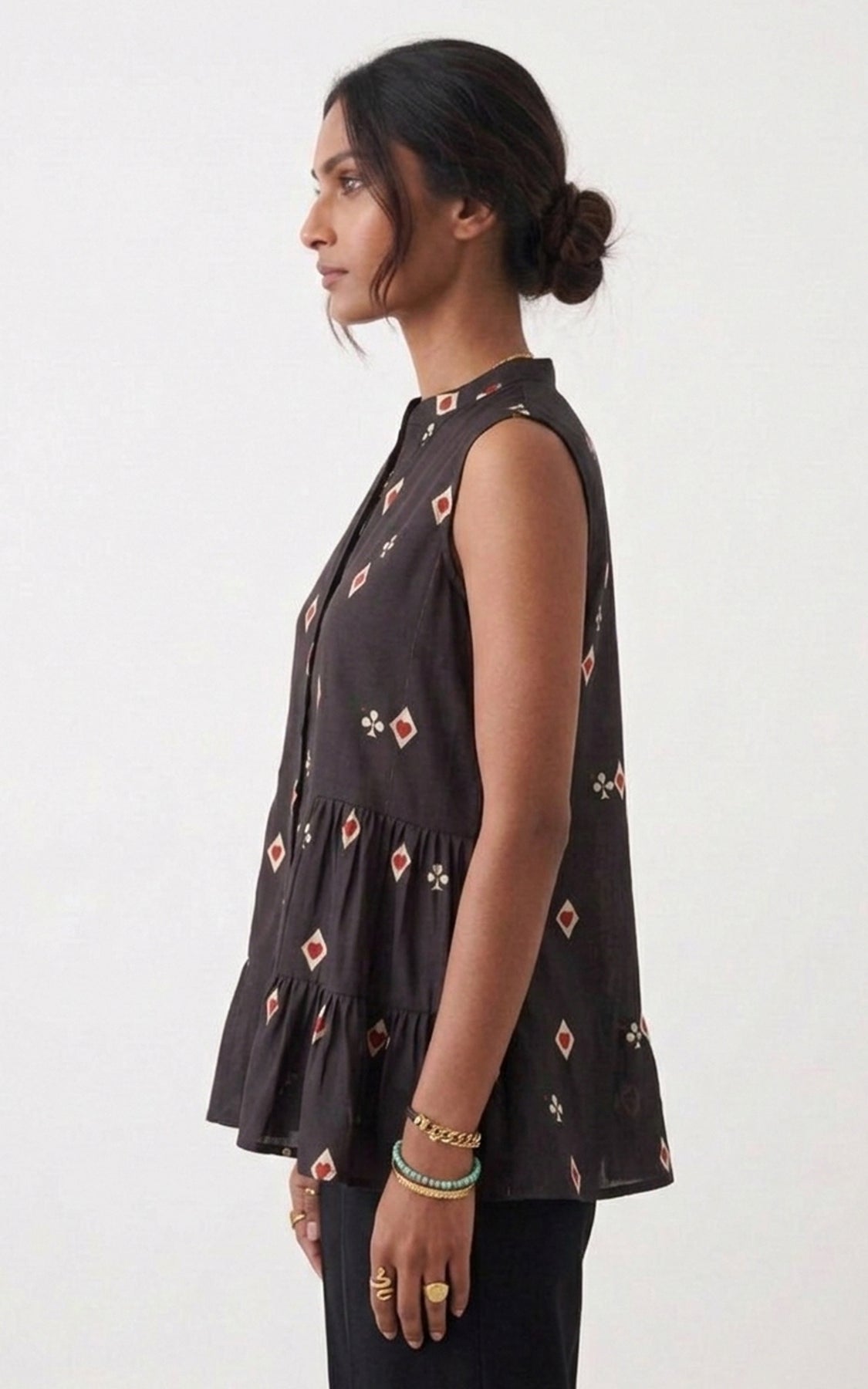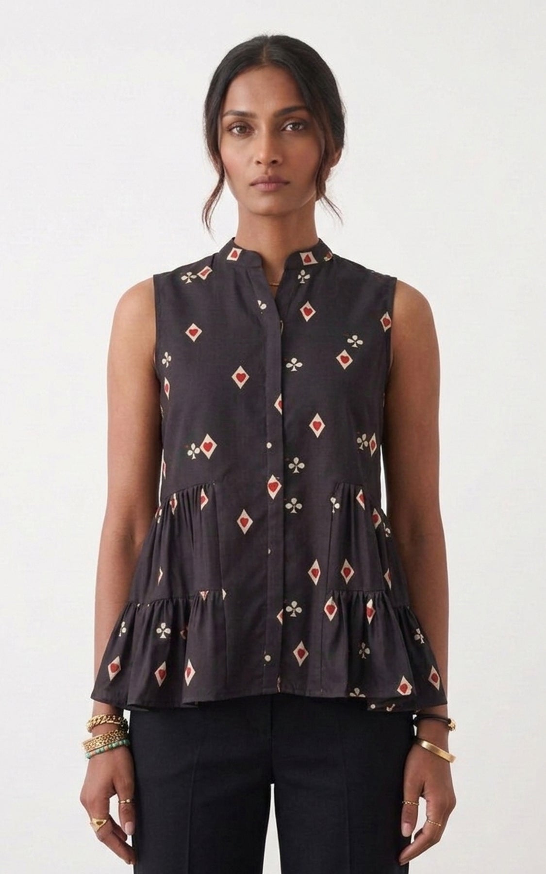 Black printed sleeveless tiered shirt