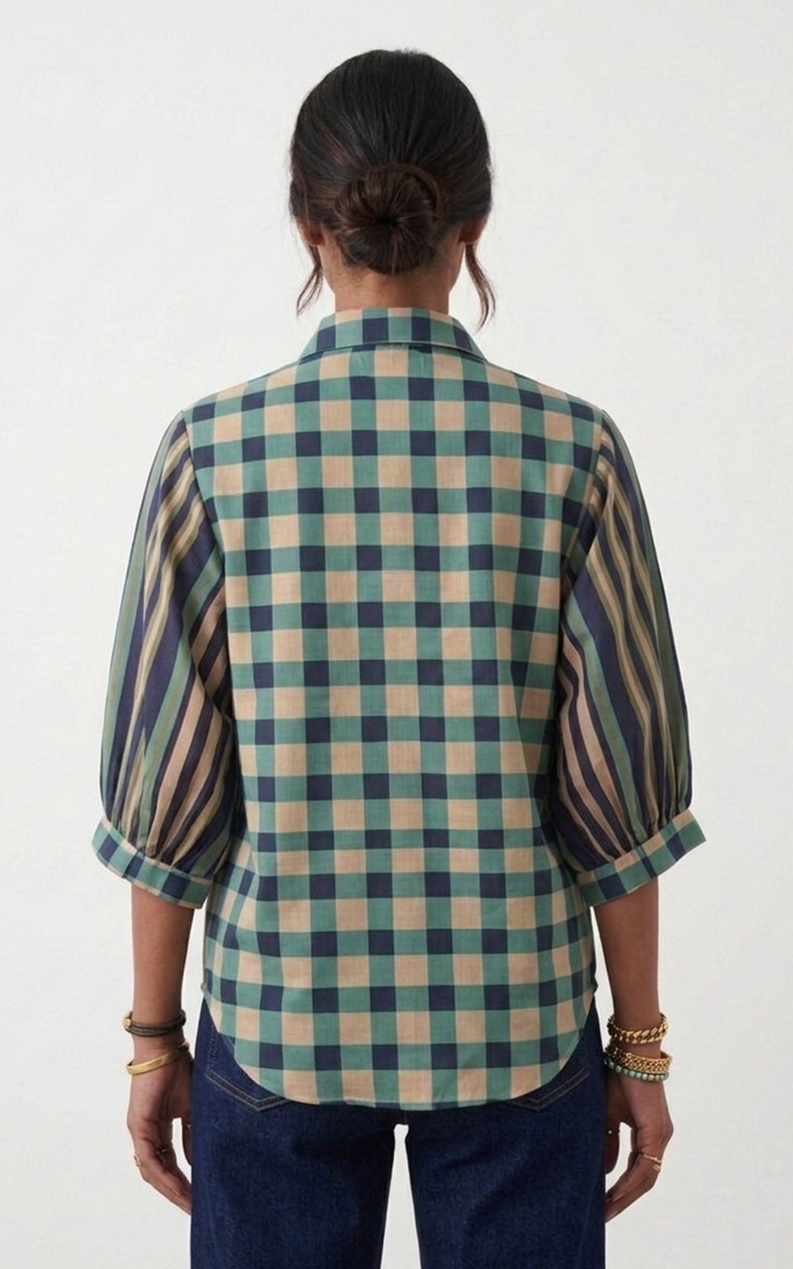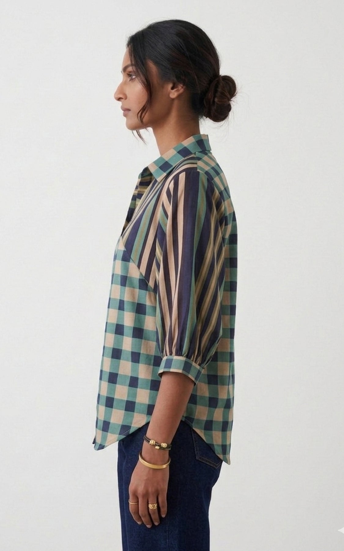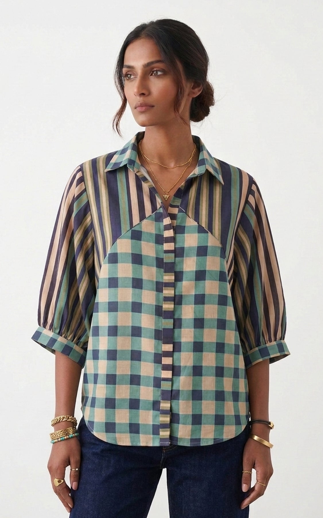 Blue checks & stripe printed shirt, featuring corded panel and a classic shirt collar with a curved hem for a casual-chic styling.