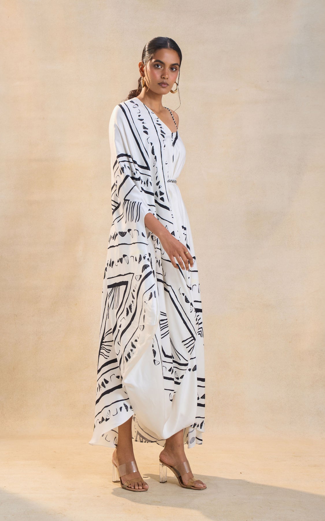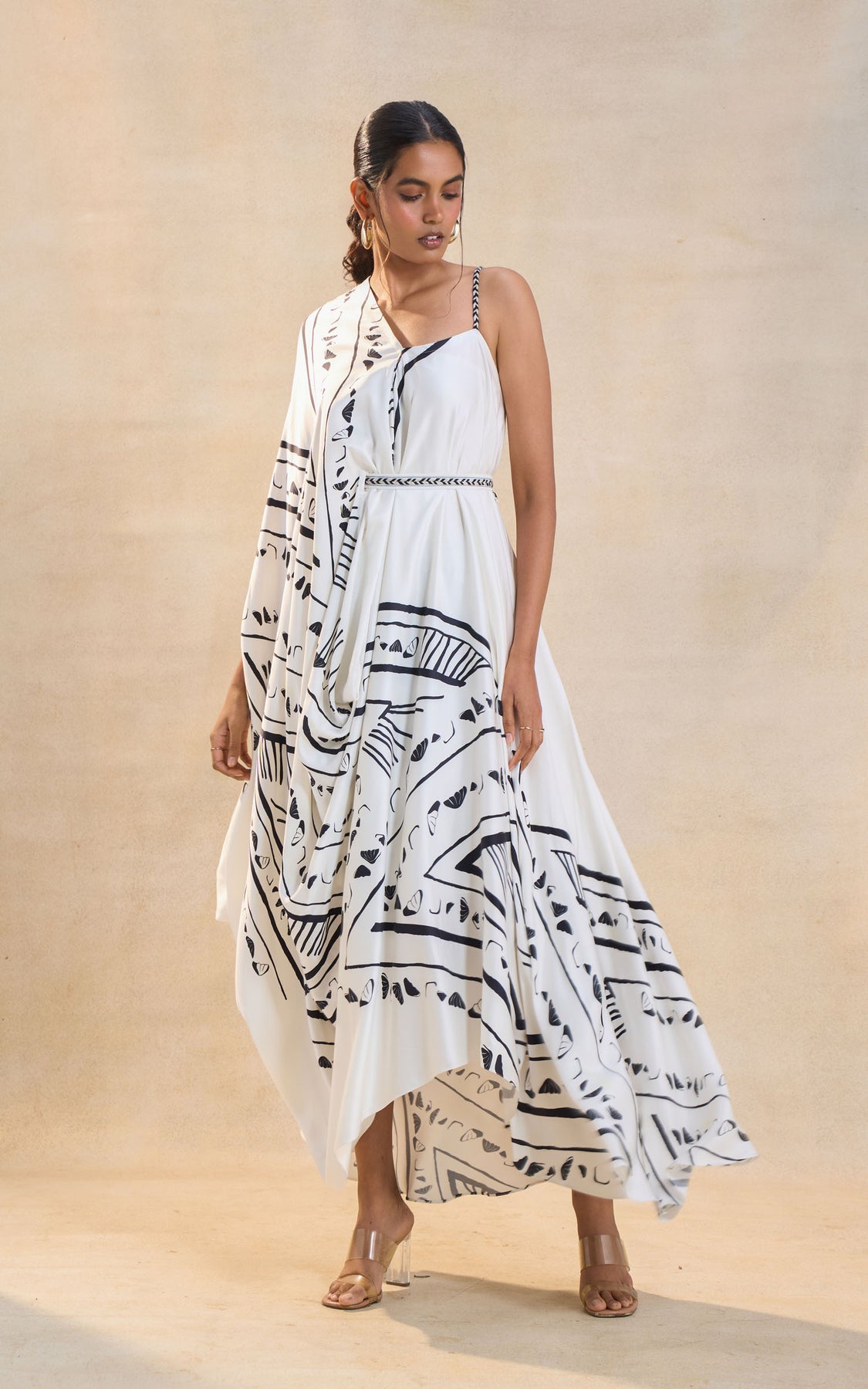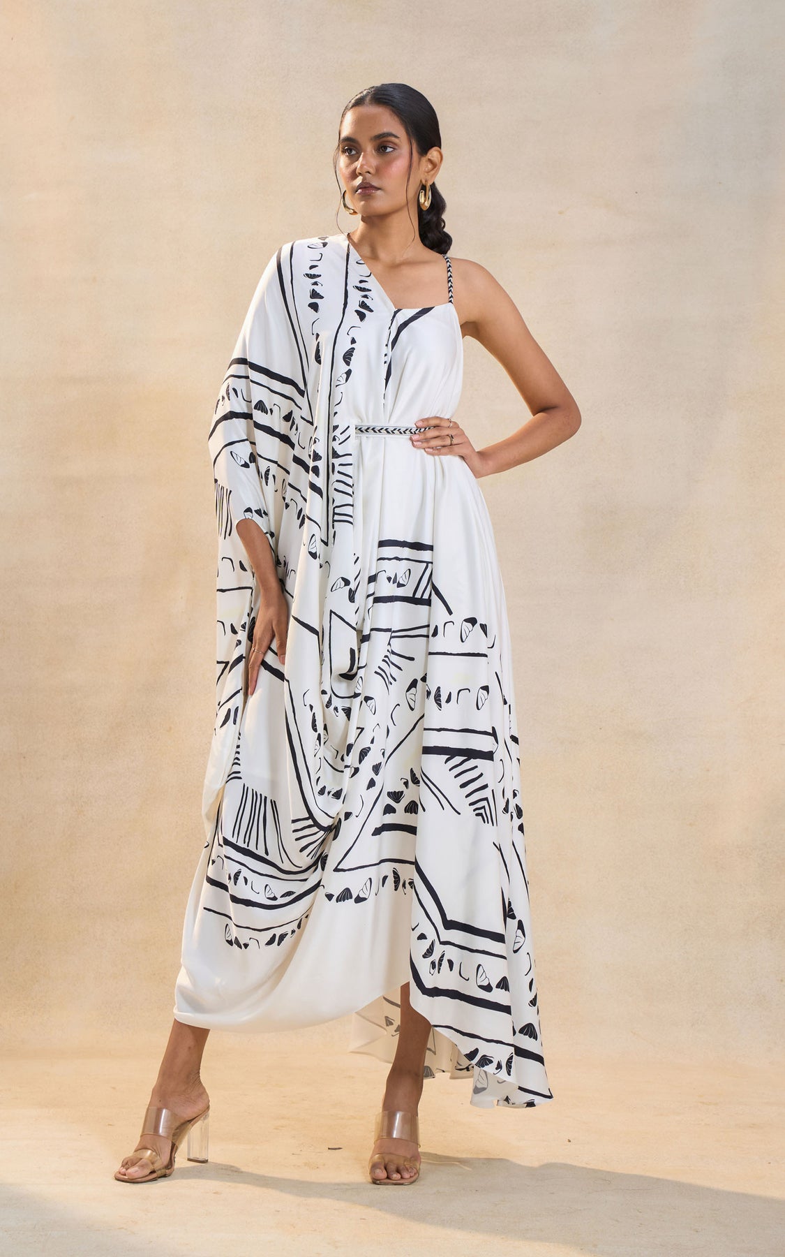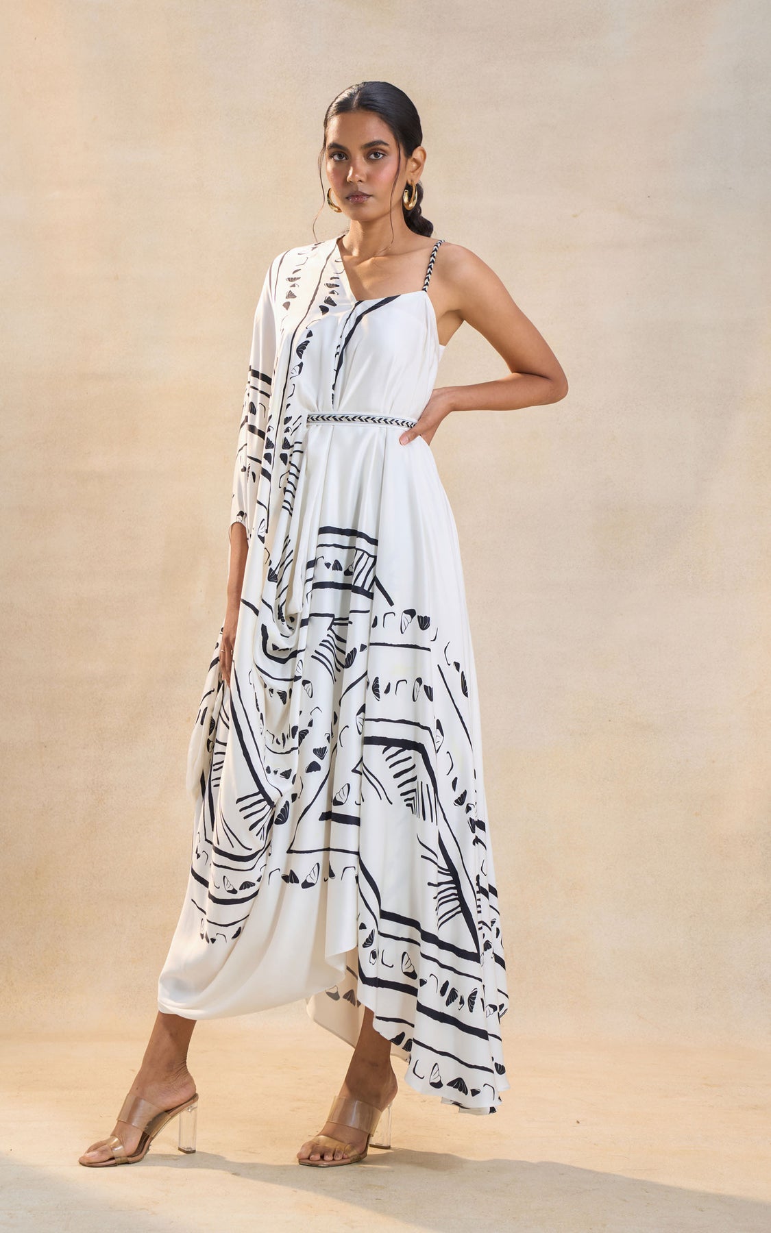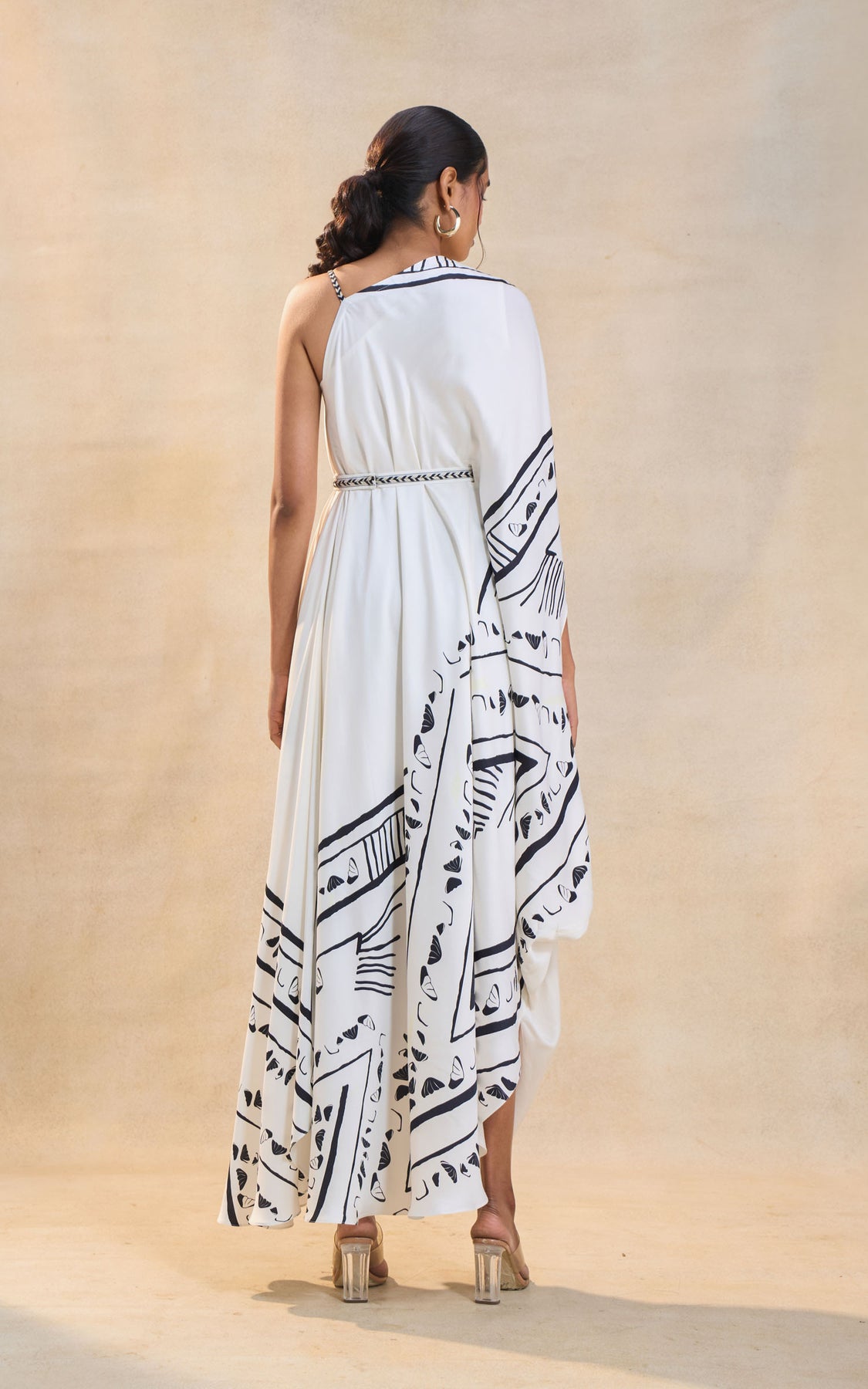 Sea shell inspired abstract printed asymmetric V neck drape in black & white. The drape comes with a belt detailed with jute borders. It is a half belt concept where the belt cinches on one side of the waist. This drape is a flowy style which works very well with all body types.