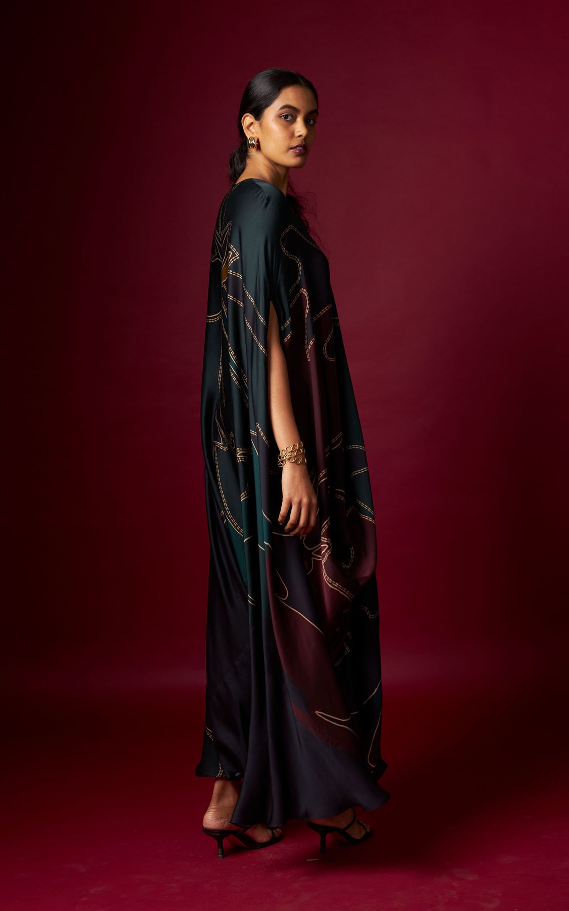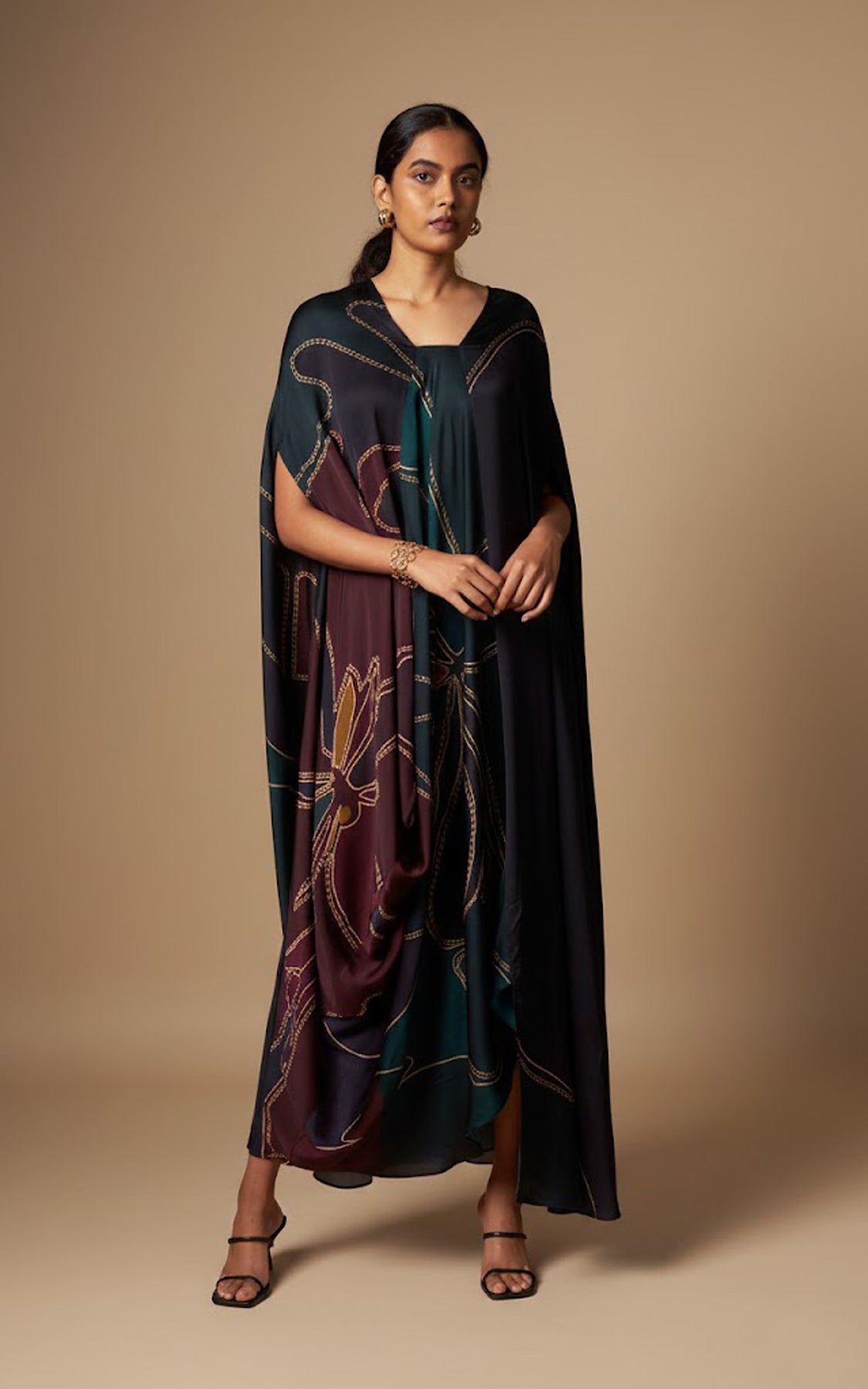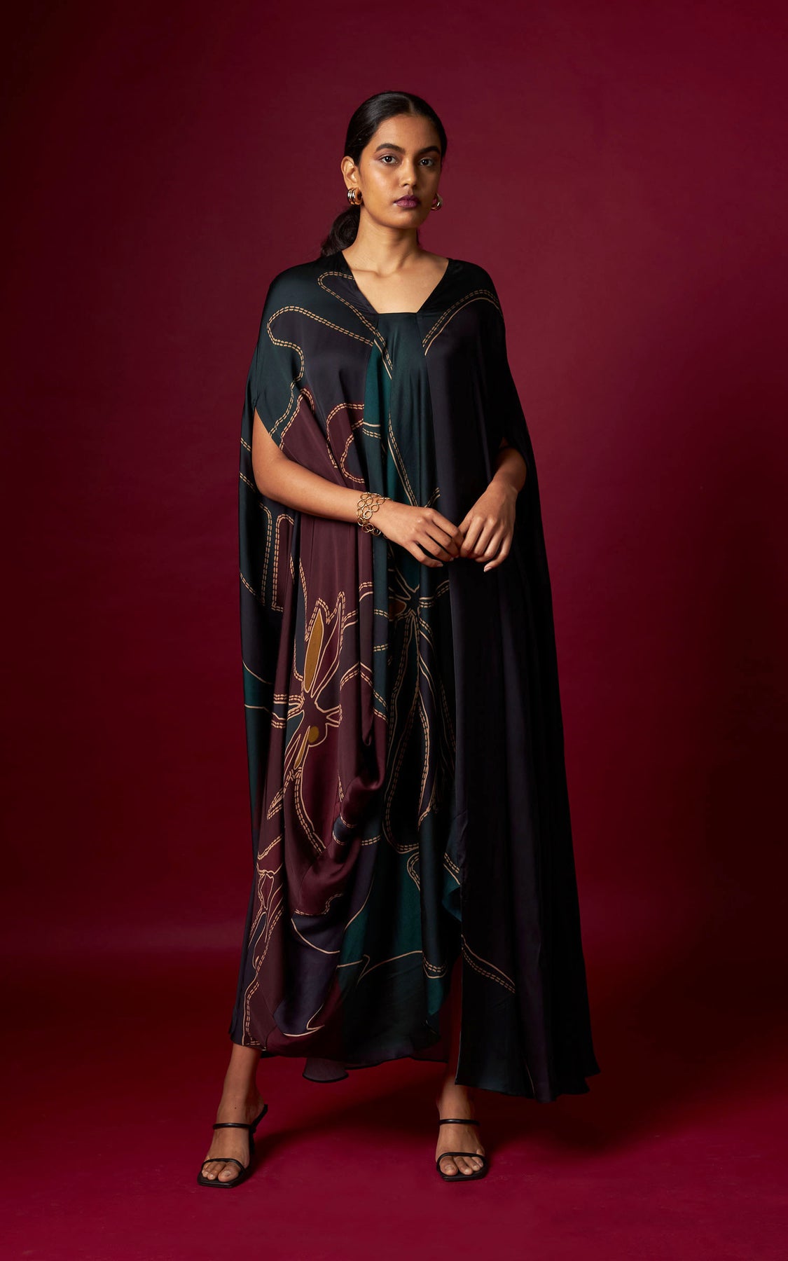 An abstract printed kaftan-style drape crafted in a fluid, flowy silhouette that drapes beautifully and flatters all body types with effortless ease.