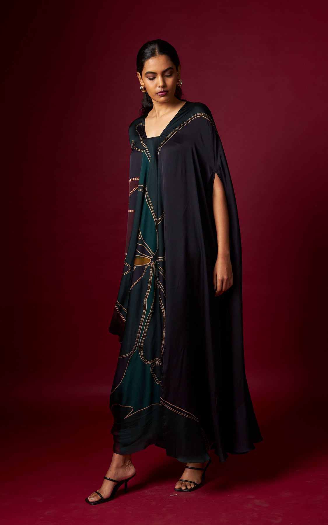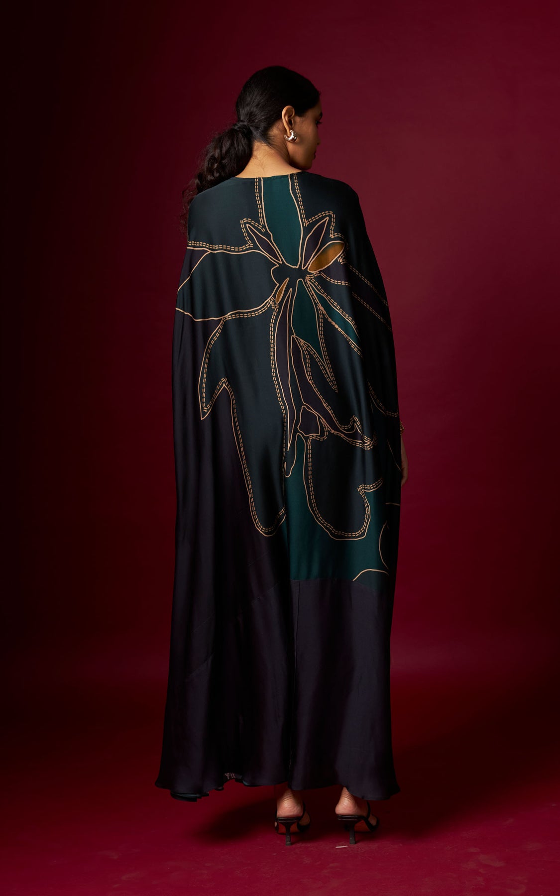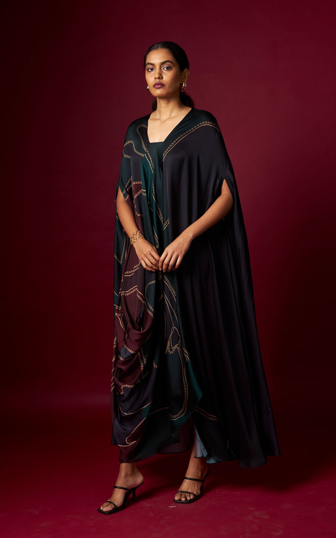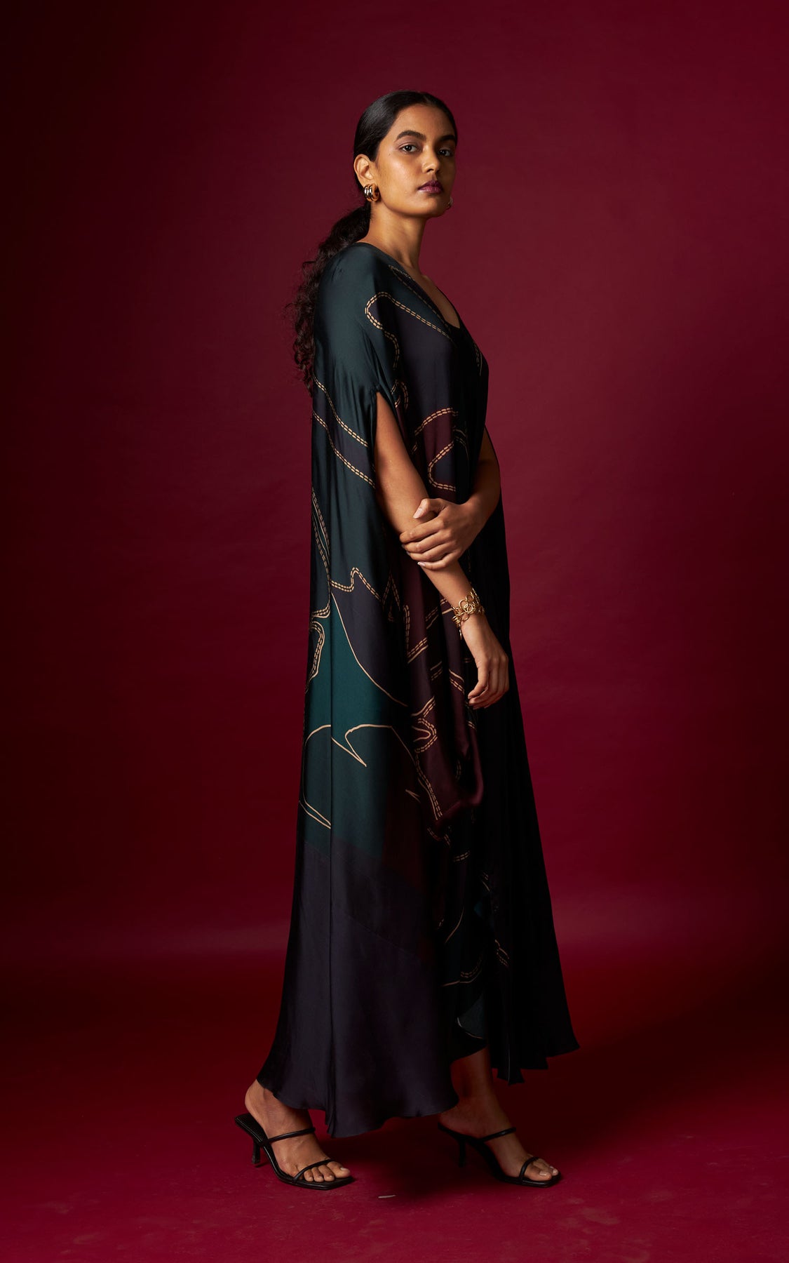 An abstract printed kaftan-style drape crafted in a fluid, flowy silhouette that drapes beautifully and flatters all body types with effortless ease.