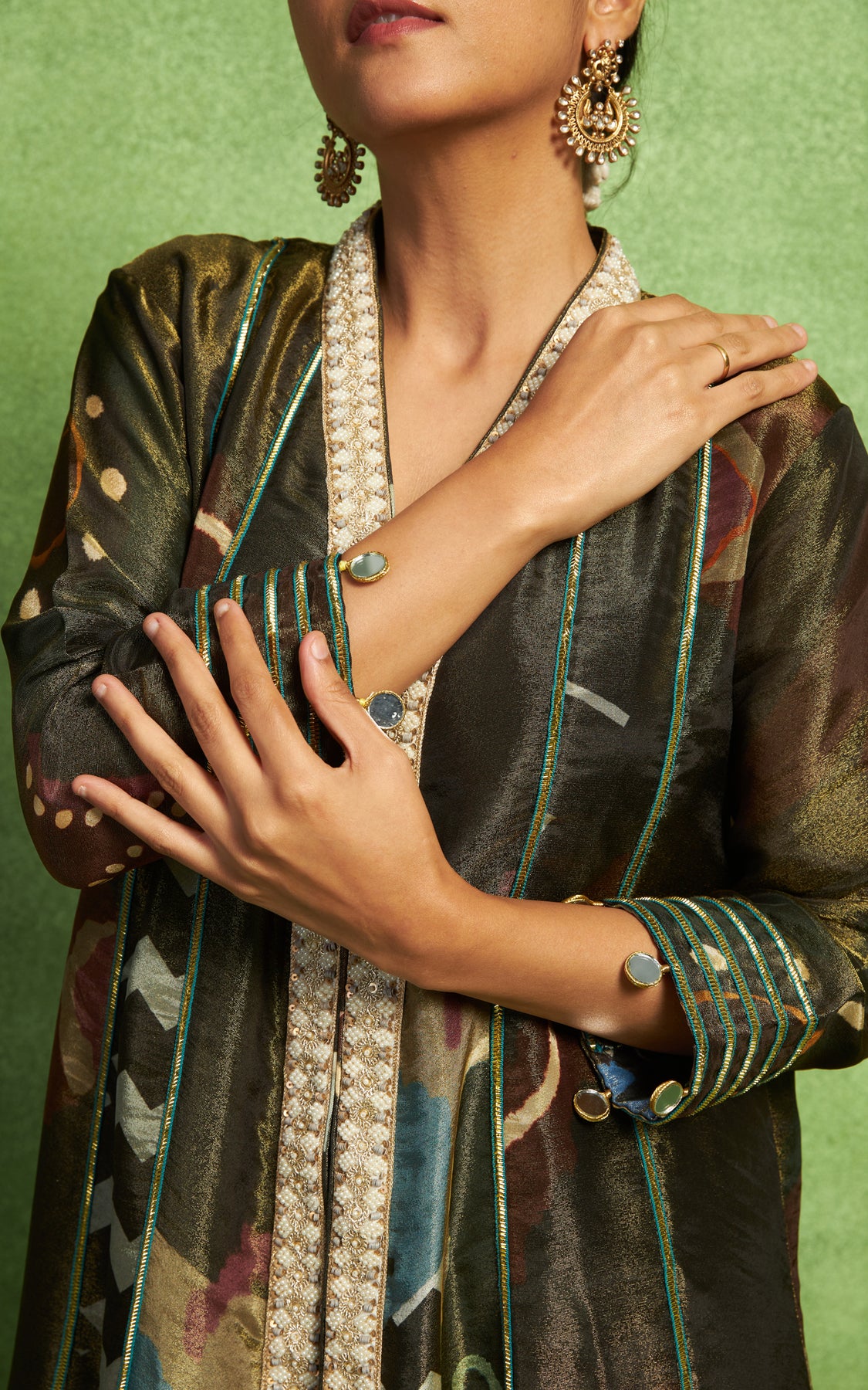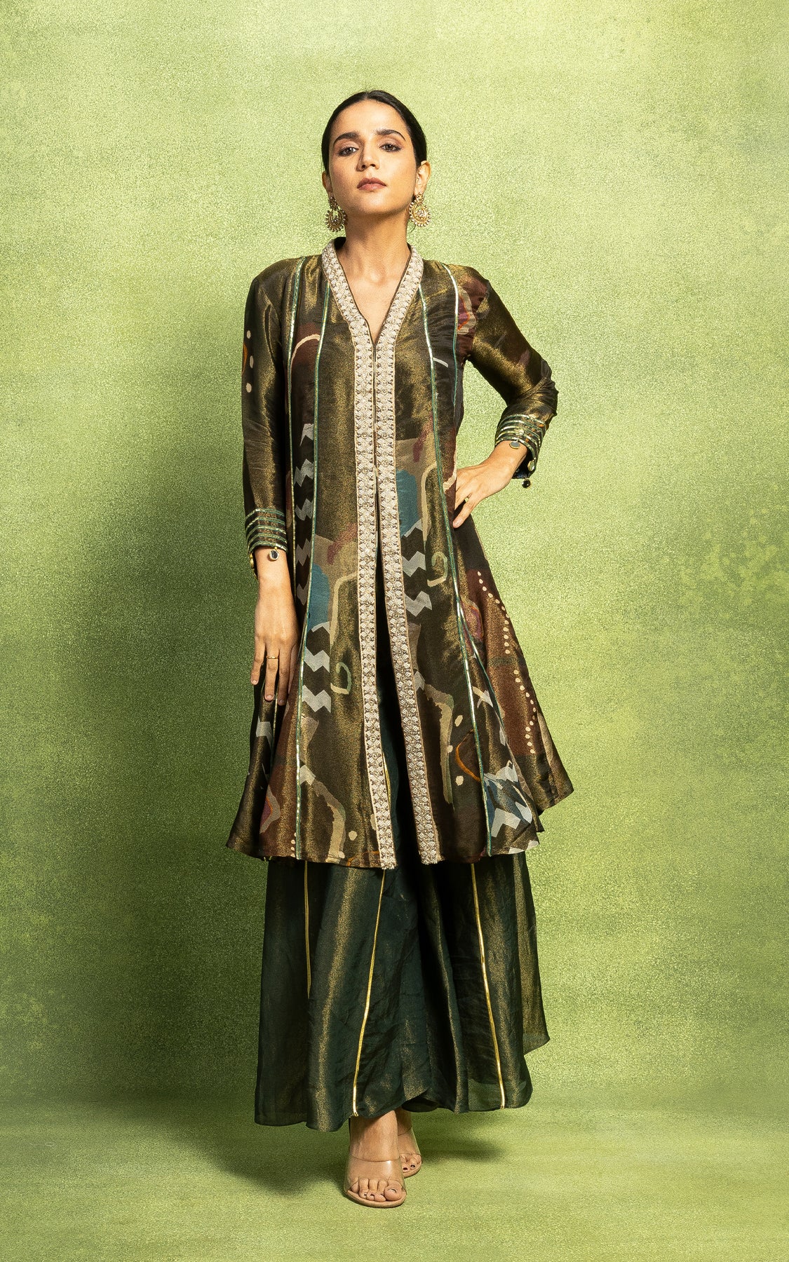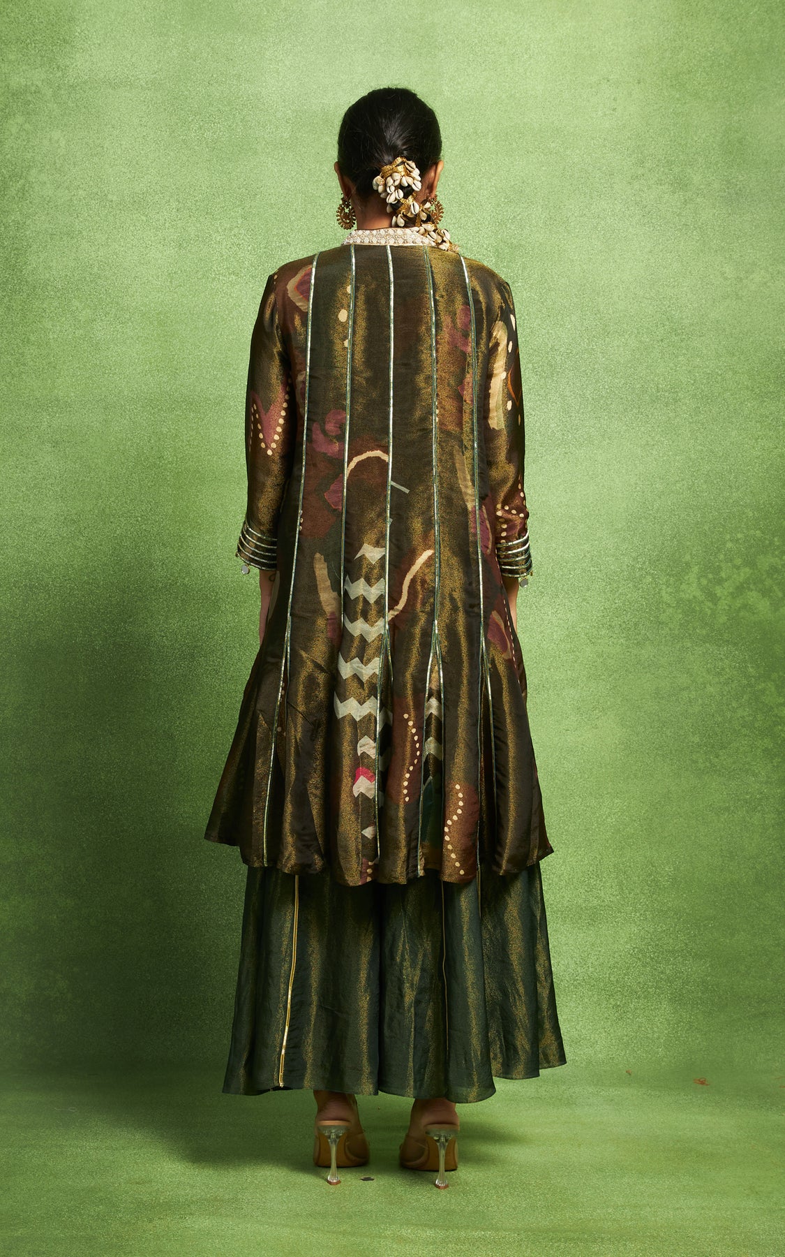 Flowy panalled kurta with hand embroidery detailing in shades of green. The sleeves also have mirror detailing at the cuff.