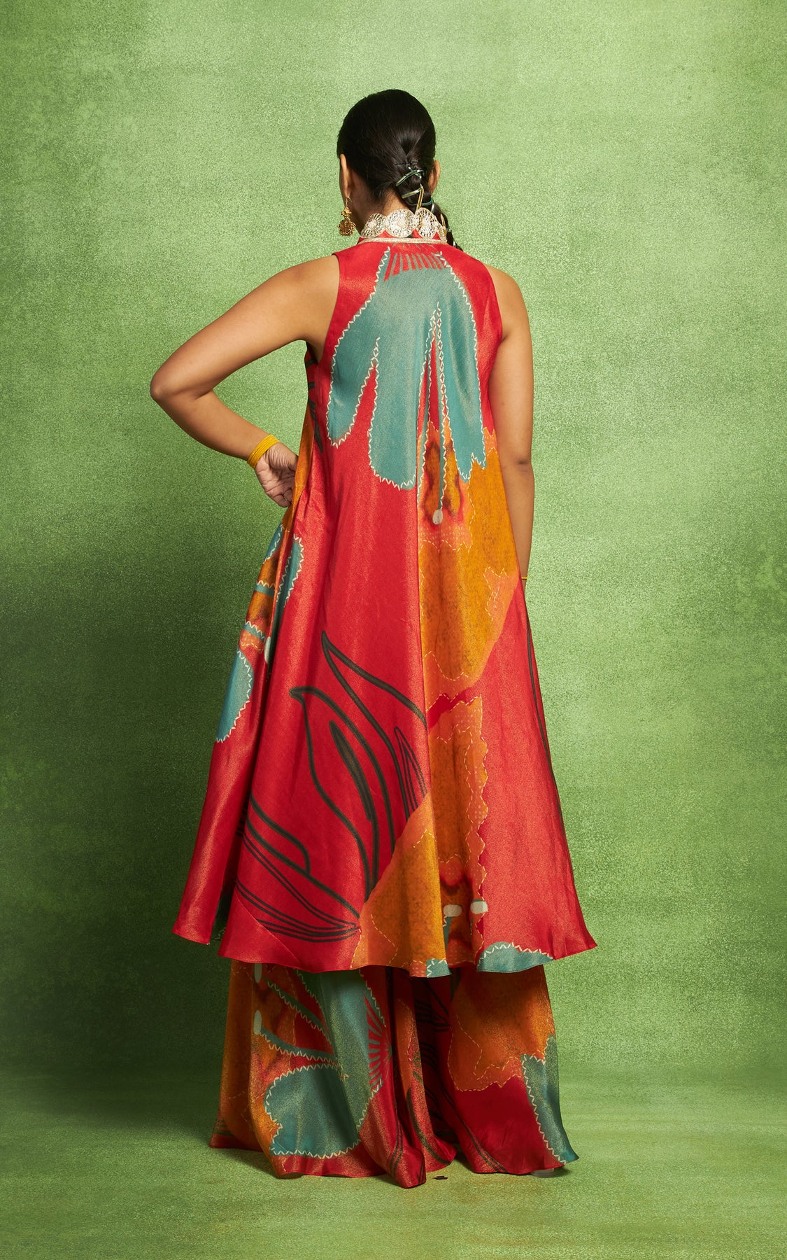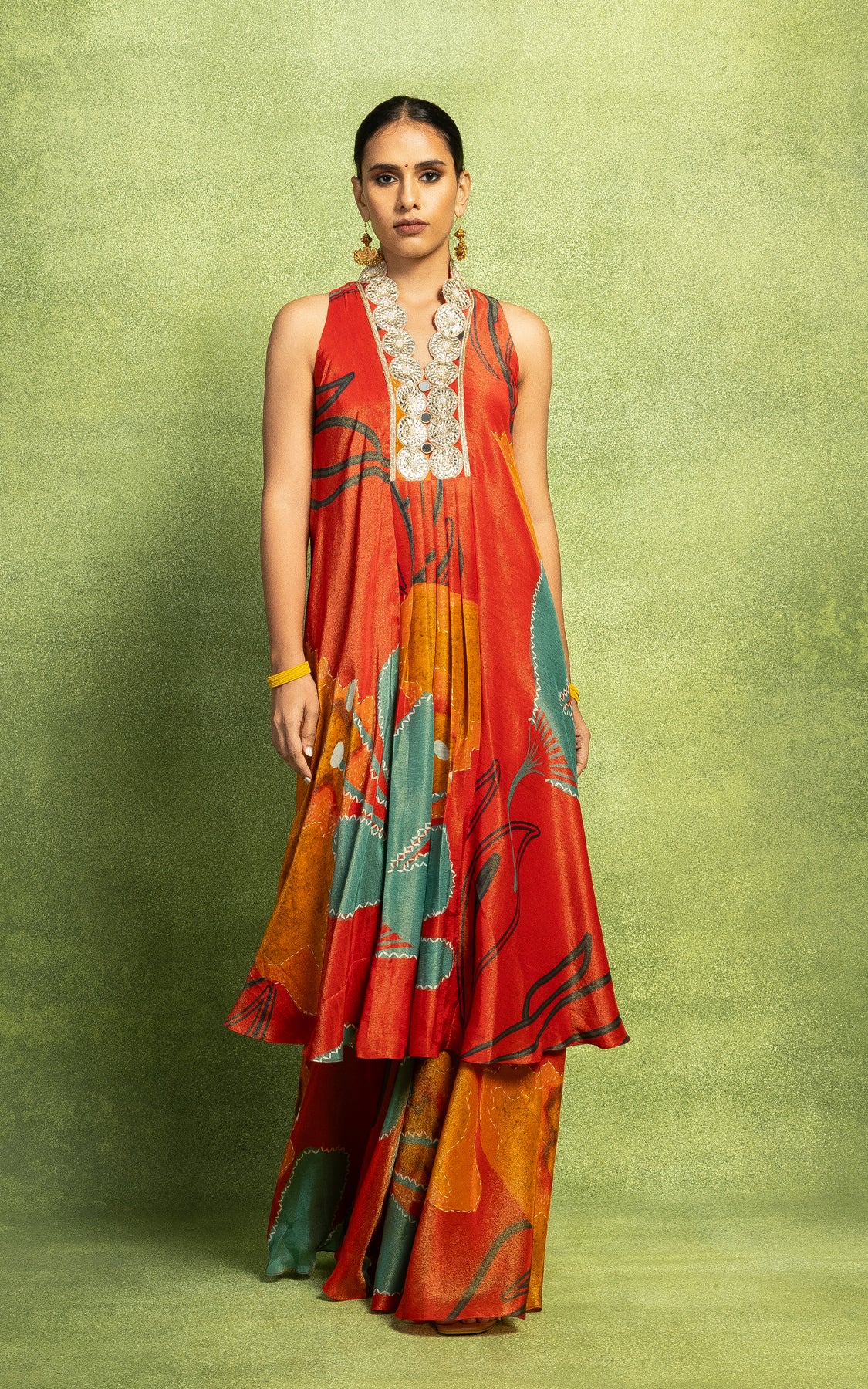 V-Neck abstract print kurta set with embroidery and mirror detailing on the neck line, this flowy kurta is paired with printed straight fit pants and comes with a printed dupatta with border detailing and mirror work.