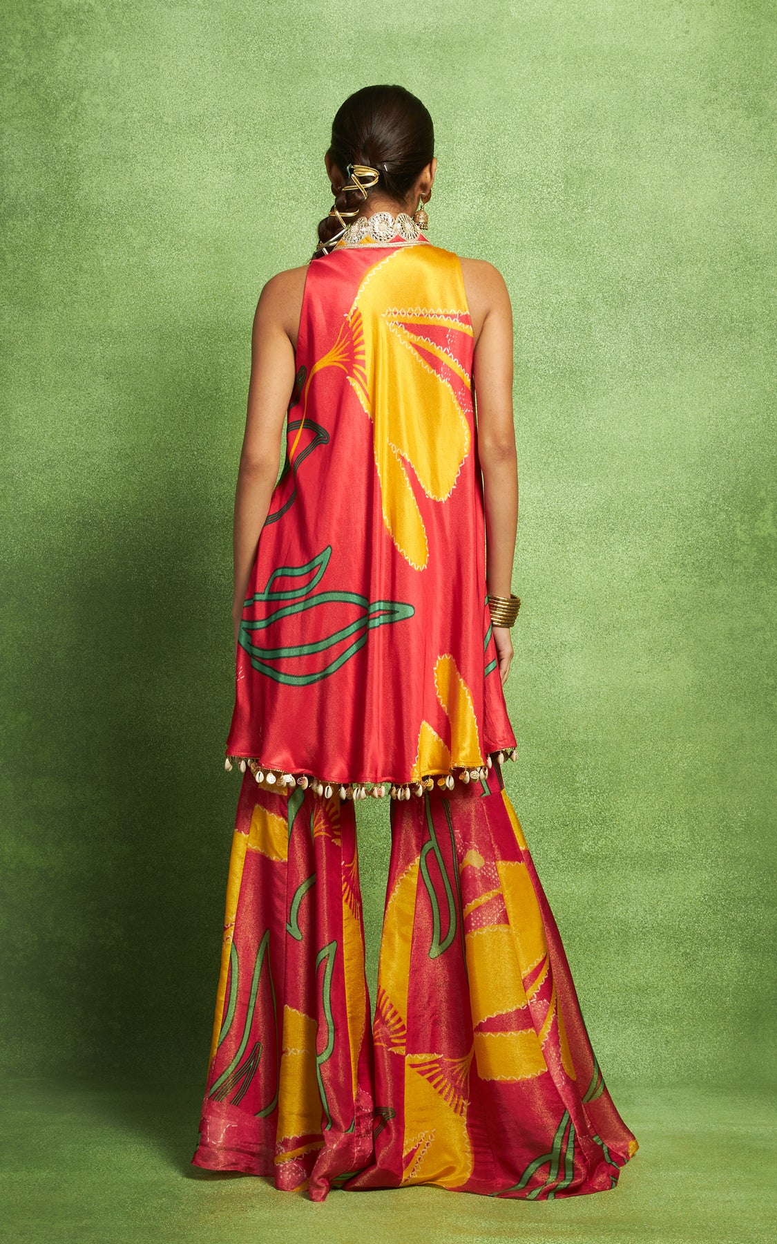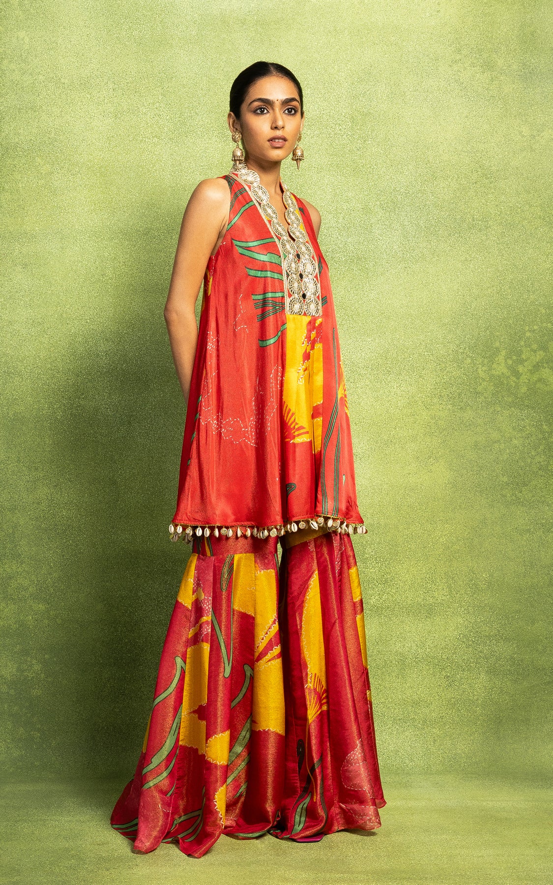 V-Neck abstract floral print short kurta set with embroidery and mirror detailing on the neck line and shell details on the hemline, this kurta is paired with printed sharara pants.