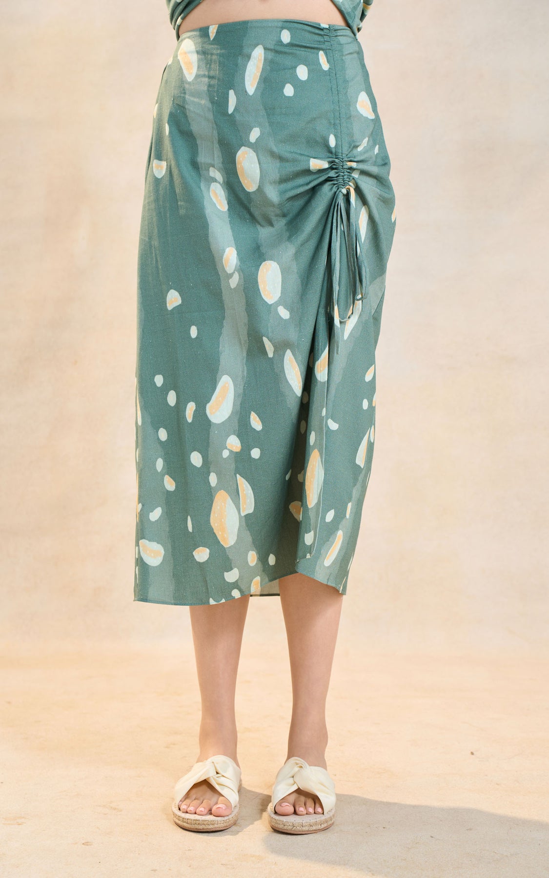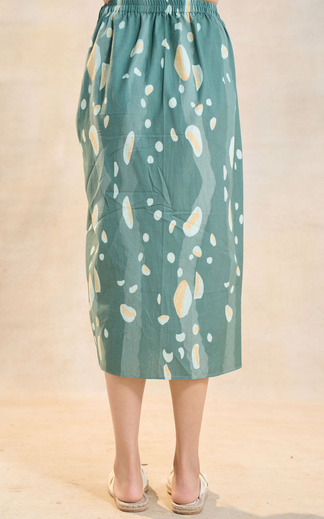Green water effect inspired abstract printed drawstring skirt. The skirt comes with a elastic at the back of the waist band.