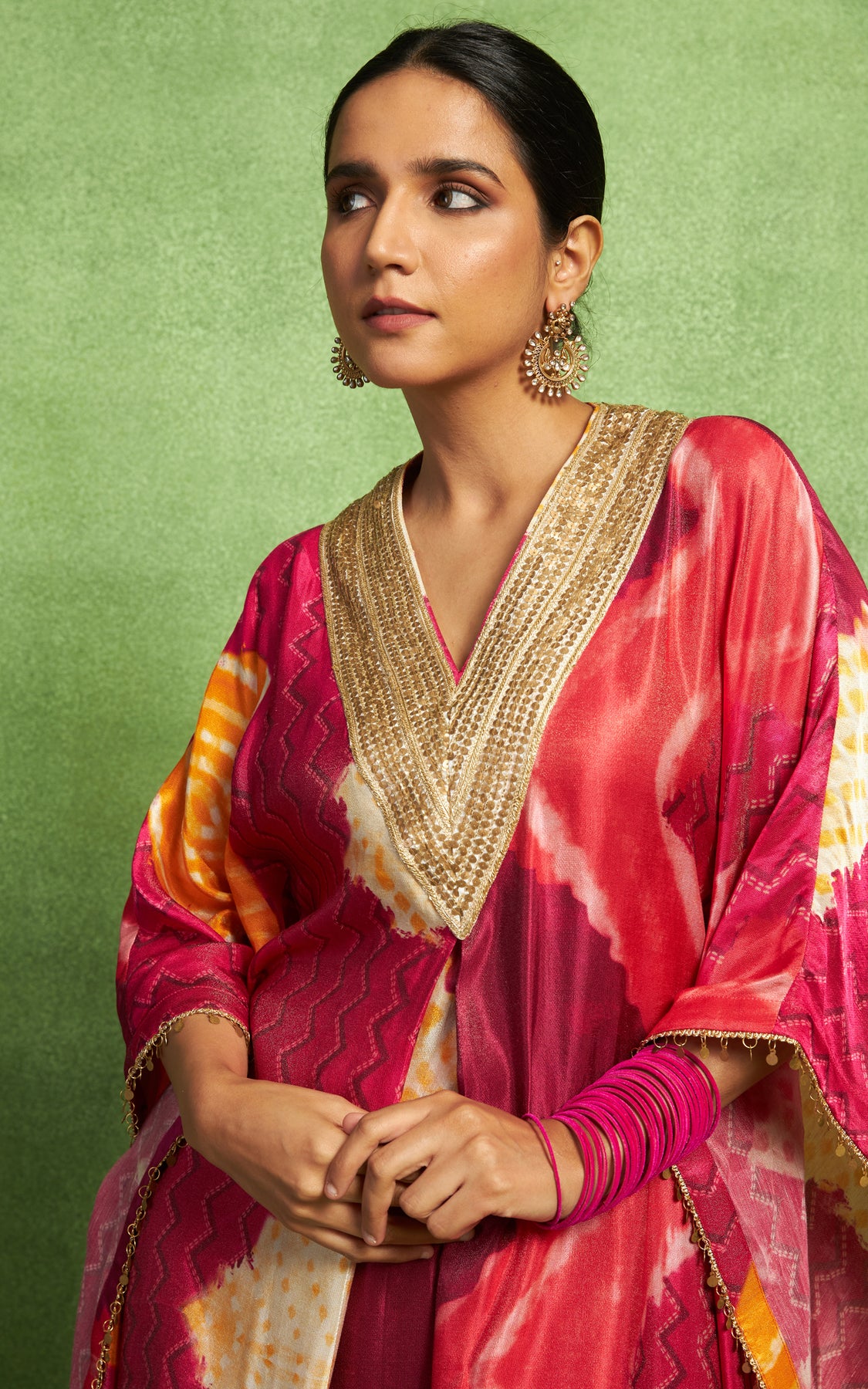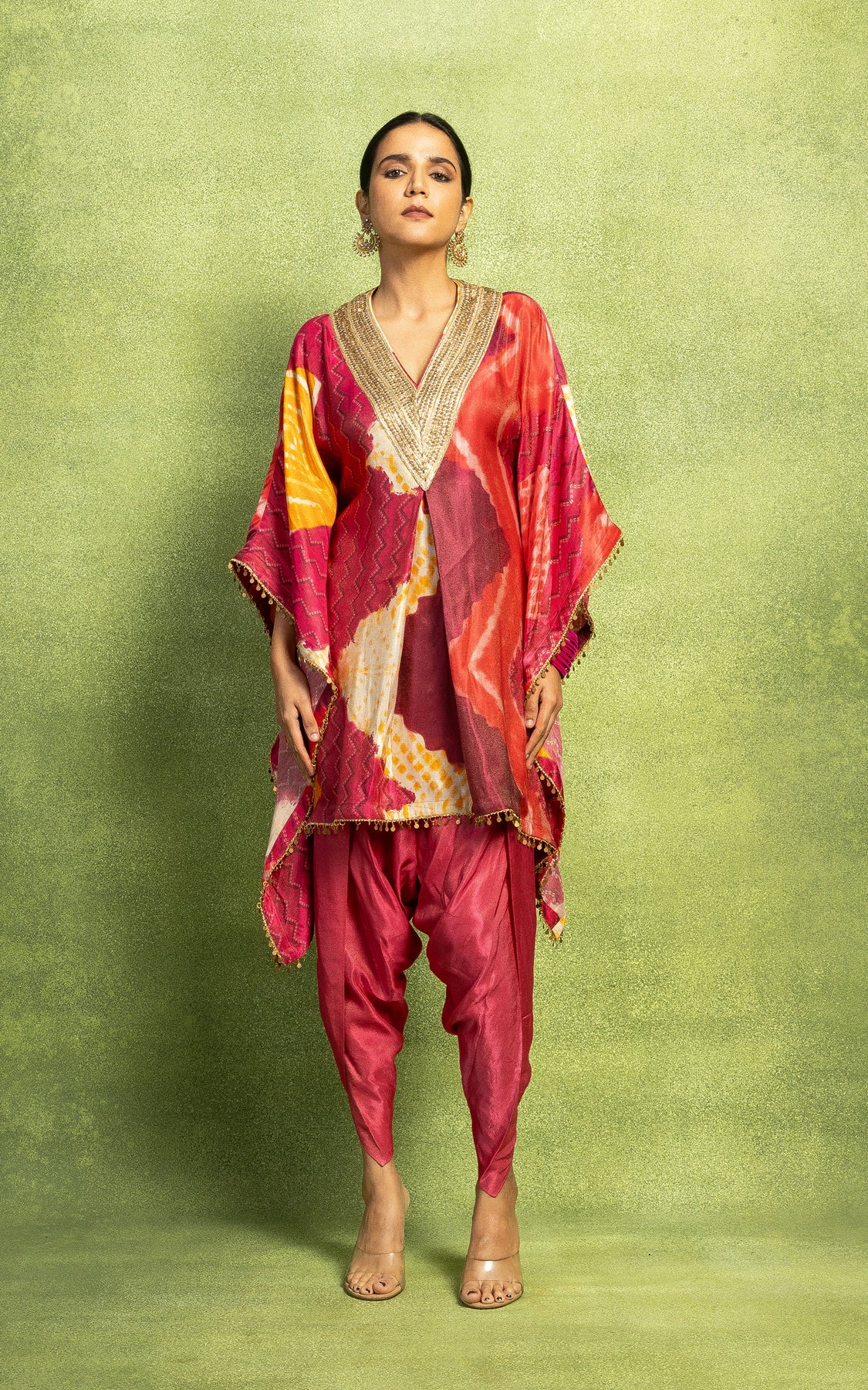 The abstract print V-neck kaftan top comes with a detailed hand embroidered neckline along with hanging embroidery details across the hemline and sleeves. The pant showcases a draped dhoti style fit which enhances the look of the set.